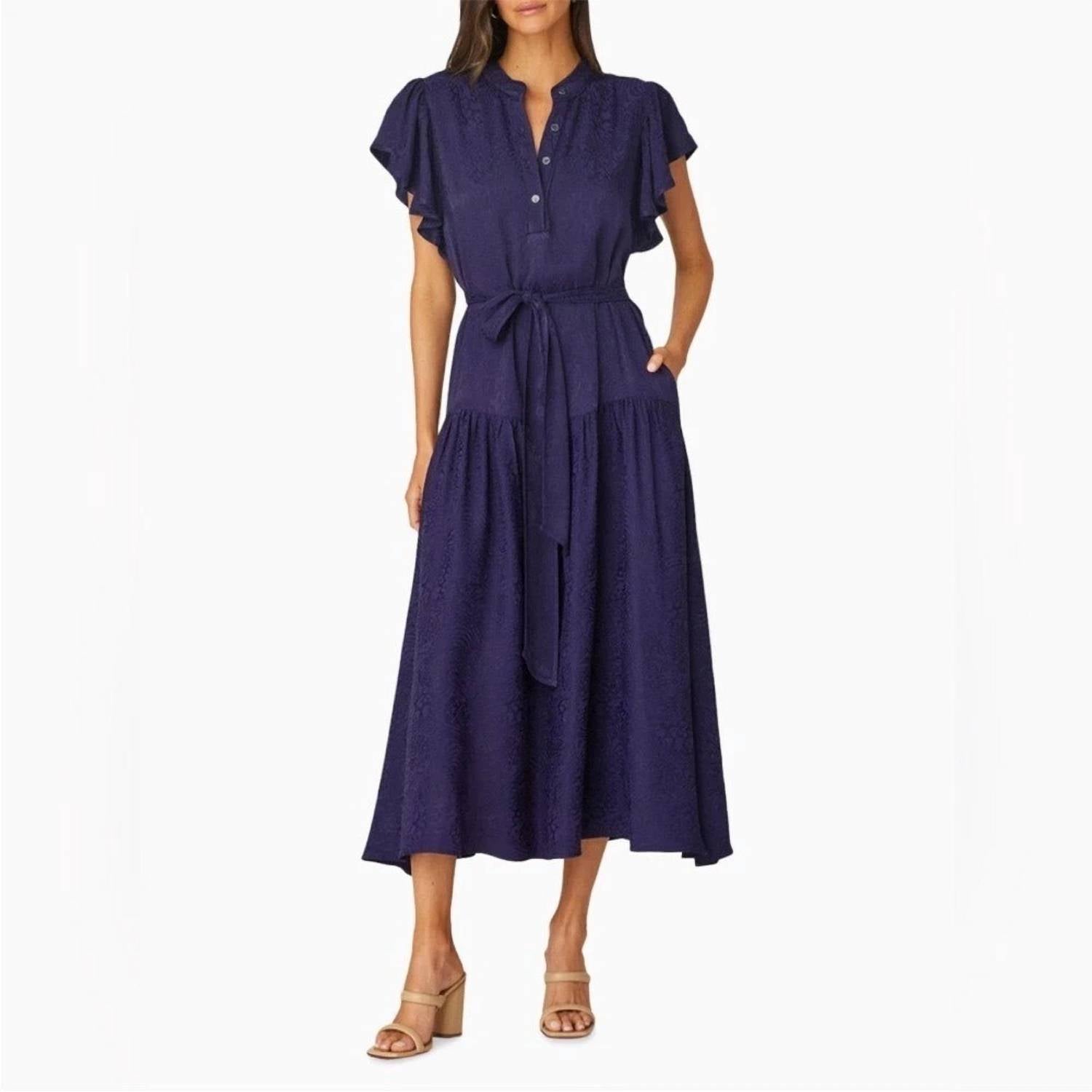 Just add slides or mules and you are good to go. The Lucia Dress by Shoshanna is a sophisticated choice for your next holiday party, crafted from 100% Viscose in a textured navy design. This women's midi dress features a chic A-line silhouette with a collar neckline and cap sleeves. Functional pockets add practicality, while the button closure provides a classic touch. For care, dry clean only to maintain its preppy charm.