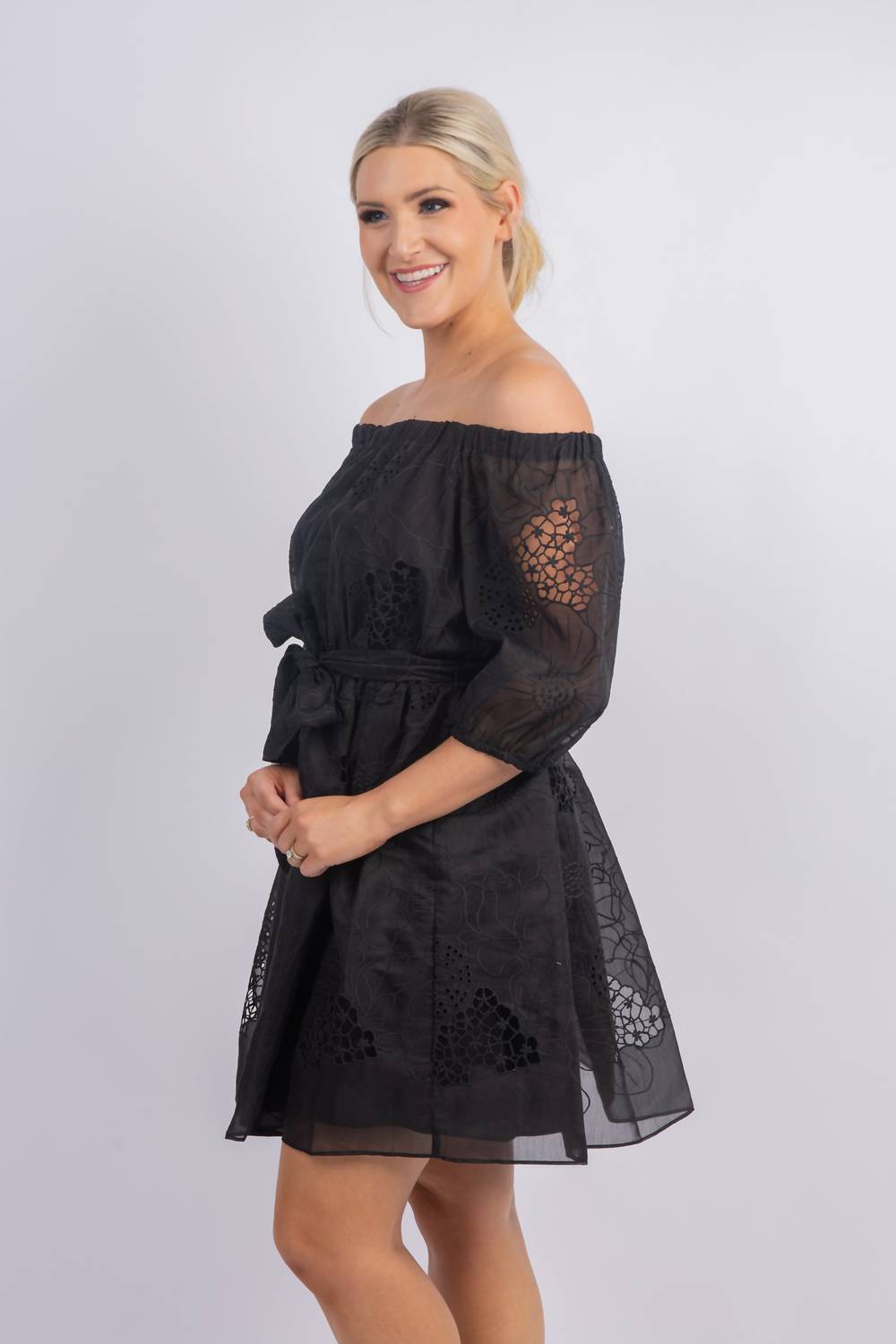 The perfect mini dress for those warmer months. Indulge in effortless playfulness with this beautifully detailed dress, featuring eye-catching floral embroidery and flirty cutout accents. The off-the-shoulder neckline pairs perfectly with blouson sleeves finished with elasticized cuffs, while a self-tie at the waist defines the figure and enhances the flattering A-line silhouette. Crafted from a soft yet durable linen–cotton–polyester blend, it offers breathable comfort with lasting structure—perfect for standing out at any occasion.