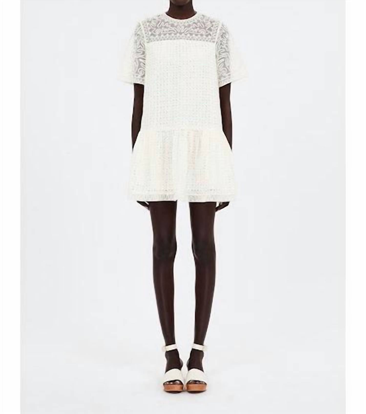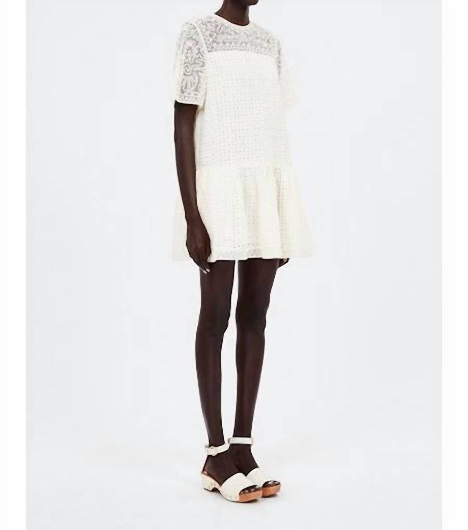 A short and breezy dress for those warmer days. Elevate your summer wardrobe with the Gabi Mini Dress by Ulla Johnson, a showstopper in a charming shift silhouette. This short-sleeve ivory dress features a stunning combination of a tulle yoke with gestural embroidery and a cotton voile bodice and skirt adorned with geometric eyelets, offering a boho chic appeal. Crafted as a cotton blend with a convenient back buttoned keyhole closure, this dress combines style with practicality. Composition: 78% Cotton, 22% Viscose. Care: Dry clean only.