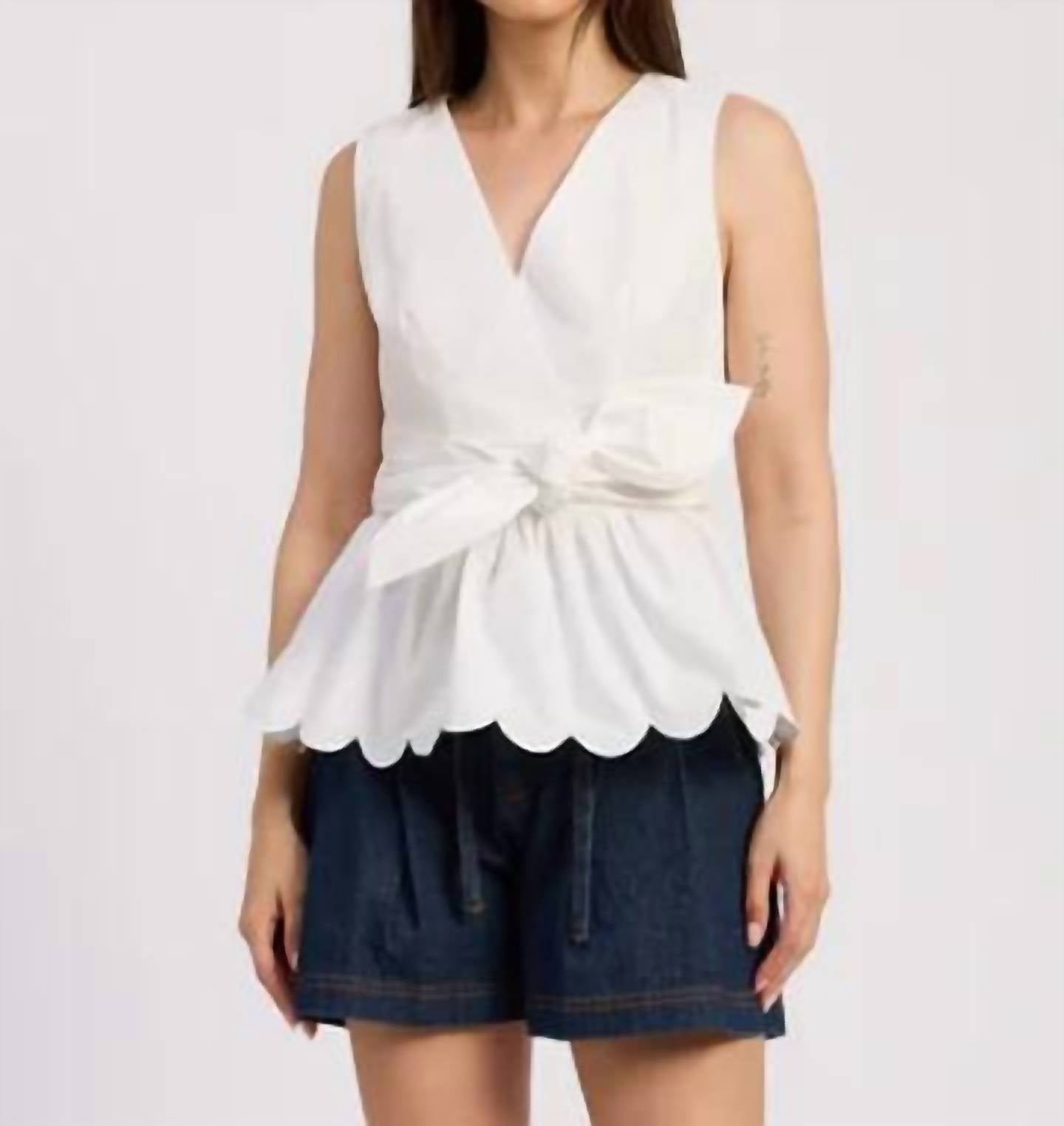 Pair this with your favorite jeans and slides for your next girls night out. 100% Cotton, Sleeveless Surplice, Tie Front, Scallop Hem