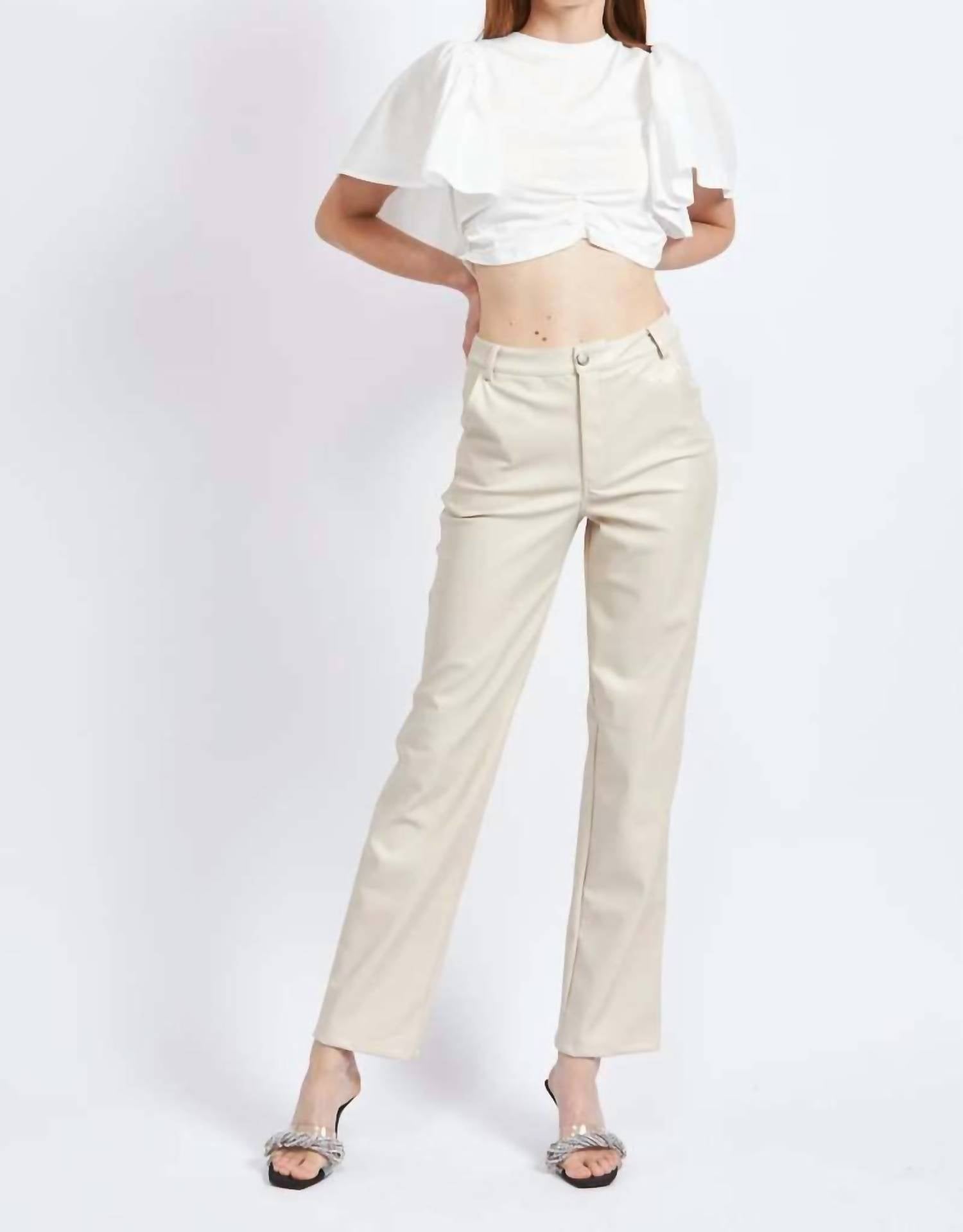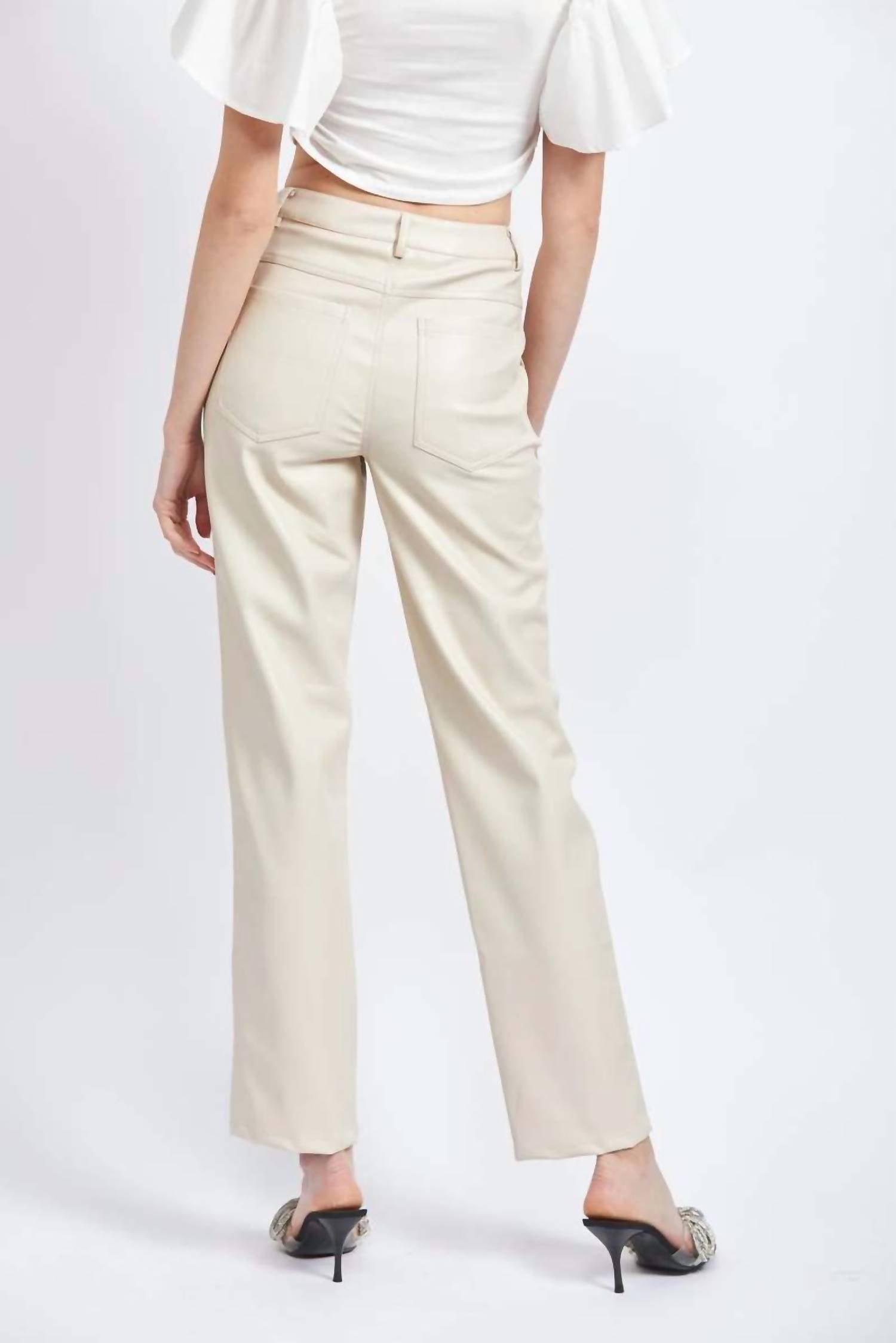 Introducing the En Saison Vegan Leather Pants, the ultimate blend of style and sustainability. These women's straight leg pants are crafted from 50% polyurethane and 50% polyester, making them both durable and cruelty-free. In a sleek off-white color, they feature a convenient zip closure and practical pockets. Designed with a high rise for a flattering fit, these pants require hand washing to maintain their pristine appearance.