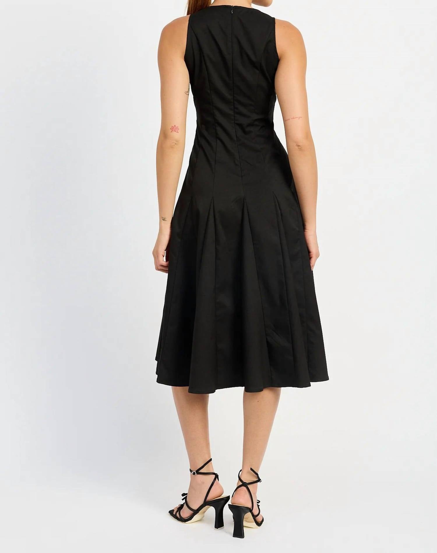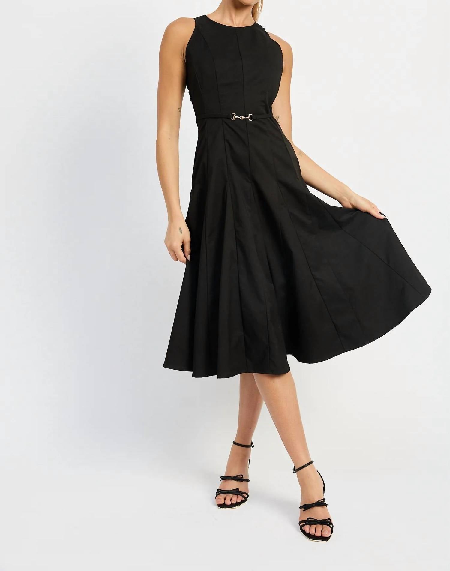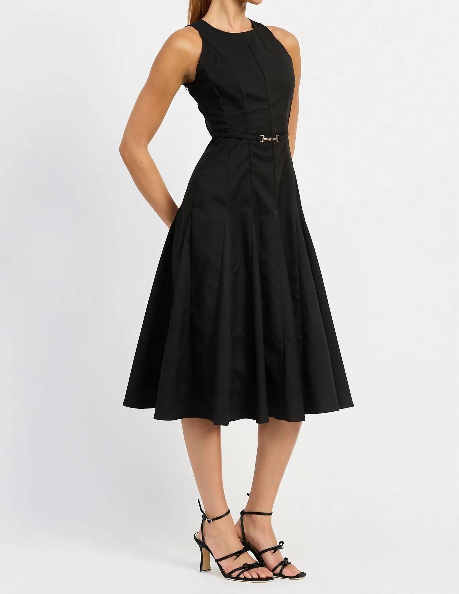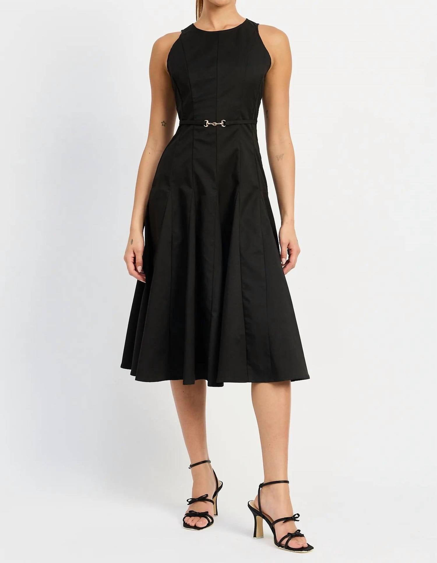 Just add slides or mules and you are good to go. Elevate your wardrobe with the En Saison Clarisse Midi Dress, a chic piece showcasing a solid black design with a touch of luxe through its gold strap detailing. This sleeveless A-line dress offers a sophisticated crewneck silhouette, ideal for engagement parties or Thanksgiving celebrations. Made from 100% polyester and featuring a zip closure for easy wear, it's crafted with a seam detail godet and an integrated belt for added style. Imported and designed with care, you'll enjoy a polished look by following its simple hand wash and line dry instructions. Model is 5'9" and wears a size small.