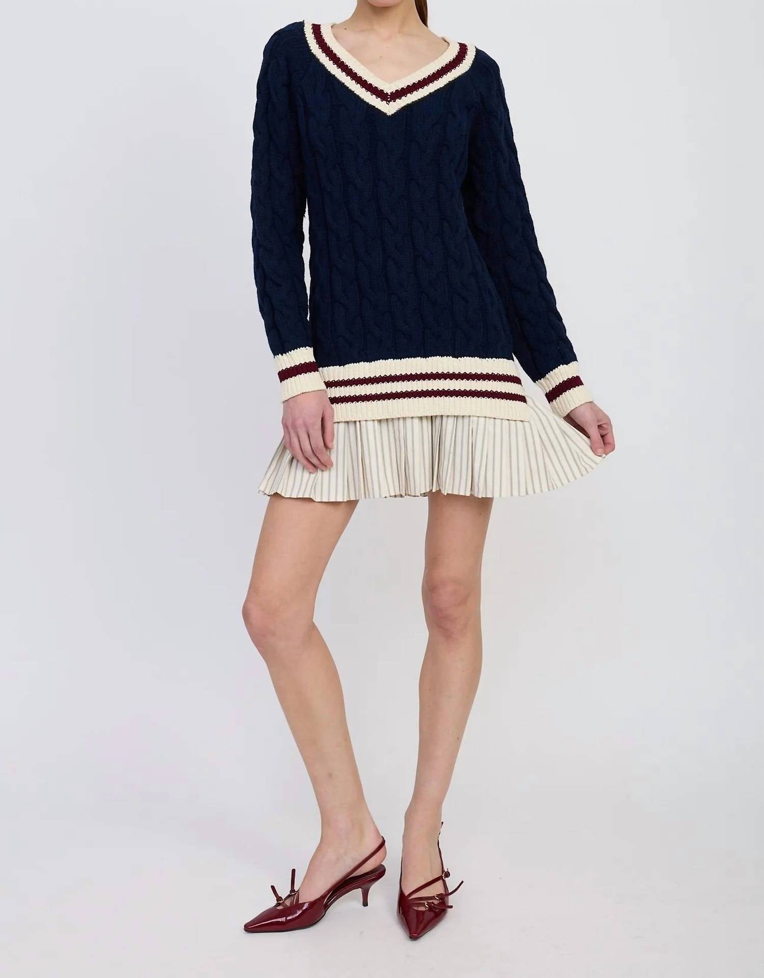 The perfect mini dress for those warmer months. Elevate your style with the Knox Mixed Media Mini Dress by En Saison, a perfect blend of charm and comfort. Featuring a flattering V-neck and long sleeves, this shift silhouette dress pairs navy, burgundy, and ivory in a textured design. Made with 100% cotton and polyester contrast, it offers a chic preppy look ideal for Fall travel or New Year's Eve celebrations. The pull-on design ensures ease of wear, and for care, simply hand wash as needed. Model is 5'9" and wearing a size small.