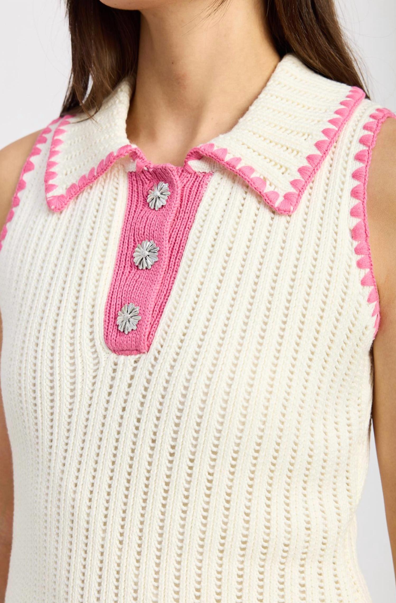 The kind of easy and flattering dress you'll be reaching for all season long. Introducing the Rebecca Stitch Mini Dress by En Saison, a stunning choice for costume parties and spring events. This sleeveless mini dress in White Pink features an A-line silhouette with textured crochet and top stitch details, accented by embellished button closures. Crafted from 55% acrylic and 45% cotton with a 100% polyester lining, it promises both comfort and style. Made with attention to detail, this imported piece is best maintained with hand wash care. Model is 5'9" and wearing a size small.