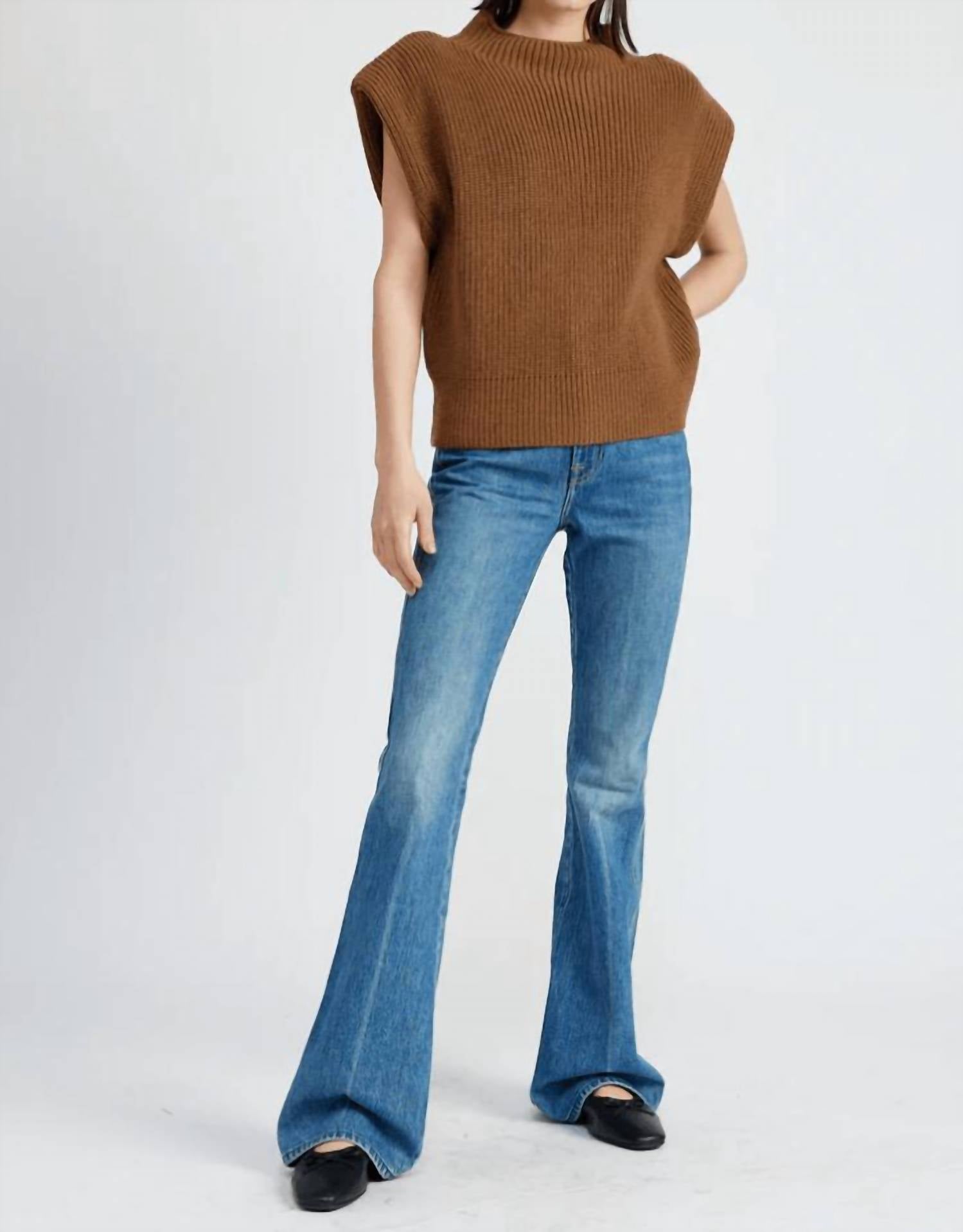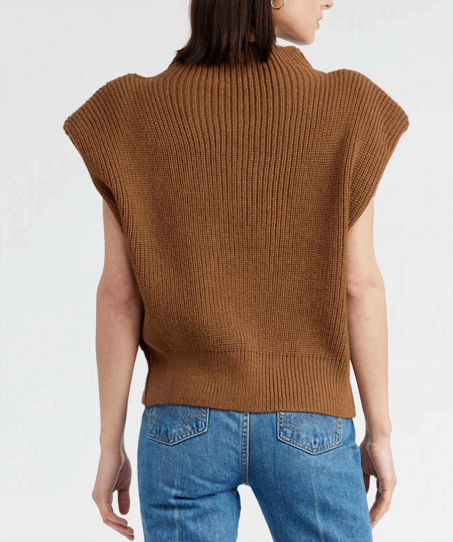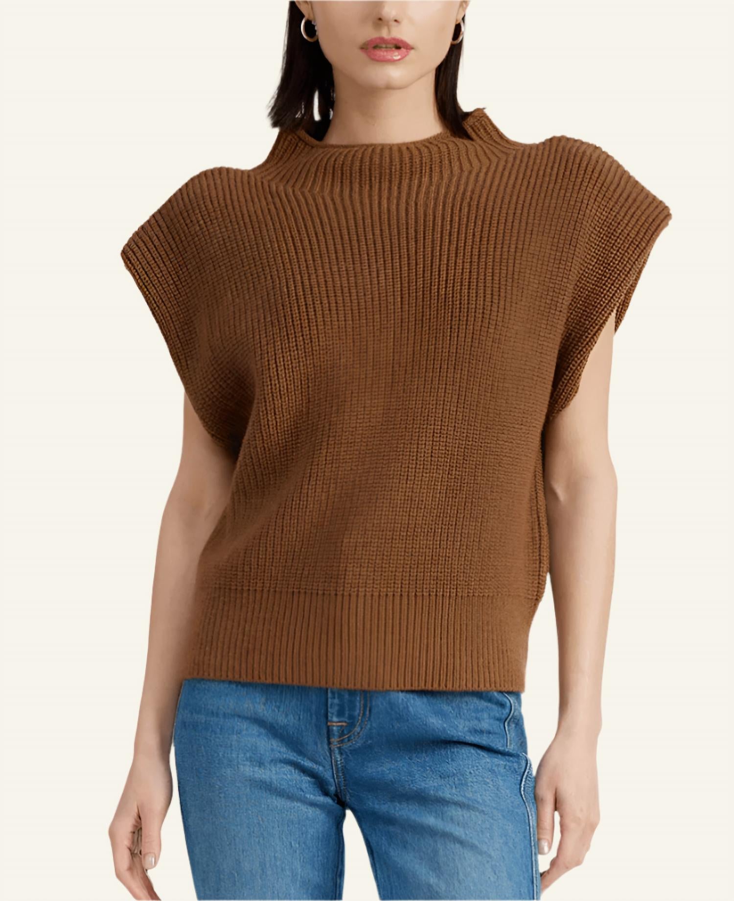 Throw this vest over an all black outfit for a perfectly polished look. Introducing the Karalie Knit Sweater by En Saison, a chic brown vest perfect for fall. This mockneck vest features cap sleeves and shoulder pads, adding a structured, textured look. Made from 100% acrylic, it offers both comfort and style, crafted with the pull-on ease. Care: Hand wash. Imported. Model is 5'9" and wearing a size small.
