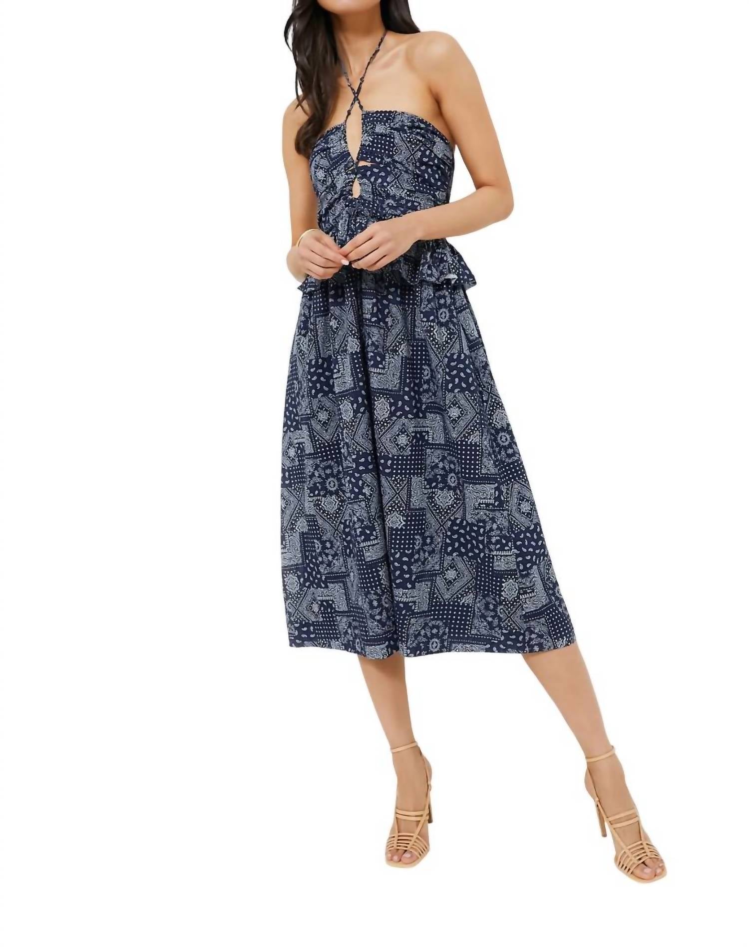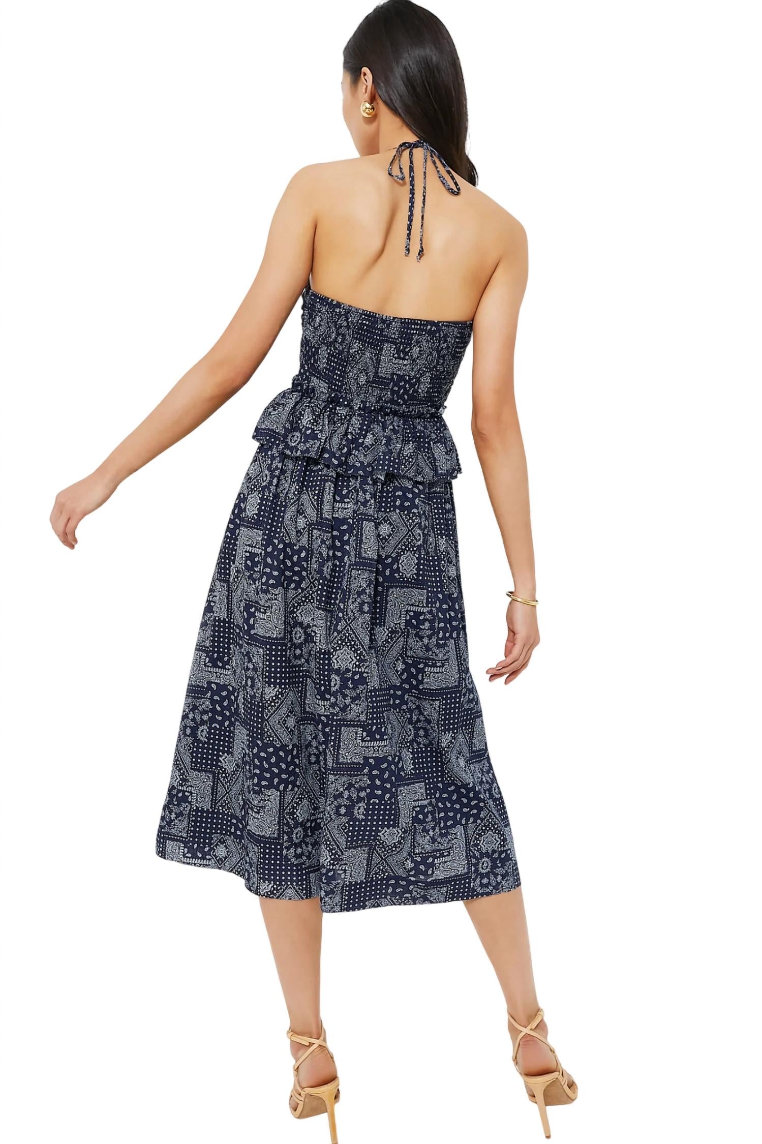 Features a halter tie neckline with front criss-cross detail. Front keyhole detailing. Smocked elastic back. Ruffle waist . Lined. Main: 60%Cotton, 40% Rayon. Line: 100% Cotton. Hand wash cold.
