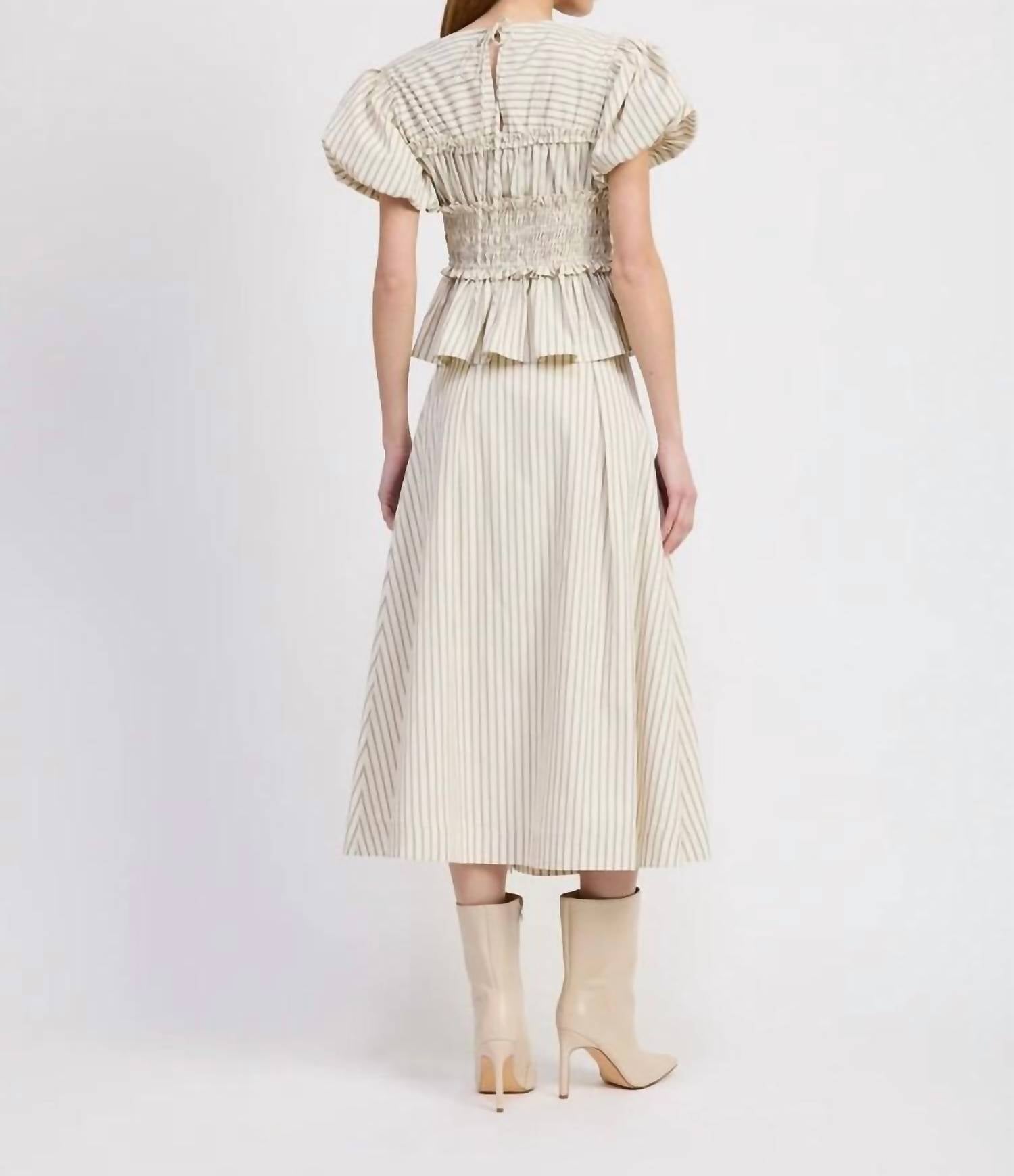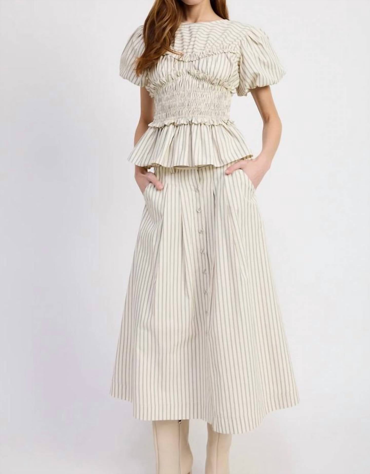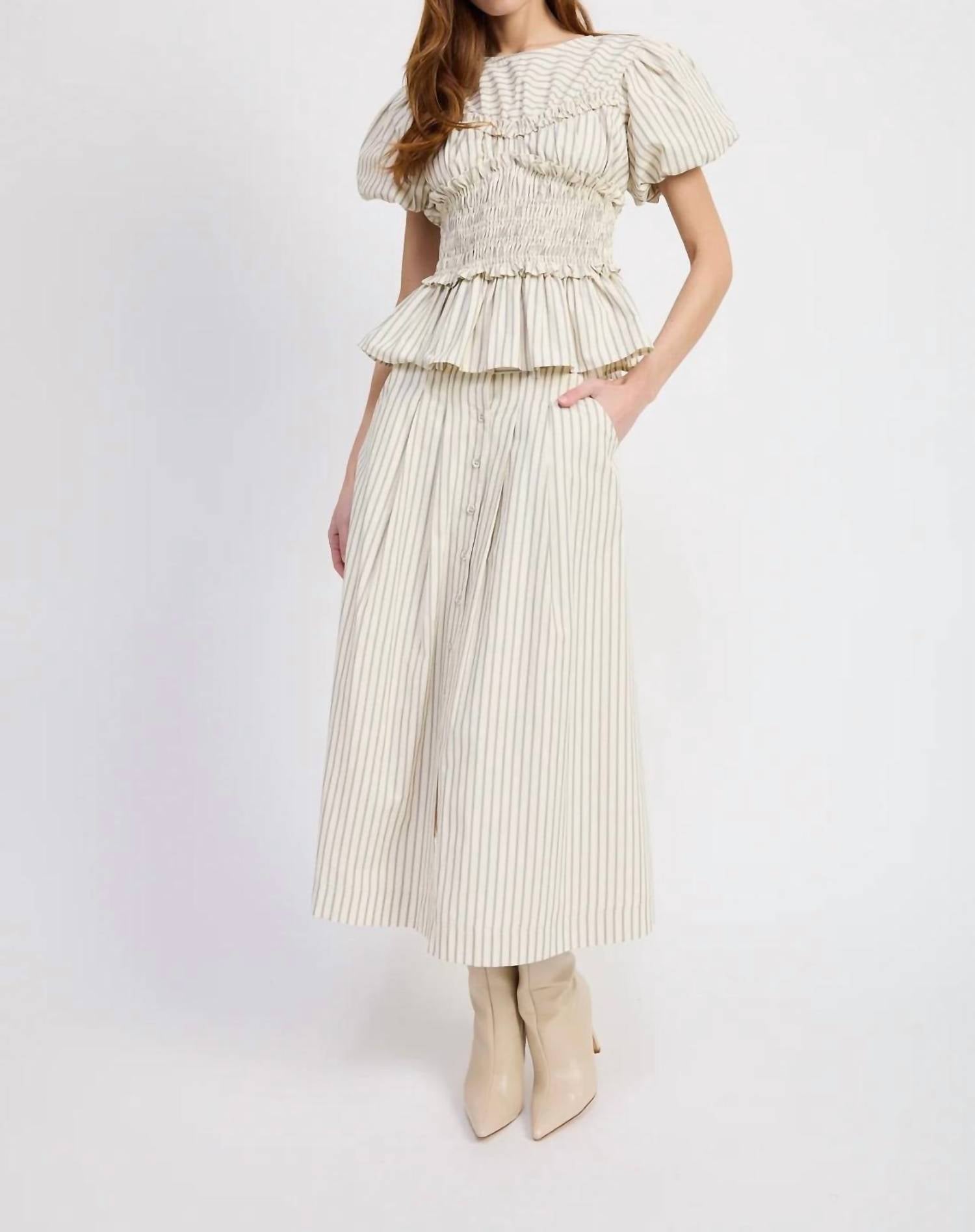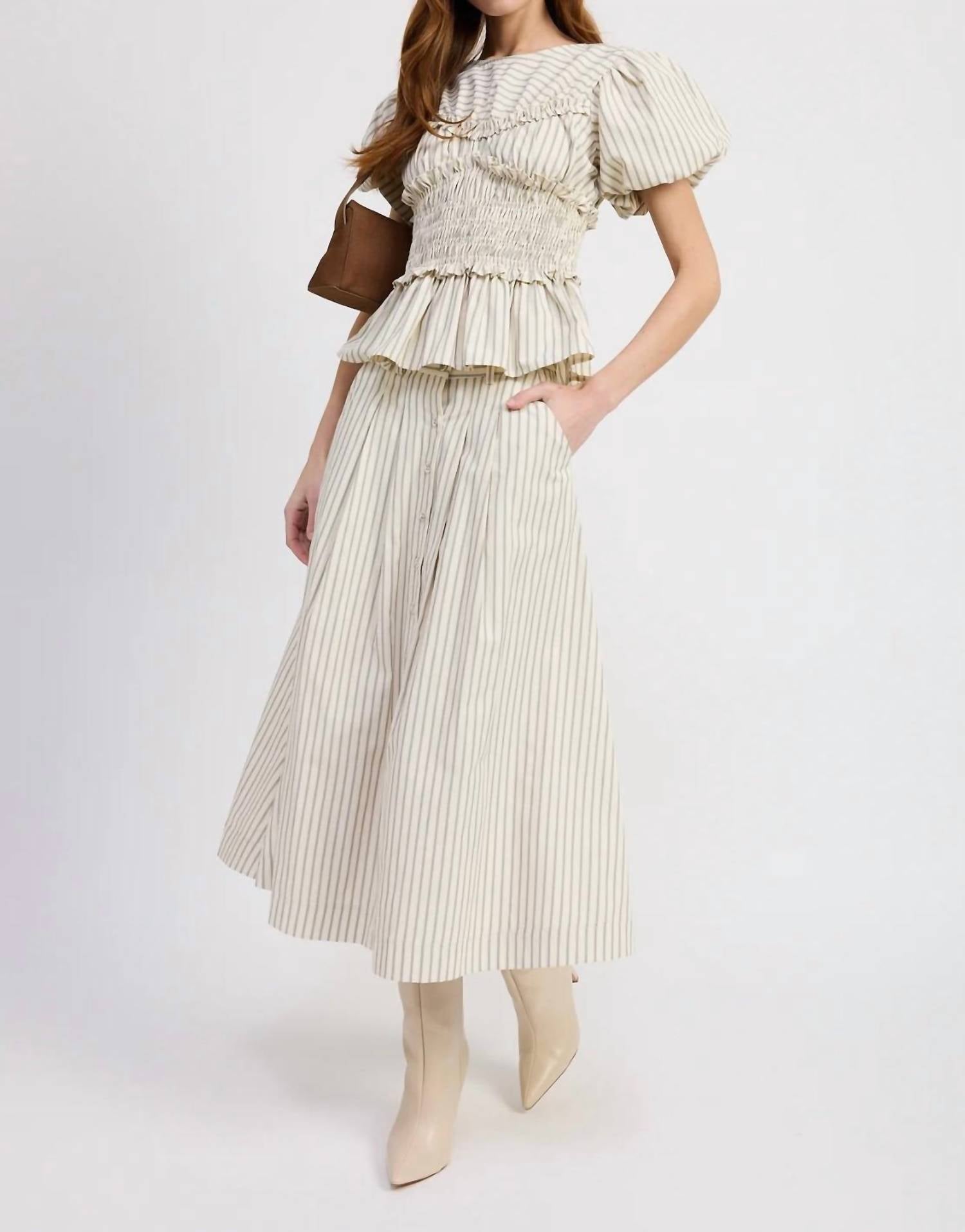 Show off just the right amount of skin in this beautifuly designed midi length skirt. Enhance your wardrobe with the Azra Midi Skirt by En Saison, a chic blend of classic and contemporary style. This A-line skirt features a sophisticated button-front closure and delicate pleats, with a comfortable elastic at the back of the waist. Crafted from 55% polyester and 45% cotton, it includes two practical side pockets. Care for this elegant piece with machine wash and lay flat to dry instructions.