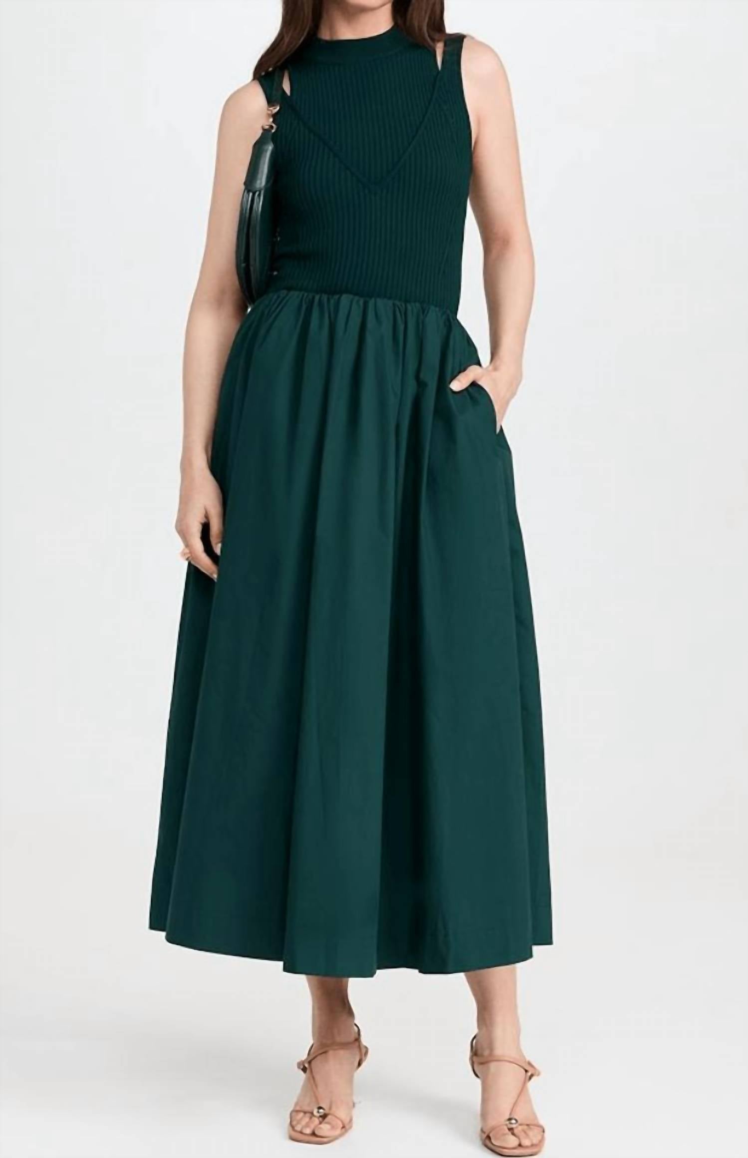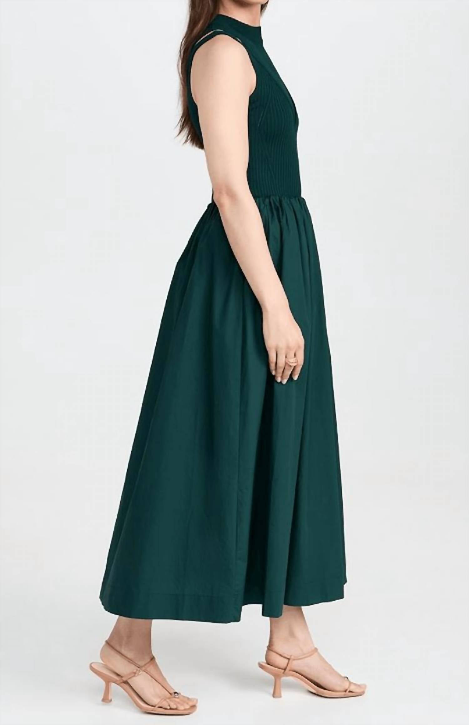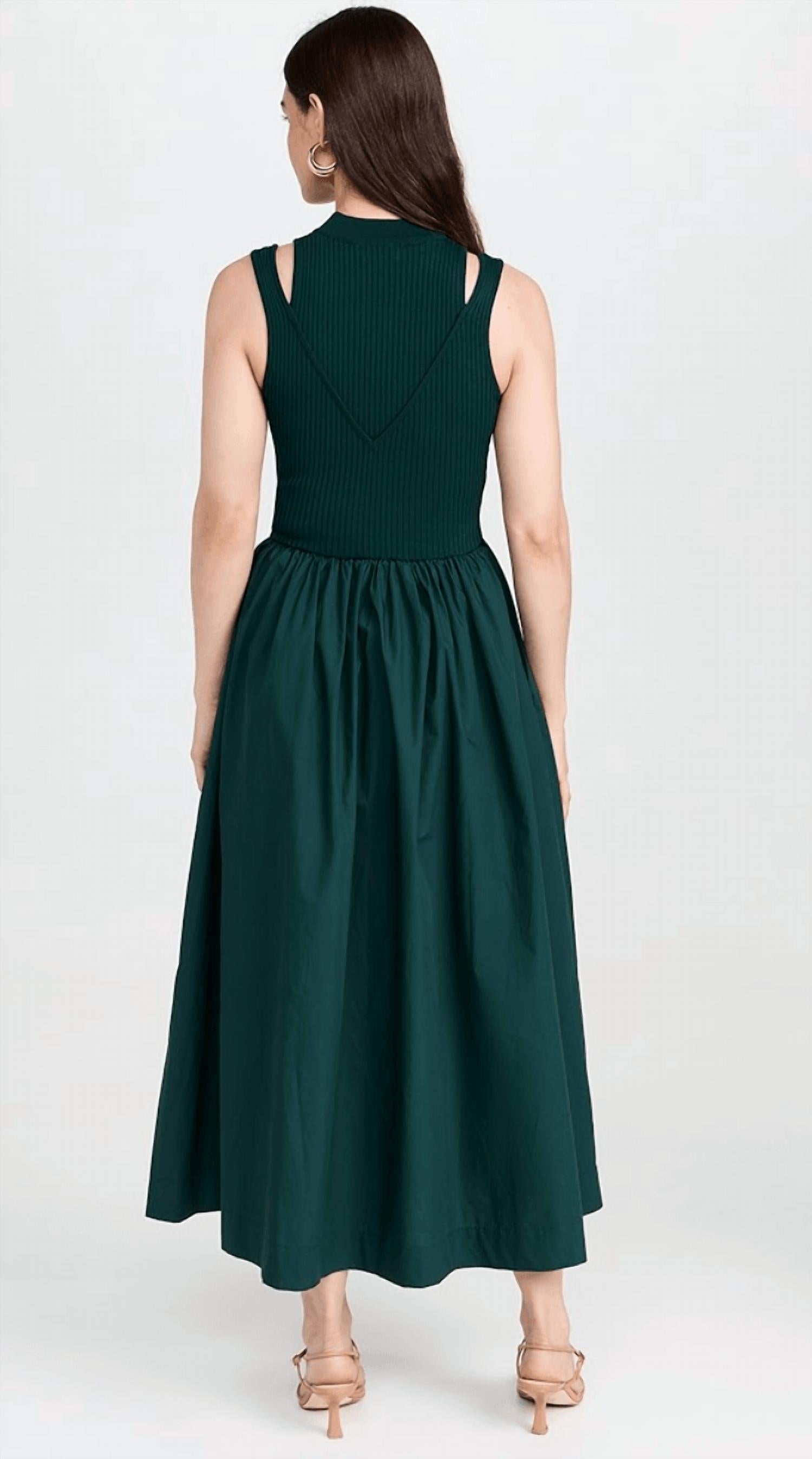 Who doesn't love a good maxi dress? This one you'll be reaching for season after season. Discover the enchanting Sigrid Mixed Media Maxi Dress by En Saison, a statement piece in dark green. Featuring a sleeveless design with cutout shoulder slits and a mock neck, this dress boasts a unique ribbed knit bodice for added texture. Crafted from a lightweight, non-stretch poplin, the shell is 100% cotton with trims of 50% nylon and 50% viscose, enriching its solid, A-line silhouette. With a pullover design and on-seam side pockets, it’s both stylish and practical. Care: Hand wash.