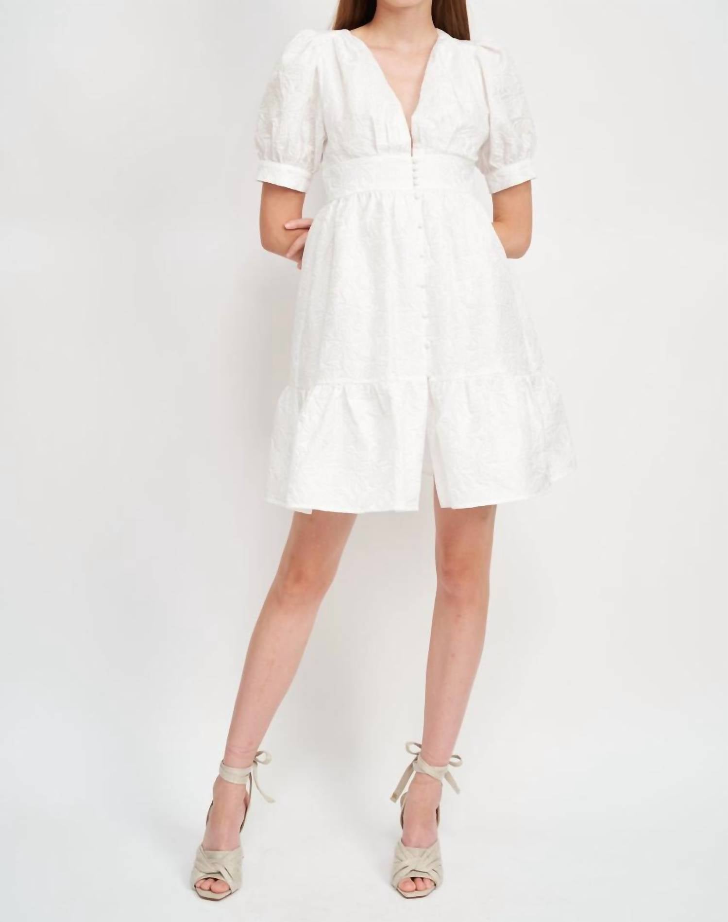 The perfect length dress does exist. Unveil timeless elegance with the Makenna Midi Dress by En Saison, perfect for any sophisticated wardrobe. This white jacquard midi dress features a refined empire waist silhouette complemented by a flattering V-neck and short sleeves. Made from 100% polyester with a comfortable 100% cotton lining, it offers a chic textured pattern with a button closure. Care for this exquisite piece with a gentle hand wash.