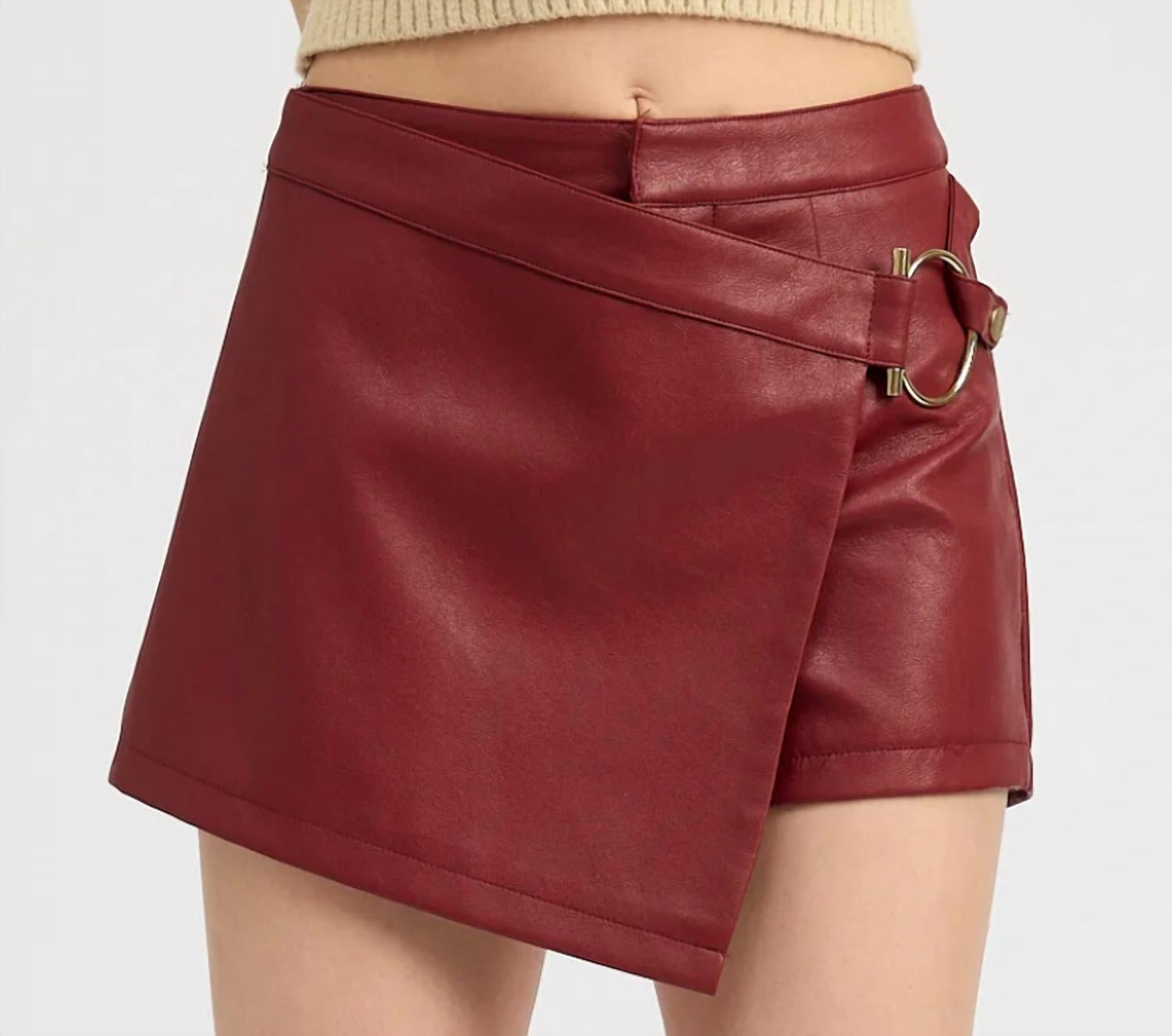 The go-anywhere and do-anything skort that you'll love to live in. Introducing the Campbell Wrap Skort by En Saison in a striking red hue, crafted from a luxurious viscose blend. This vegan leather skort, perfect for a quiet luxury look, features a solid pattern ideal for a springtime vacation or Valentine's Day celebration. Made from 55% Viscose and 45% Polyurethane with a lining composed of 98% Polyester and 2% Spandex. Care for this imported piece by hand washing to maintain its pristine condition.