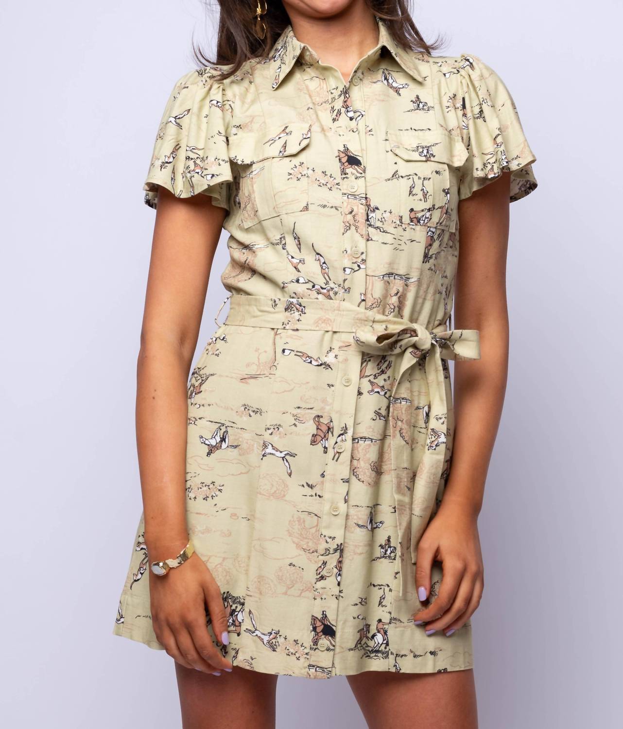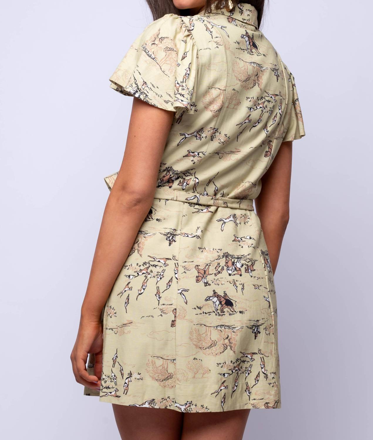 The perfect mini dress for those warmer months. Showcasing a unique novelty print and a flattering tie waist design in a sage hue. Features short fluttering sleeves enhancing its chic appeal. Crafted from 75% Rayon and 25% Linen, with a 100% Cotton lining. Ensures comfort and breathability. Includes a button closure for ease of wear. Care instructions recommend hand washing for optimal maintenance.