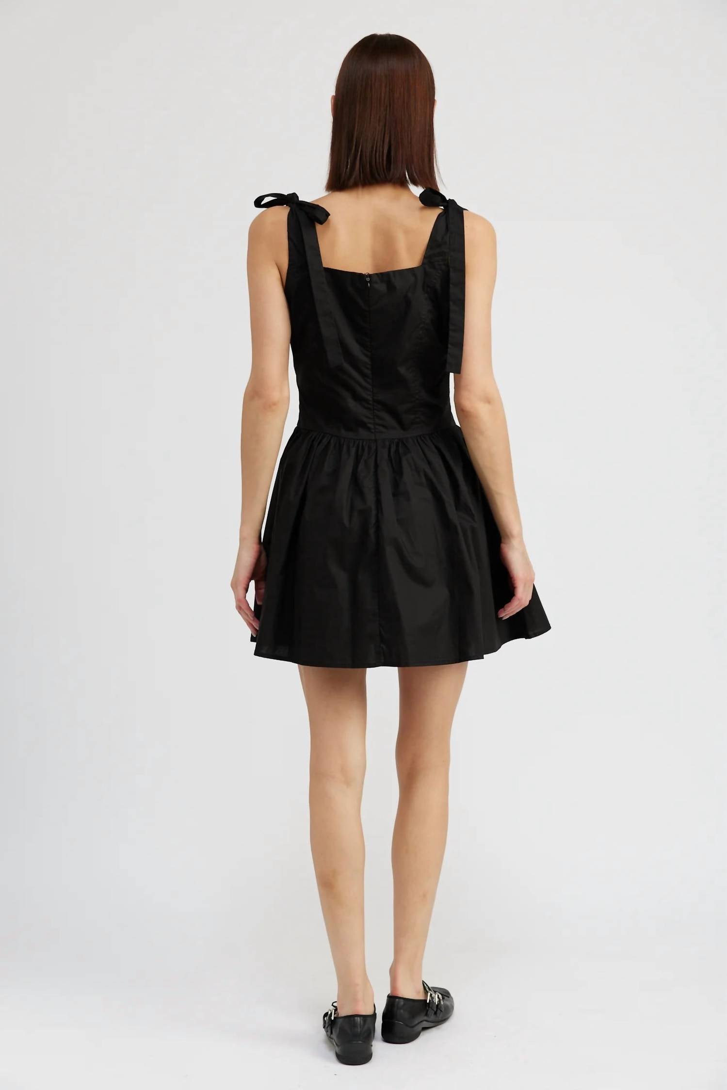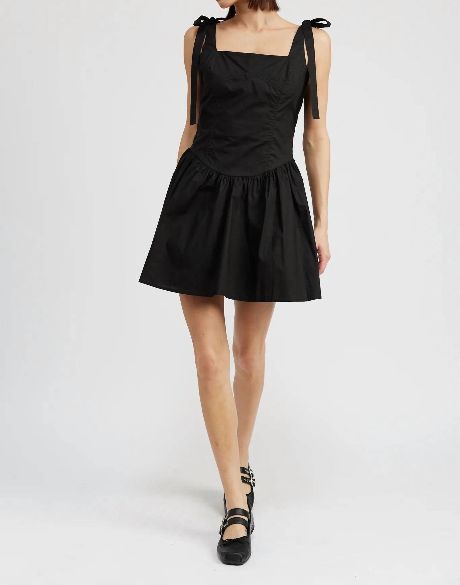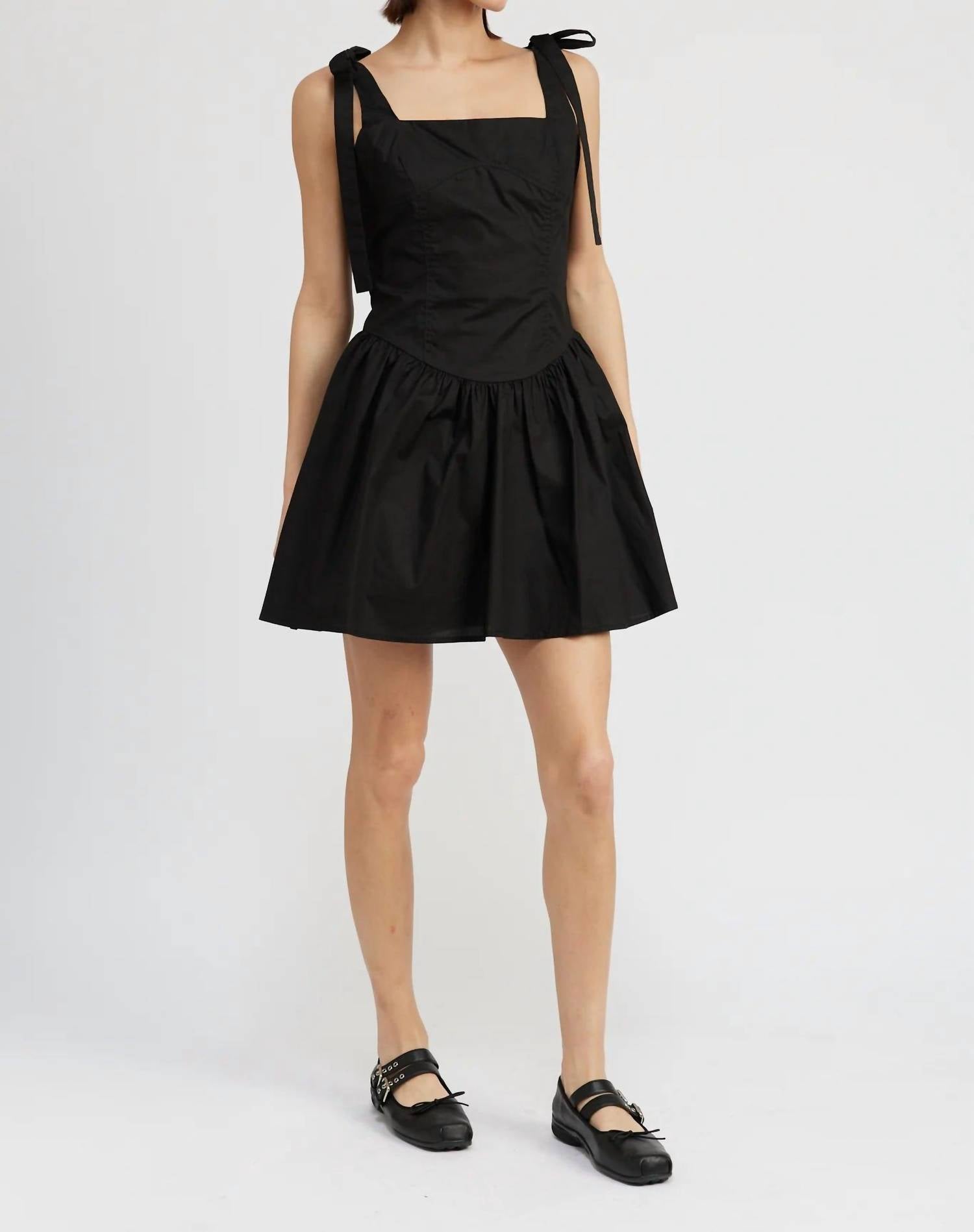 Casual, comfortable and cute! The dress that you'll be reaching for all season long. Introducing the Charlie Mini Dress by En Saison, a chic black poplin design perfect for both a night out or a casual daytime look. This A-line dress boasts spaghetti straps and features a modern dropped waist with a playful corset seamed bodice. It's crafted from 100% cotton, both in the shell and the full lining, ensuring comfort and breathability. Closure: Hidden back zipper. Care: Hand wash and hang dry. Model is 5'9" and wearing a size small.