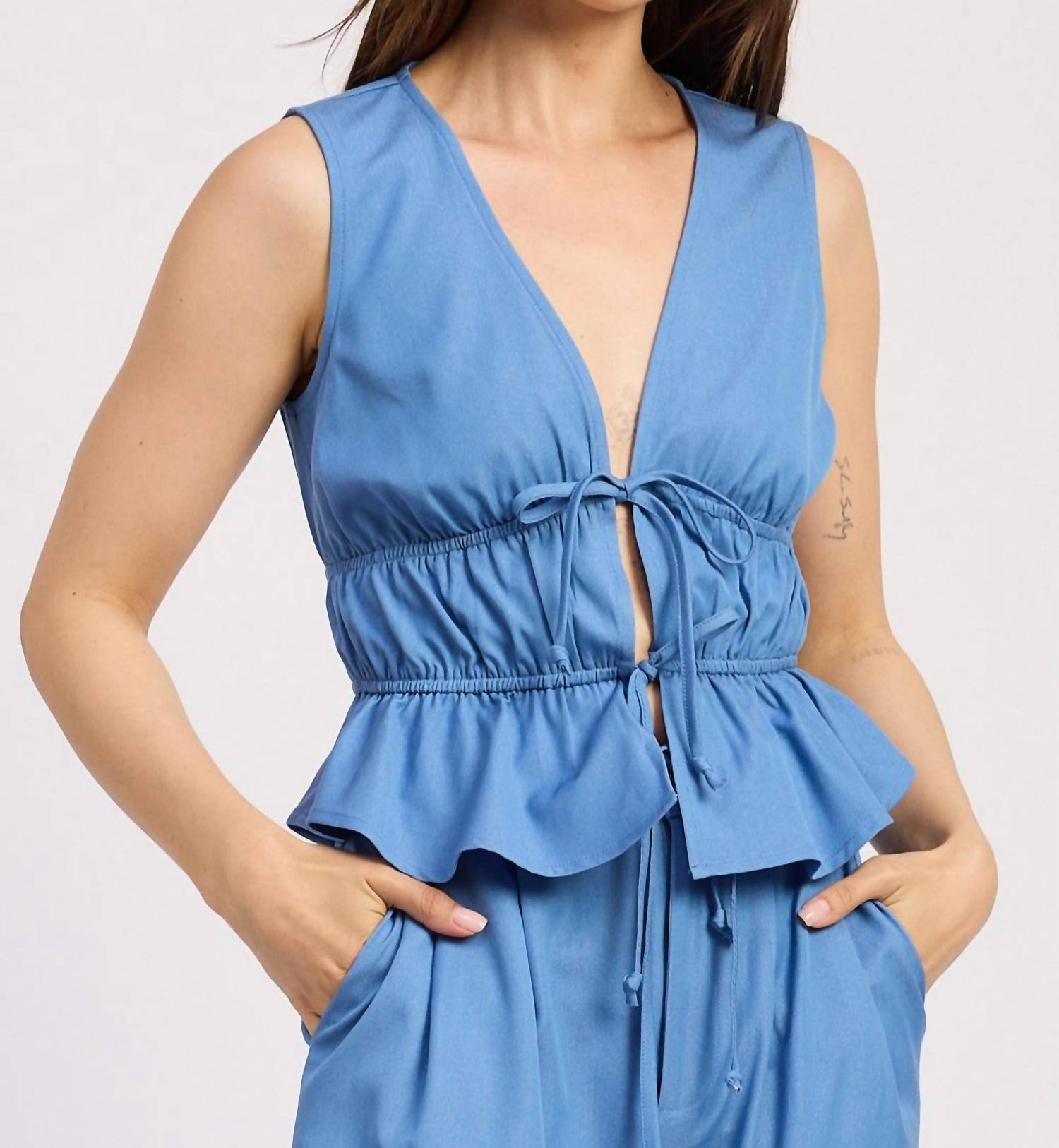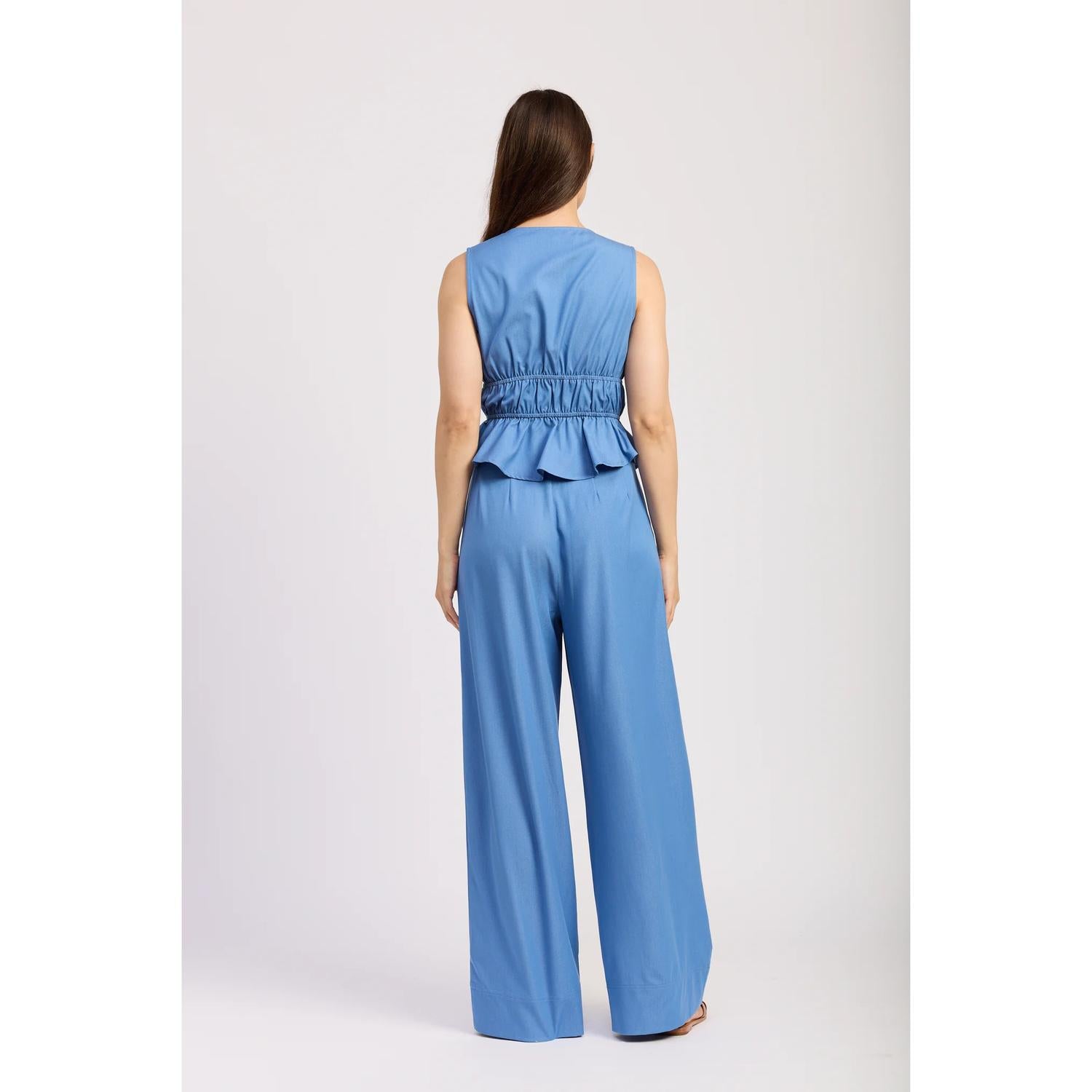 A timeless blouse that will never go out of style. Elevate your wardrobe with the Sleeveless Double Tie Top by En Saison, an effortlessly chic chambray piece perfect for any occasion. Made from a blend of 70% Rayon, 27% Polyester, and 3% Spandex, this top offers subtle texture and gentle volume for a flattering silhouette. Designed as a sleeveless piece with a squareneck and a double tie closure, it pairs beautifully with the matching Liana Pants. Imported and easy to care for with hand wash and line dry instructions.