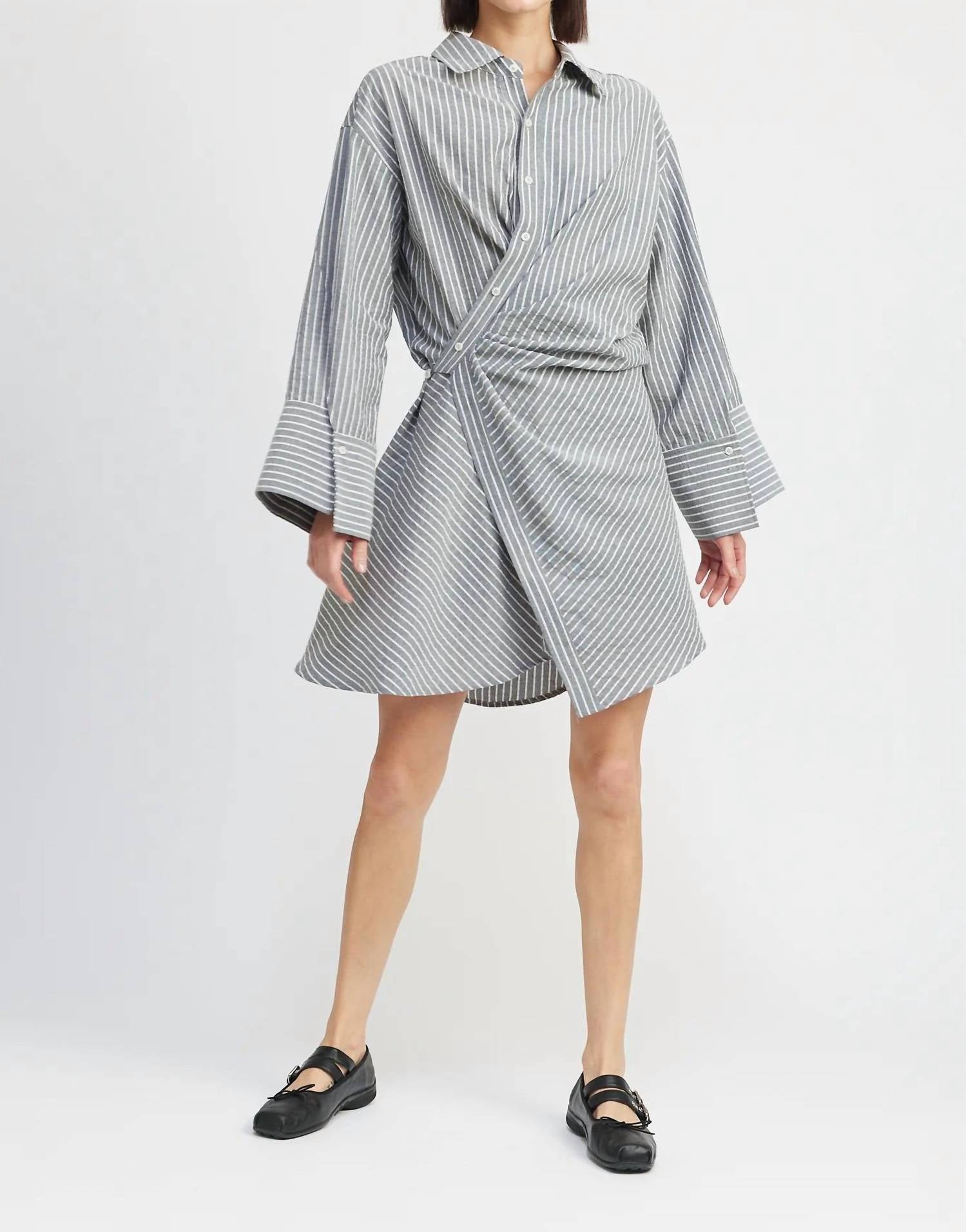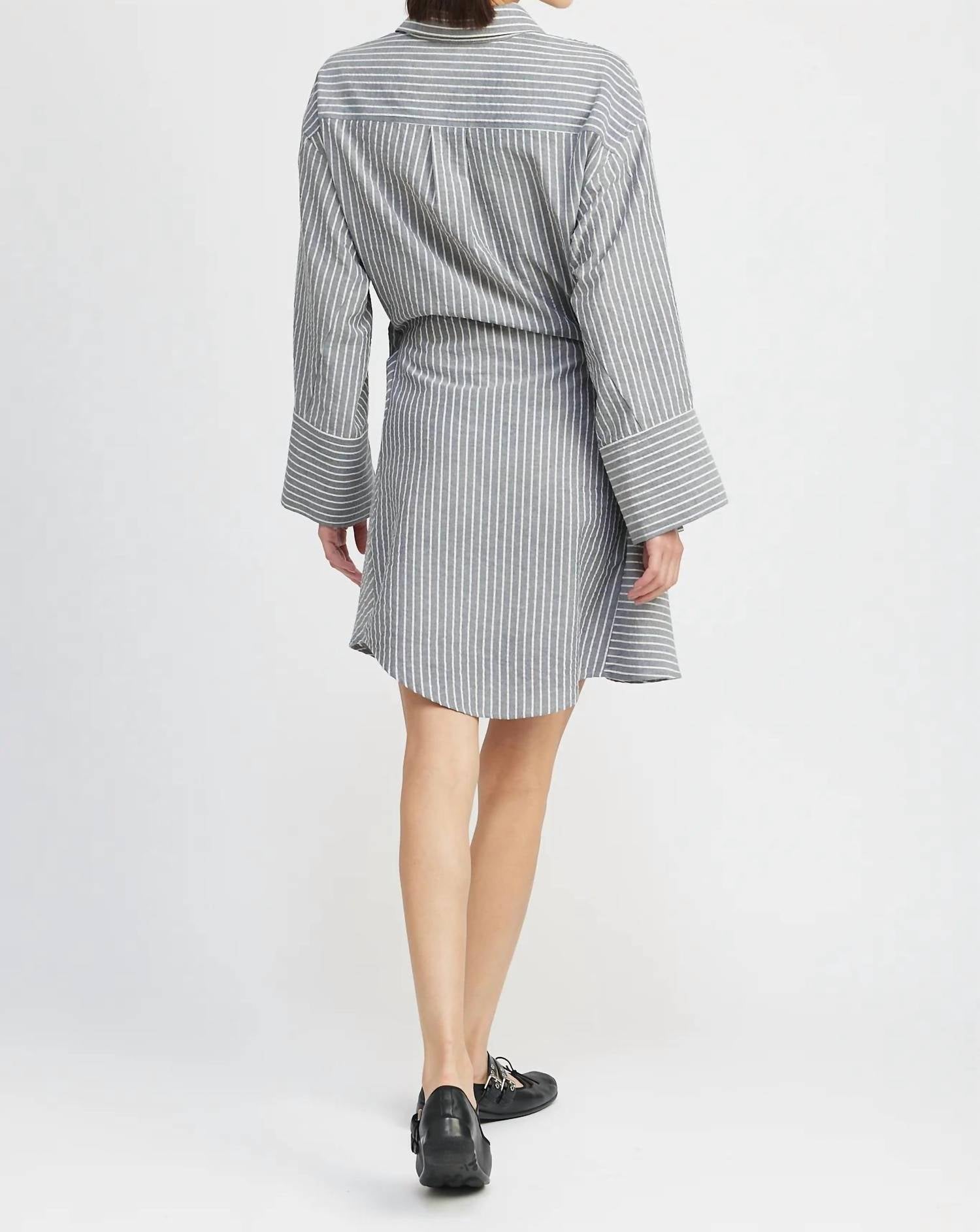 Pair with your favorite sandals for an effortlessly chic look. Introducing the asymmetric JJ Shirt Dress by En Saison, featuring long sleeves and an eye-catching faded navy stripe design. Made from a comfortable cotton blend of 70% Cotton and 30% Polyester, this shift dress makes a bold fashion statement. Closure: Button closure. Care: Hand wash only. Ideal for making an impression, whether celebrating a birthday or enhancing your fall wardrobe. Model is 5'9" and is wearing a size S.