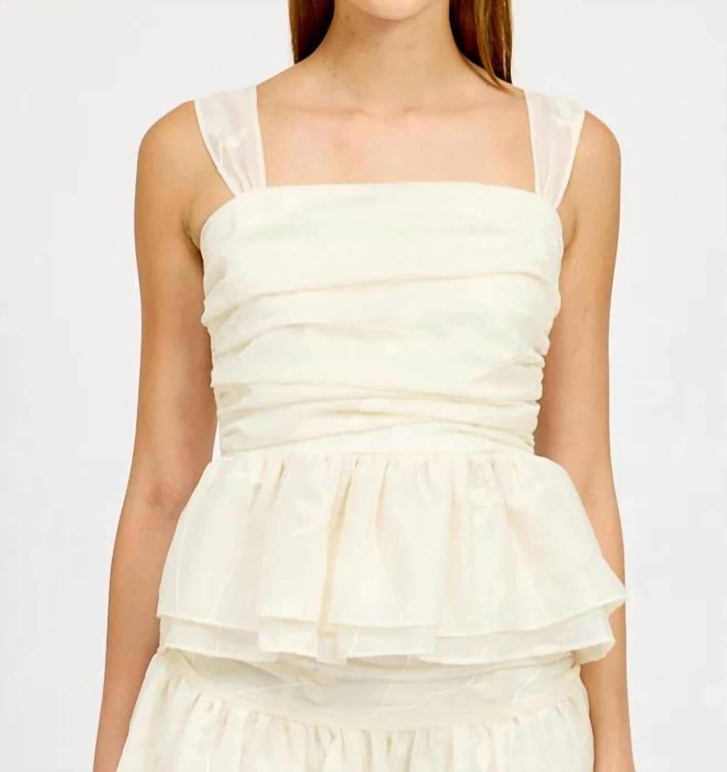 The perfect tank top for those warmer weather seasons. Elevate your look with the minimalist essential in a classic ivory hue. Featuring a sleeveless design and a stylish square neckline. Perfect for spring occasions like graduations. Designed with a ruched peplum silhouette, offers a flattering fit without the fuss of pockets. Pull on. Hand wash.