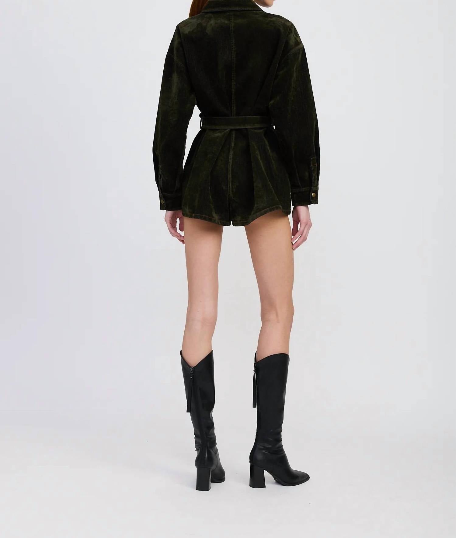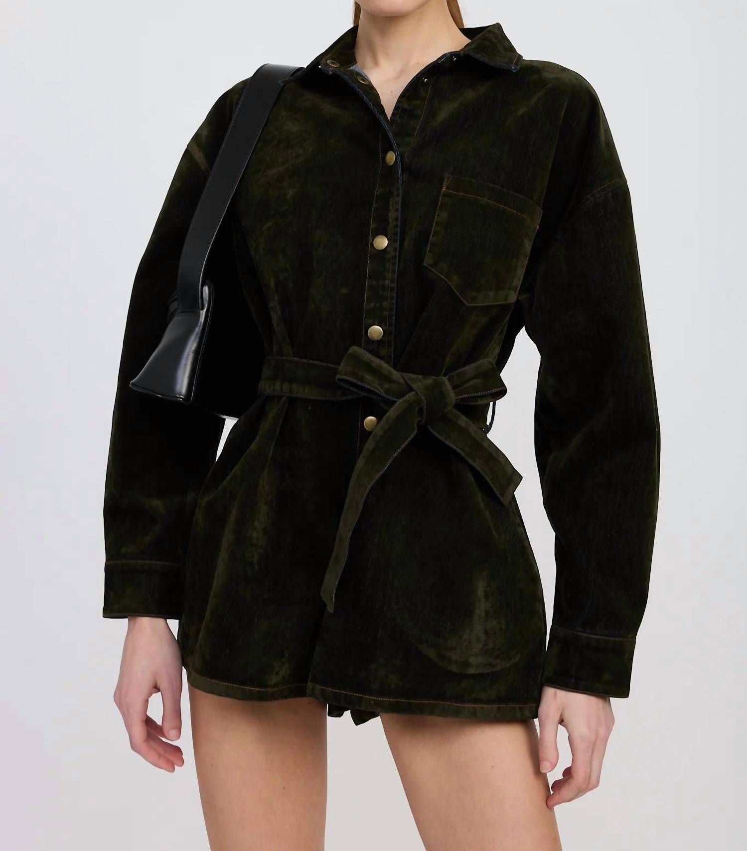 Introducing the Julien Long Sleeve Playsuit in Olive by En Saison, a perfect blend of style and functionality for your fall wardrobe. This playsuit features long sleeves and a collared neckline, crafted from 100% cotton for a comfortable fit. Designed with a utility silhouette, it has a high-rise waist complemented by a belted detail and practical pockets. Closure: Button closure. Care: Hand wash. Origin: Imported.