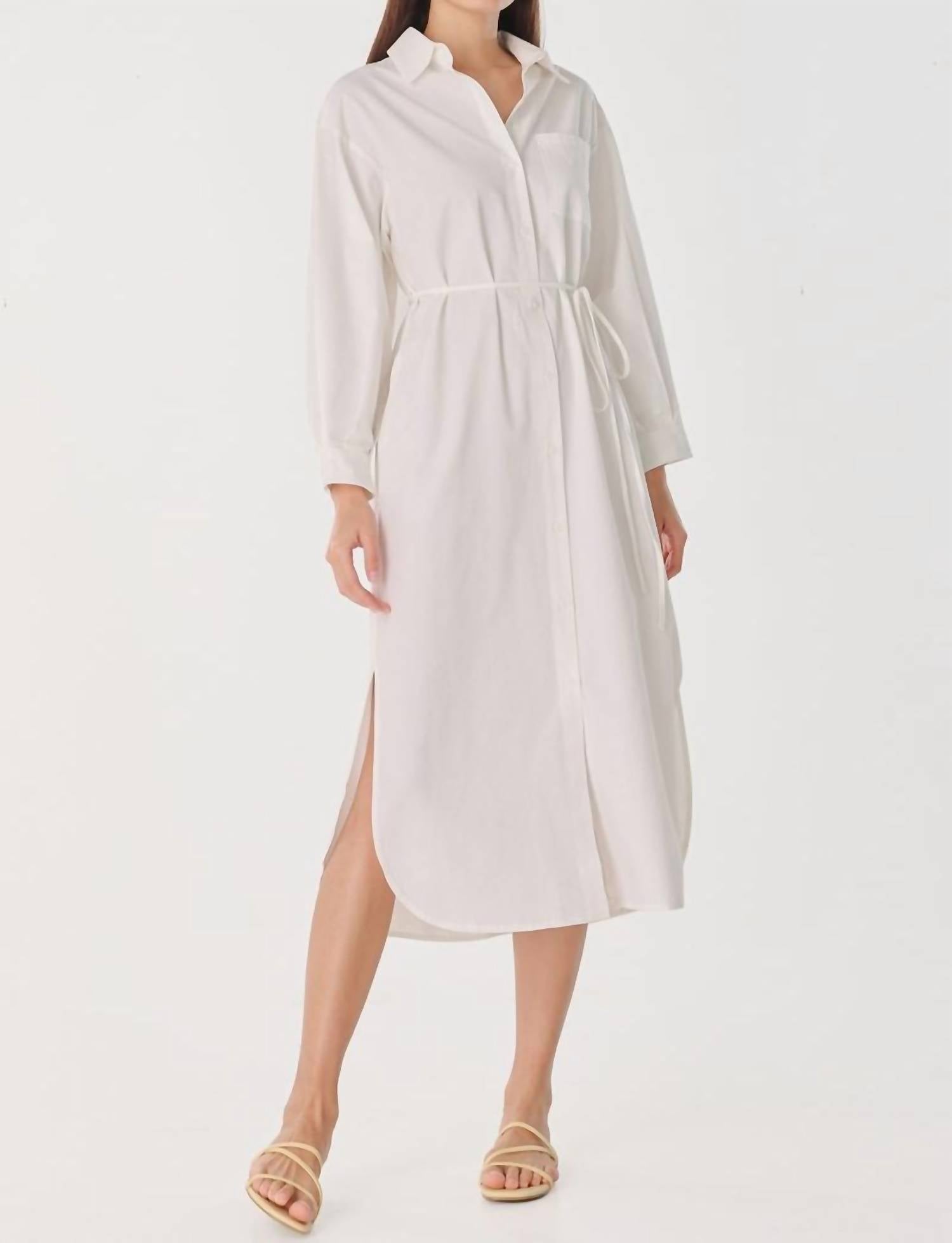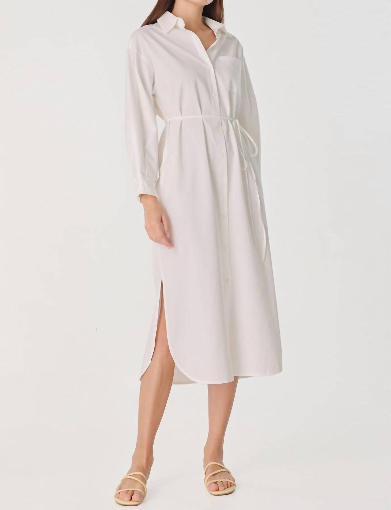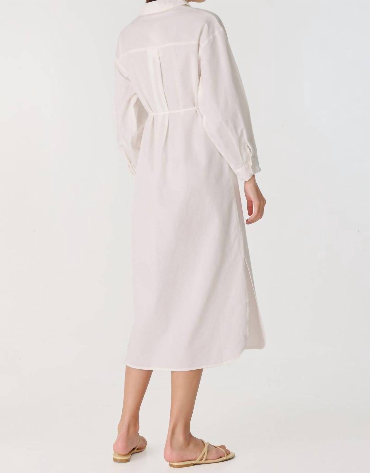 A midi dress so versatile, your options for wearing it are endless. This tailored piece is crafted from a polyester blend with a full lining for a smooth, structured finish. Non-sheer and designed without stretch, it features functional front and cuff buttons, front pockets, and a fabric waist sash with belt loops for a customizable fit. Both practical and refined, it’s a versatile style that blends elegance with everyday wearability.