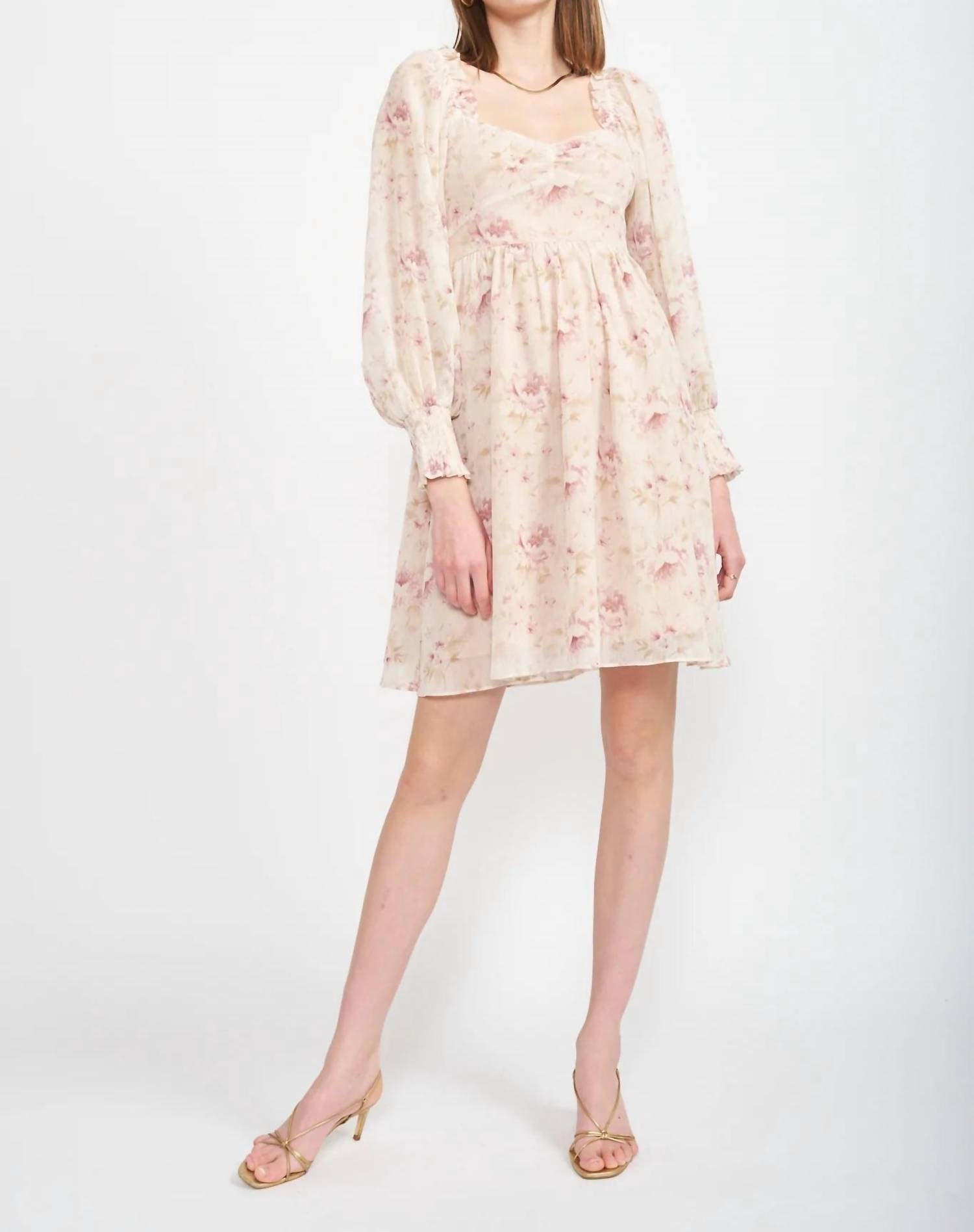 A short and breezy dress for those warmer days. Unveil your romantic side with the Eaven Mini Babydoll Dress by En Saison. This pink floral mini dress captures the essence of spring with its slightly ruched sweetheart neckline and sheer billowing sleeves that transition from on to off the shoulder. Crafted from 100% Polyester with a fully lined A-line silhouette, it effortlessly pairs with tights and boots for versatile styling. Closure: Pull on. Care: Hand wash.