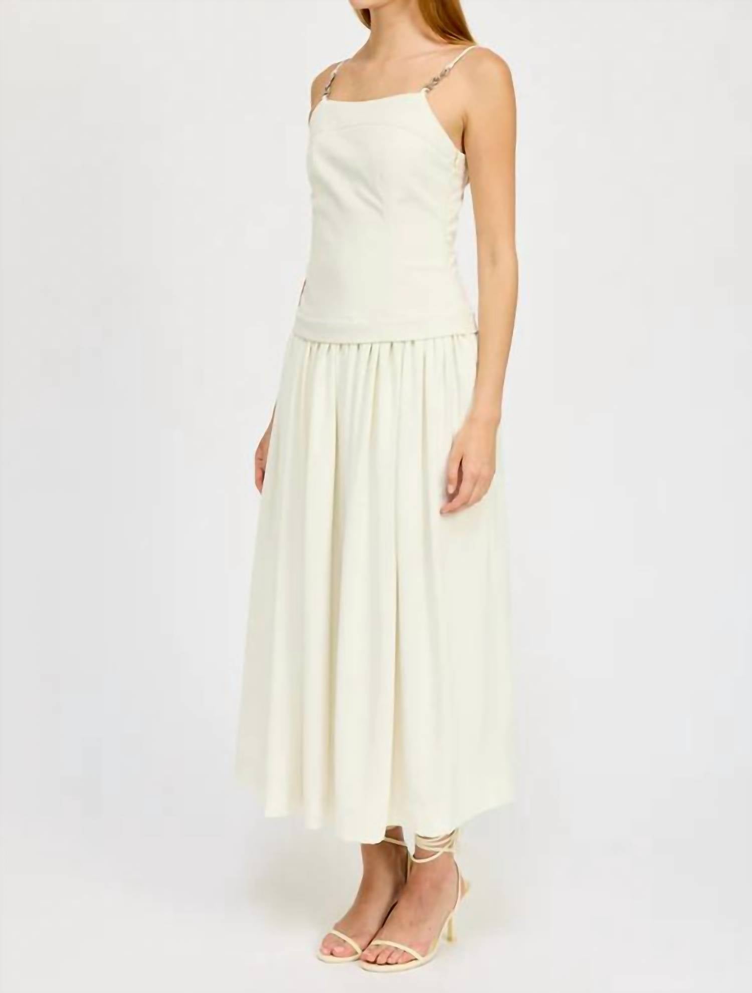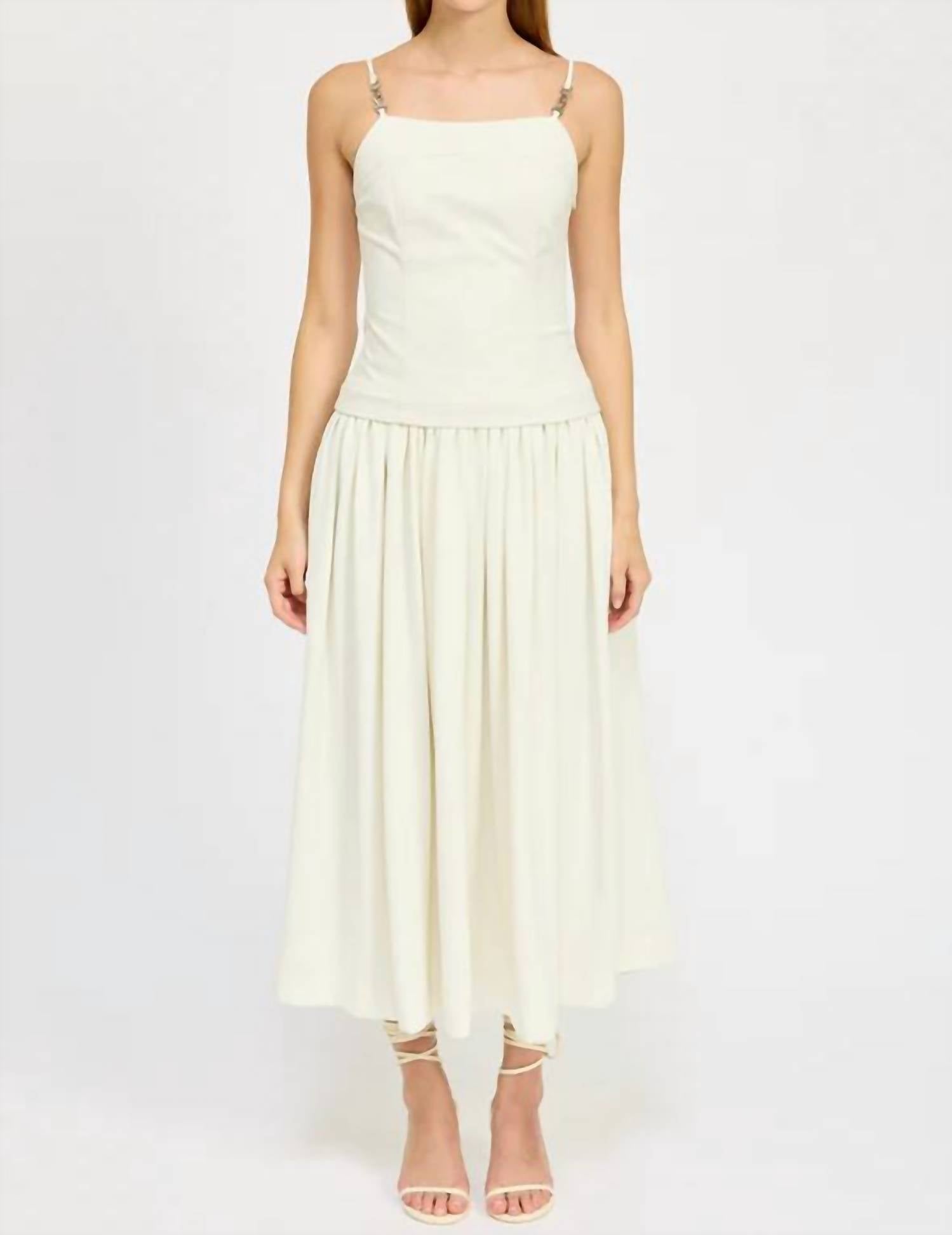 Style this maxi with your favorite statement necklace and sandals for the perfect look. Elevate your spring wardrobe in timeless ivory. Featuring spaghetti straps with silver hardware and a square neckline. Offers a minimalist appeal with its fit and flare silhouette. Crafted in a mixed media style, fully lined, and includes a convenient side zipper closure for easy wear. Care instructions advise a gentle hand wash to maintain its pristine condition, perfect for occasions such as graduation.