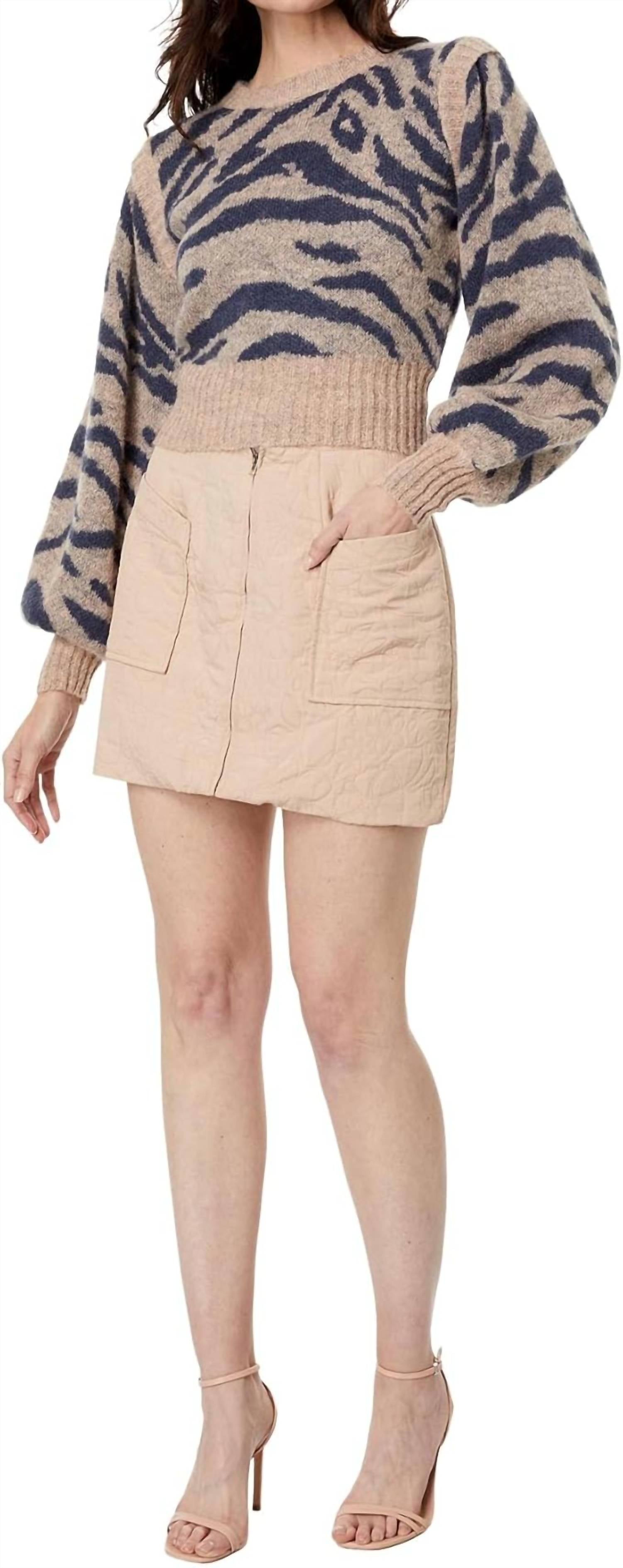 Stay warm and stylish in this versatile and effortlessly cool knitwear staple. Wear it alone or layered, it's the perfect sweater for the season and you'll wish you had it in every color. Unleash your inner fashionista with the En Saison Mares Knit Top in a striking navy multi animal print. This pullover sweater features long voluminous puff sleeves and a rib-knit pattern on the neckline, shoulders, cuffs, and hemline, adding a dramatic and contemporary flair. Crafted from a luxurious blend of 48% nylon, 22% polyester, 15% wool, and 15% acrylic, it’s perfect for staying stylishly cozy in the winter months. Made for versatility, its pull-on design allows for effortless elegance, and care is simple with hand wash instructions. Model is 5'6" wearing size S.