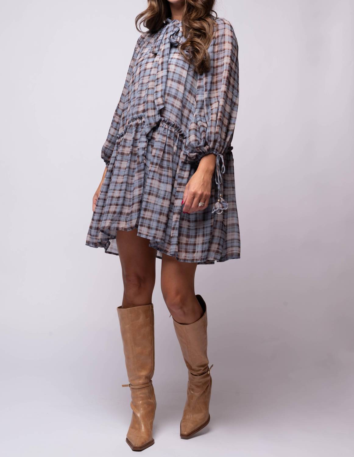 The kind of easy and flattering dress you'll be reaching for all season long. Presenting the Briar Mini Dress by En Saison, a charming blend of retro flair and modern elegance. This dusty blue and brown plaid dress features long sleeves, a button-front bodice with a pussybow tie, and an A-line tiered mini skirt for a breezy silhouette. Made from 100% Polyester, the dress is crafted for summer occasions with a boho-chic appeal. Closure: Button closure. Care: Hand wash cold, line dry. Model is 5'9" wearing size S.