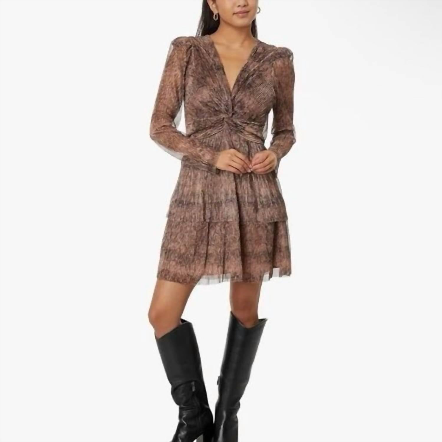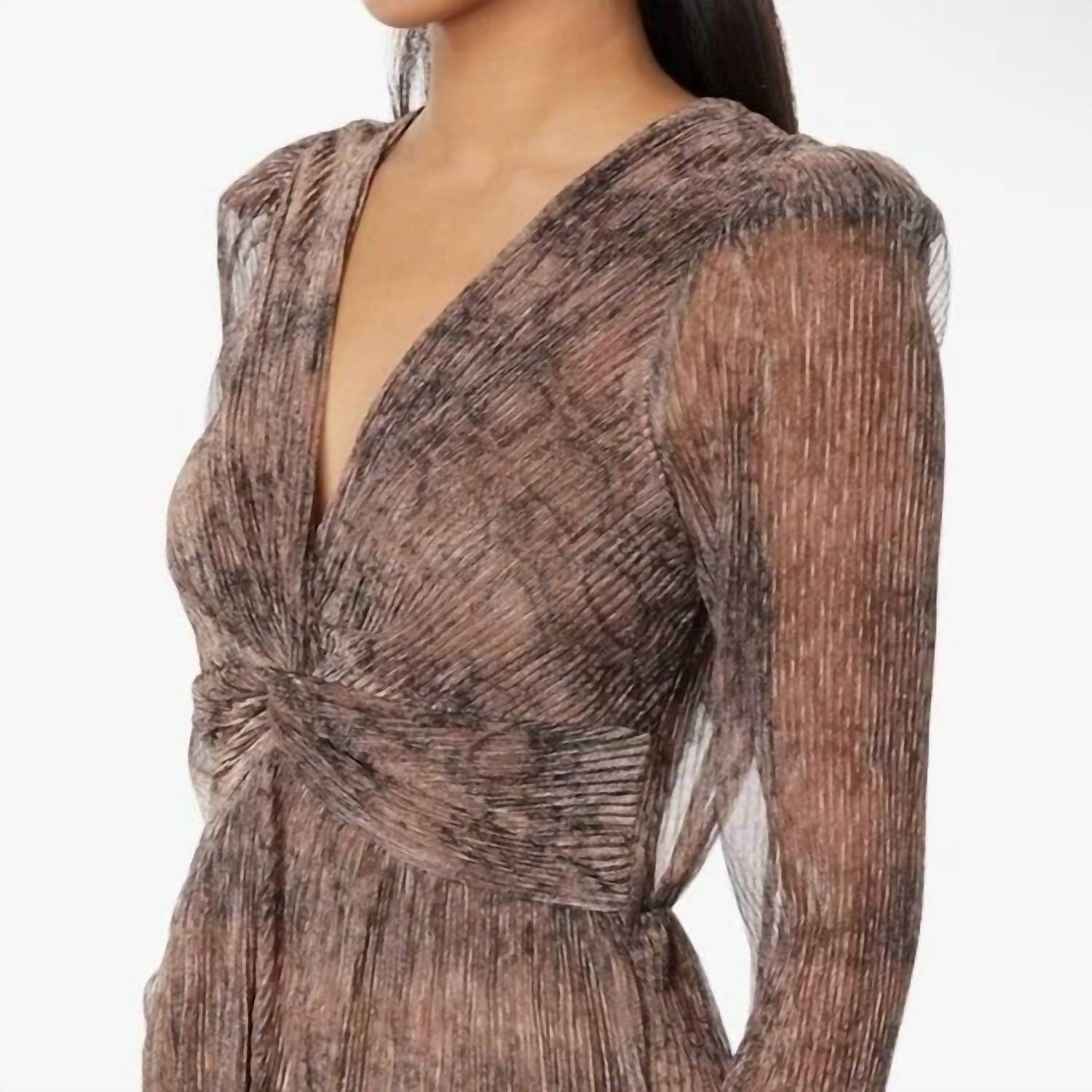 The perfect mini dress for those warmer months. Step into the spotlight with the En Saison Catamaran Sheer Mini Dress, perfect for evening events and parties. Designed in a shimmering rose gold, this A-line dress features a bold mini length and a chic V-neck. The long sleeves offer a touch of elegance while maintaining a lightweight and breathable feel. Crafted to embrace the 90s fashion trend, the animal pattern adds an edgy flair, ideal for turning heads on a special night out.