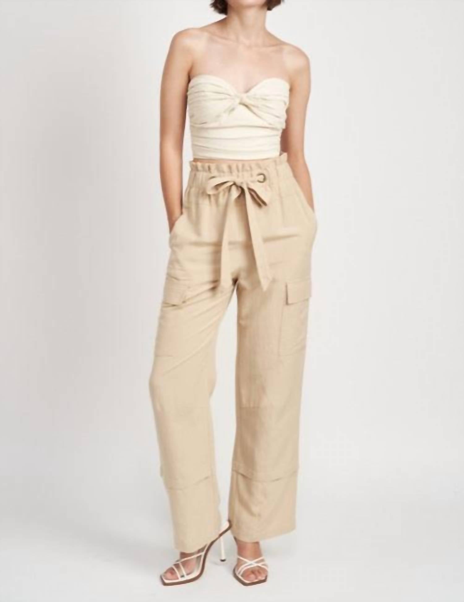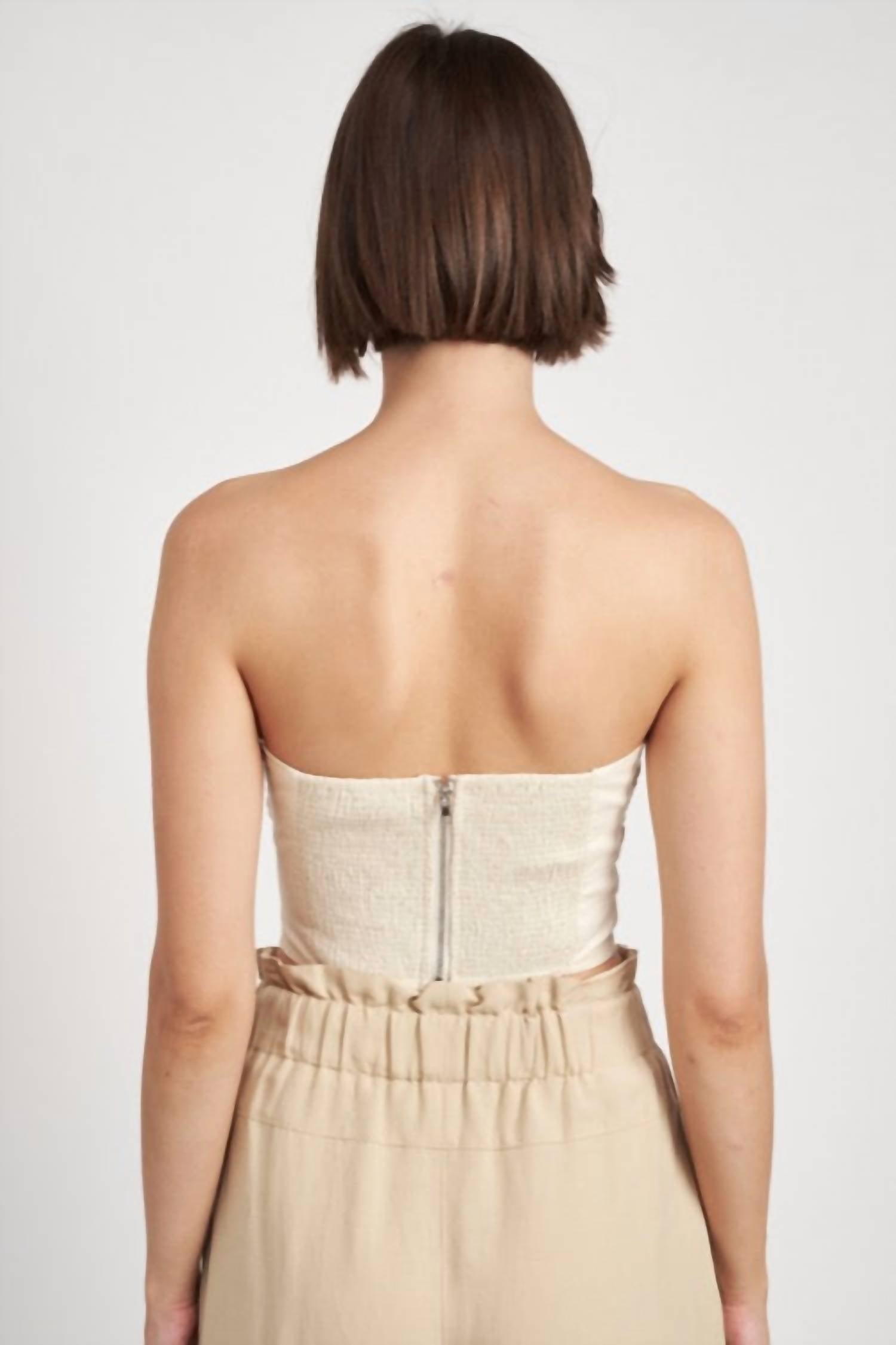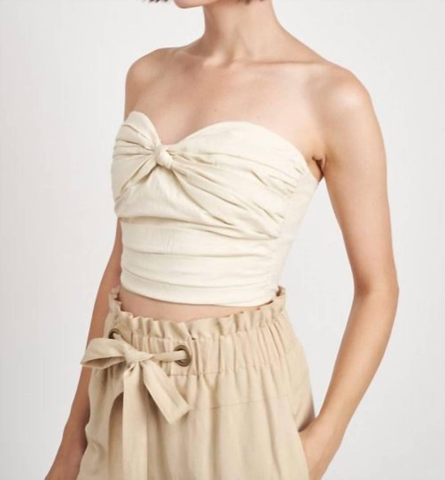 Pair this crop top with your favorite high-waisted jeans or maxi skirt. Elevate your wardrobe with the Descano Knotted Tube Top by En Saison, a chic piece perfect for any dinner party. This strapless, cropped-length design in a minimalist taupe features a knotted front bust and a smocked back for added stretch. Crafted from a comfortable cotton blend of 97% cotton and 3% spandex, it ensures both style and comfort. Closure: Zip closure. Care: Hand wash cold and line dry. Model is wearing size XS (5’4” height, 32C bust, 24” waist, 31” hips).