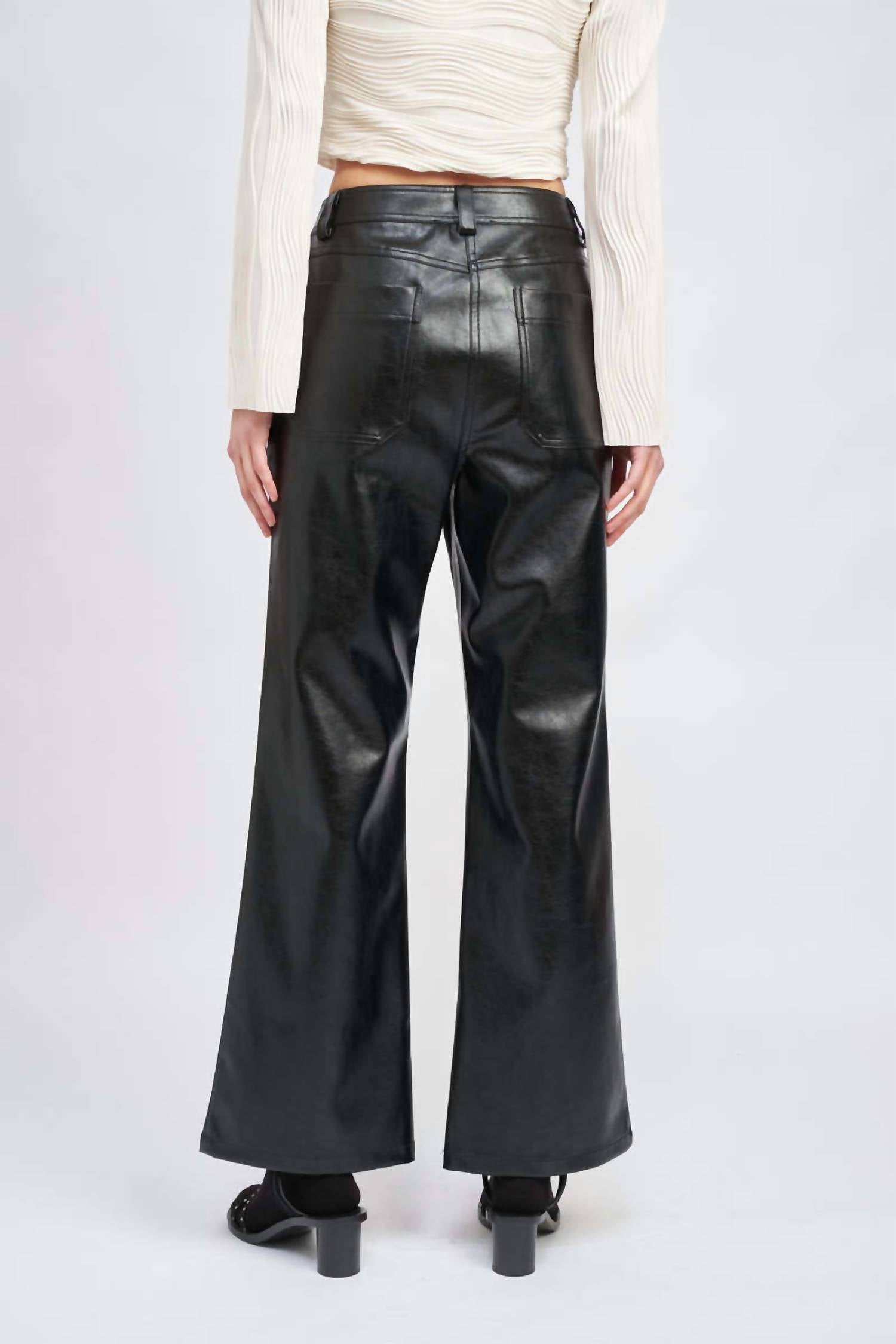 Unveil a sleek and minimalist addition to your wardrobe with the Faux Leather Pants by En Saison, expertly crafted for the fashion-forward woman. These pants boast a high-rise banded waist with convenient belt loops, offering a classic fit and wide-leg silhouette for a refined look. Made from a luxurious viscose blend, they feature slant side pockets and a secure hook and eye, zip closure. With an inseam of 30.5”, they are perfect for versatile styling; care instructions recommend hand washing and line drying. Model is 5'6" wearing size XS.