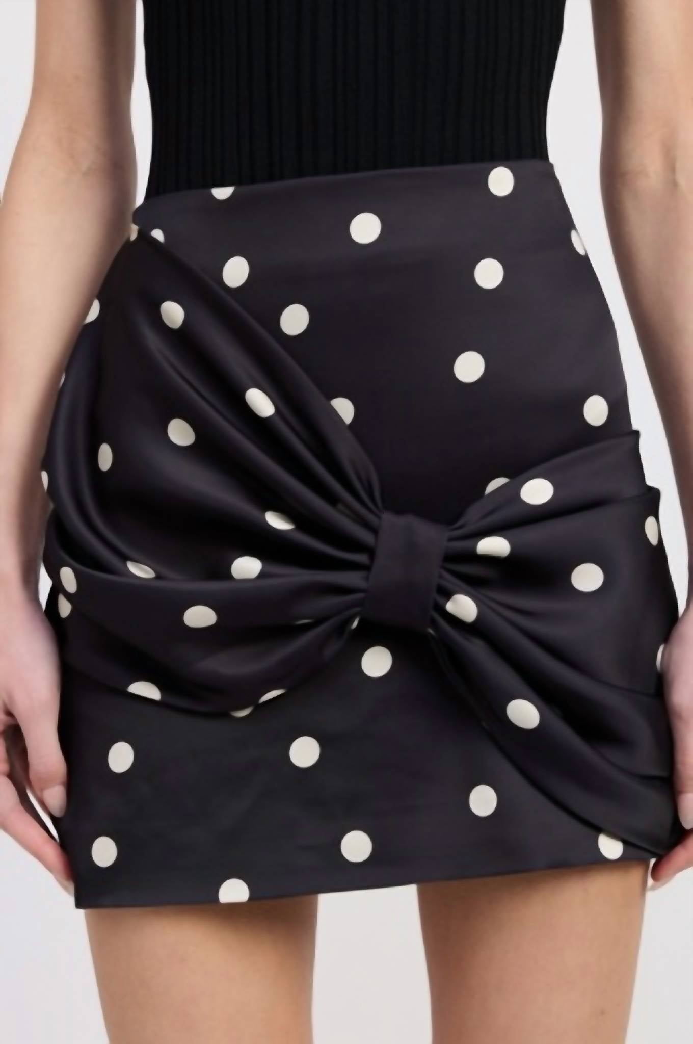 Show just the right amount of leg in this fit flattering mini. Step into the spotlight with the Floretta Mini Skirt by En Saison, a chic choice for your next cocktail party. Crafted from 100% Polyester with a lining of 97% Polyester and 3% Spandex, this stylish skirt features a striking polka dot pattern in Black and Ivory. The statement tacked self-ruched bow detail adds a touch of elegance, while the zip closure ensures a secure fit. Care for this exquisite piece with a gentle hand wash.