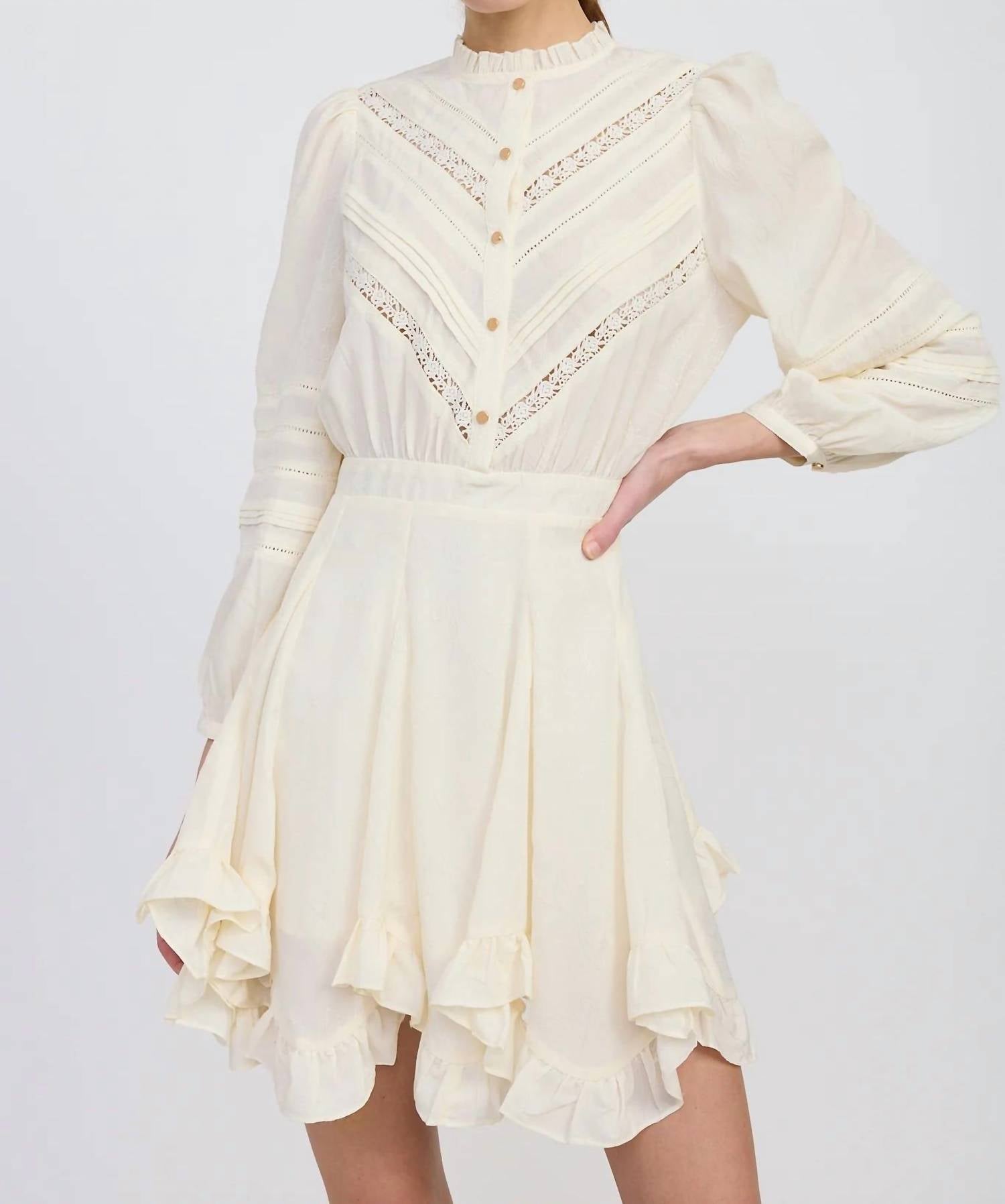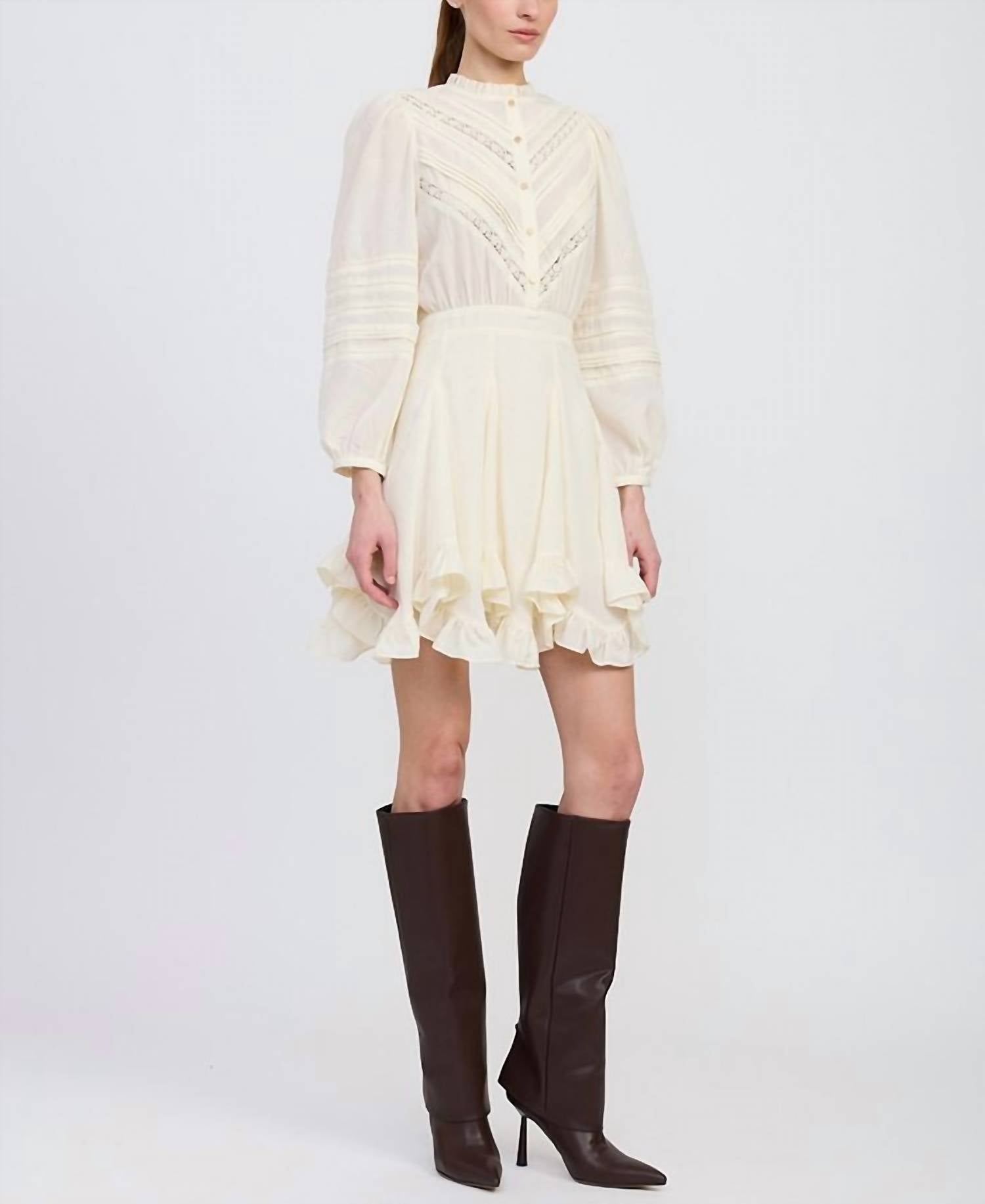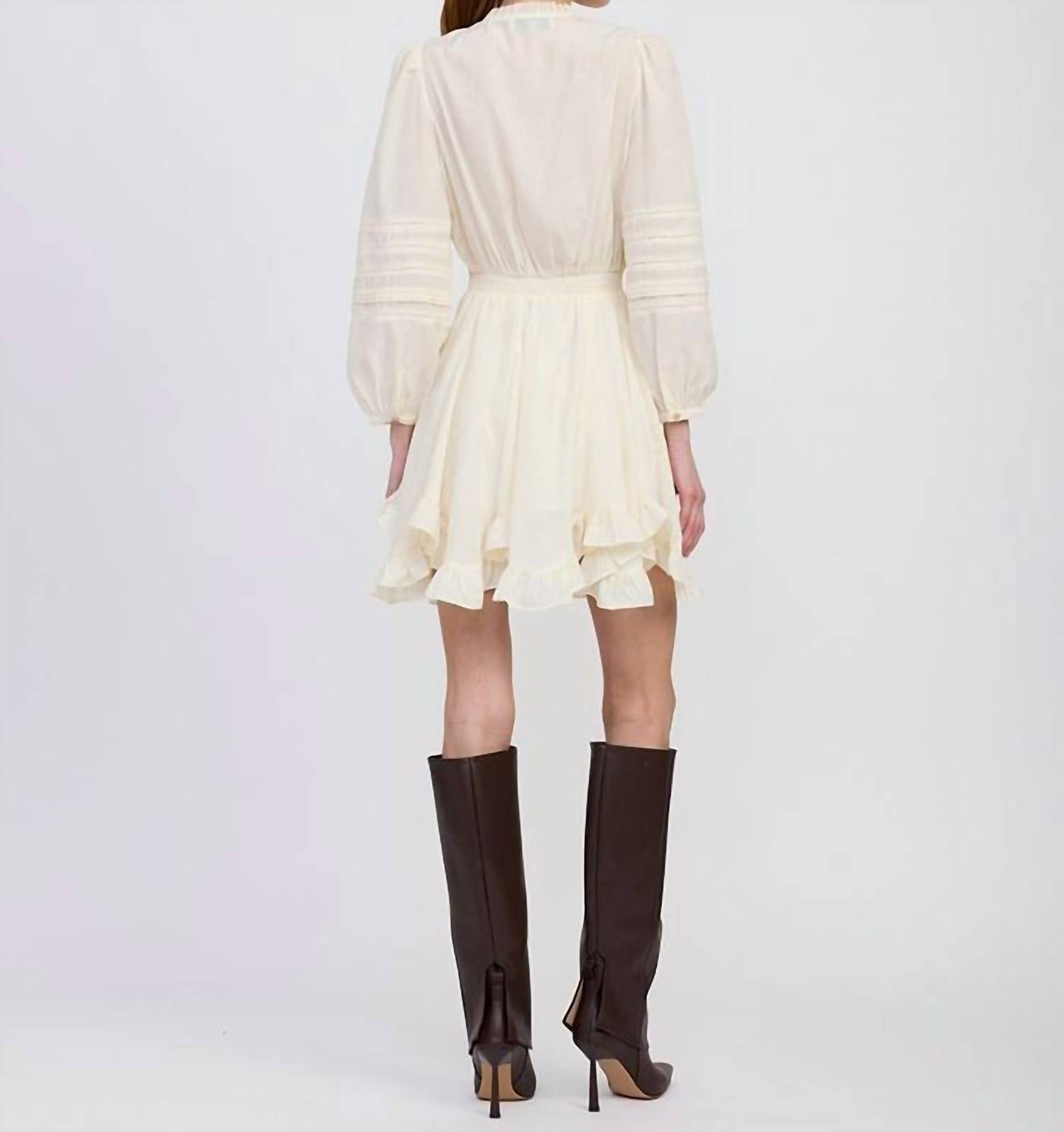 The kind of easy and flattering dress you'll be reaching for all season long. Introducing the Gabriella Dress by En Saison, a chic choice for evening events with its playful ruffled godet hem and mockneck design. This ivory mini dress features long sleeves and a textured pattern with chevron trim and pintuck detailing for an effortlessly cool look. Crafted from 100% polyester, it ensures lightweight comfort, complete with a cotton trim for added texture. Closure: Button closure. Country: Import. Care instructions: Hand wash and line dry. Model is wearing a size small, true to size.