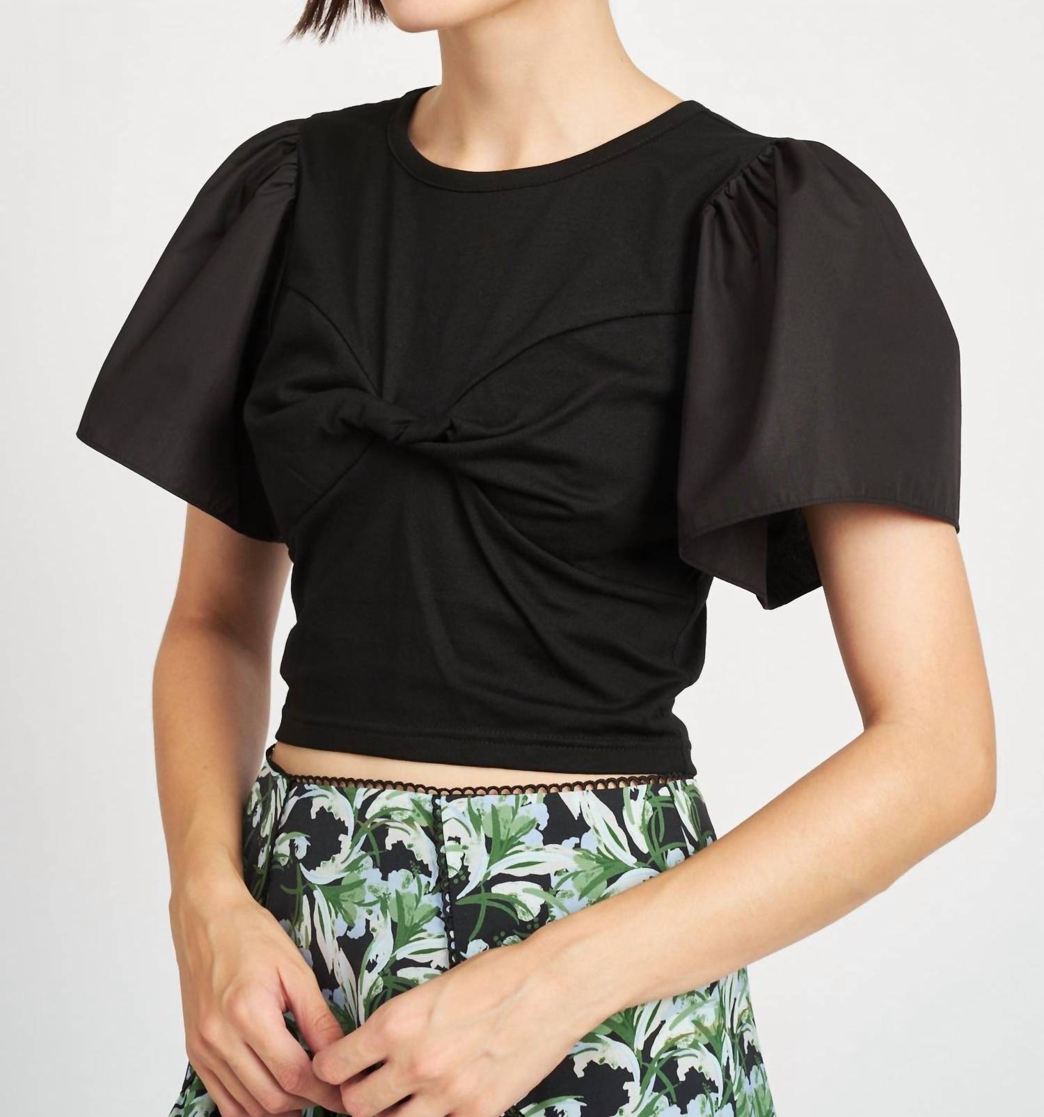 This classic, short sleeve tee will be your go-to staple this season and beyond. The Iona Twist Front Tee by En Saison is a stylish minimalist piece perfect for your spring wardrobe. Crafted in 100% cotton with a contrasting blend of 35% cotton and 65% polyester, this short-sleeve tee features flutter sleeves and a unique twist front bust in classic black. With a cropped length and pull-on closure, it is both trendy and comfortable. For care, wash this solid wonder by hand and line dry. Model wears a size XS (5’4” height, 32C bust, 24” waist, 31” hips).