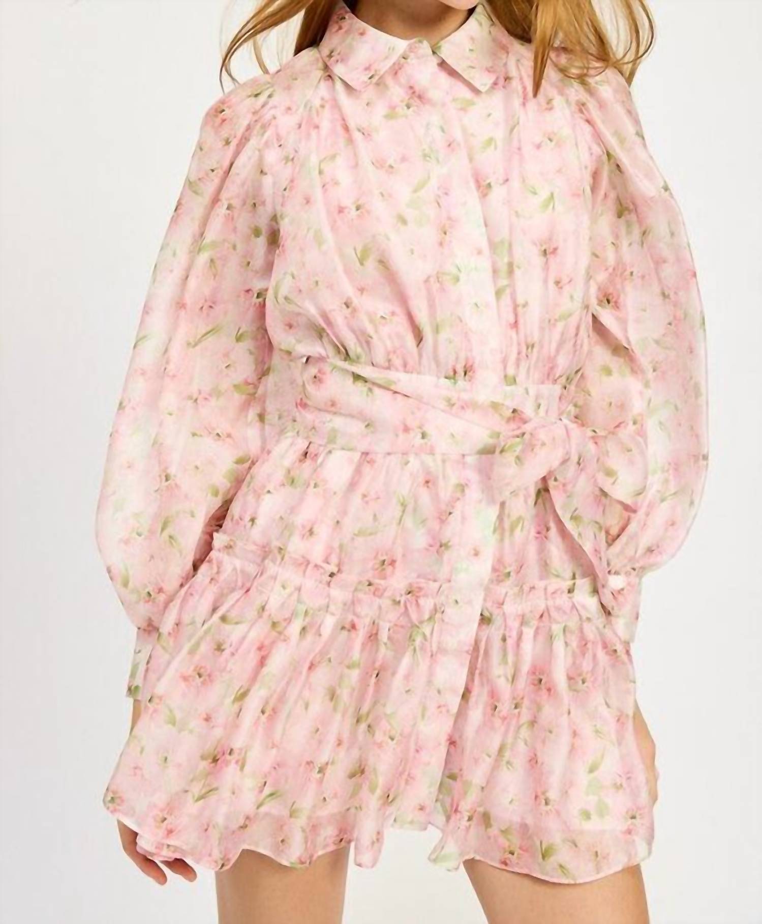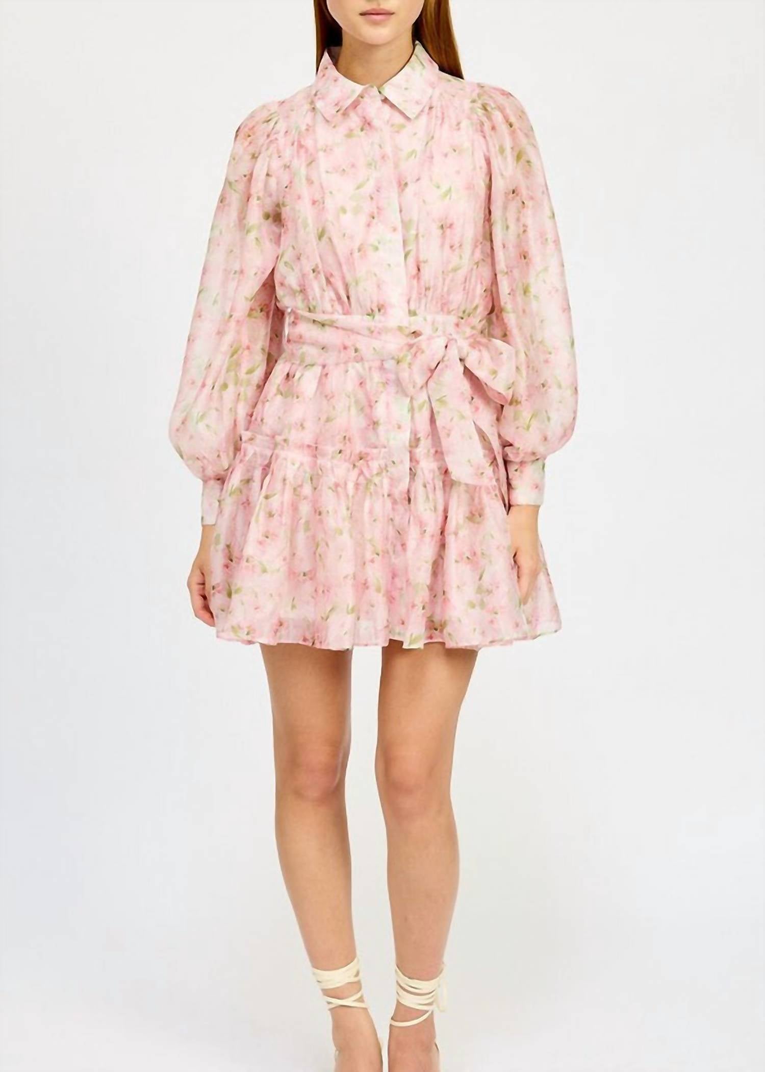 The perfect mini dress for those warmer months. Introducing the Josette Long Sleeve Mini Dress by En Saison, a charming addition to your wardrobe with its pink floral print and playful A-line silhouette. Crafted from 100% polyester chiffon, this dress features long sleeves and a button closure for an effortlessly elegant look. The adjustable belt tie ensures a flattering fit, while the collared neckline adds a touch of sophistication. Care is a breeze with hand wash and line dry instructions, perfect for your summer vacations or Valentine's Day celebrations.