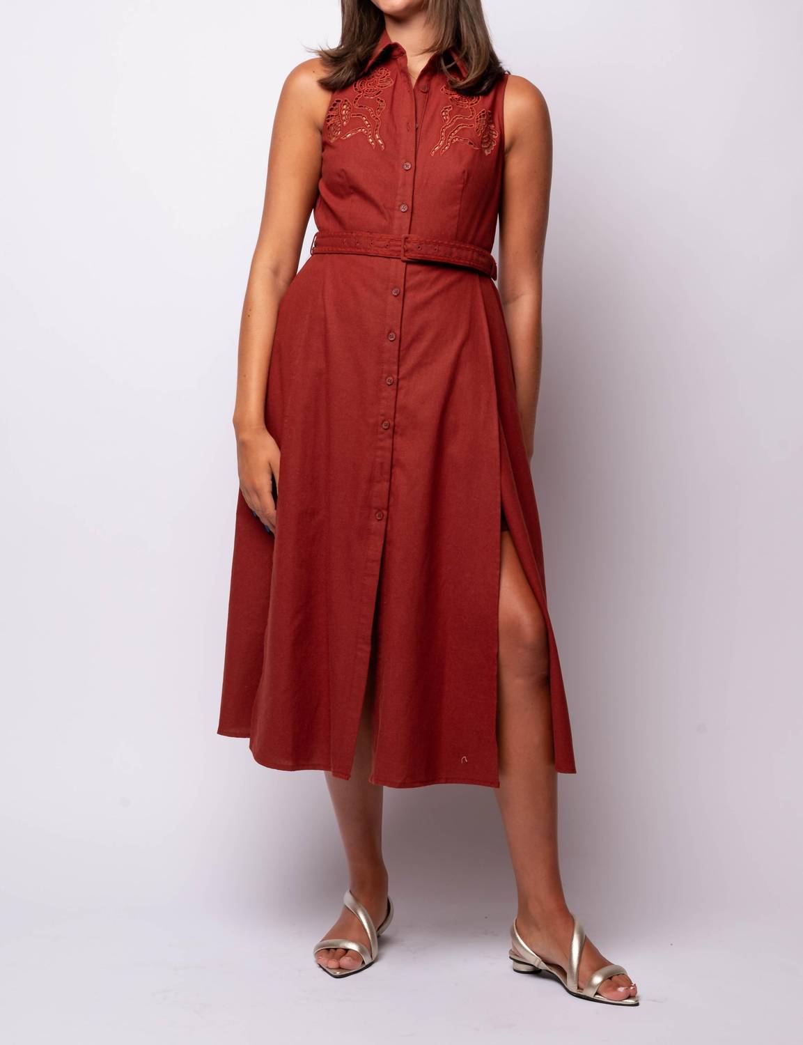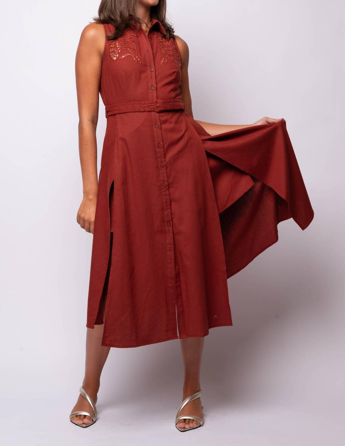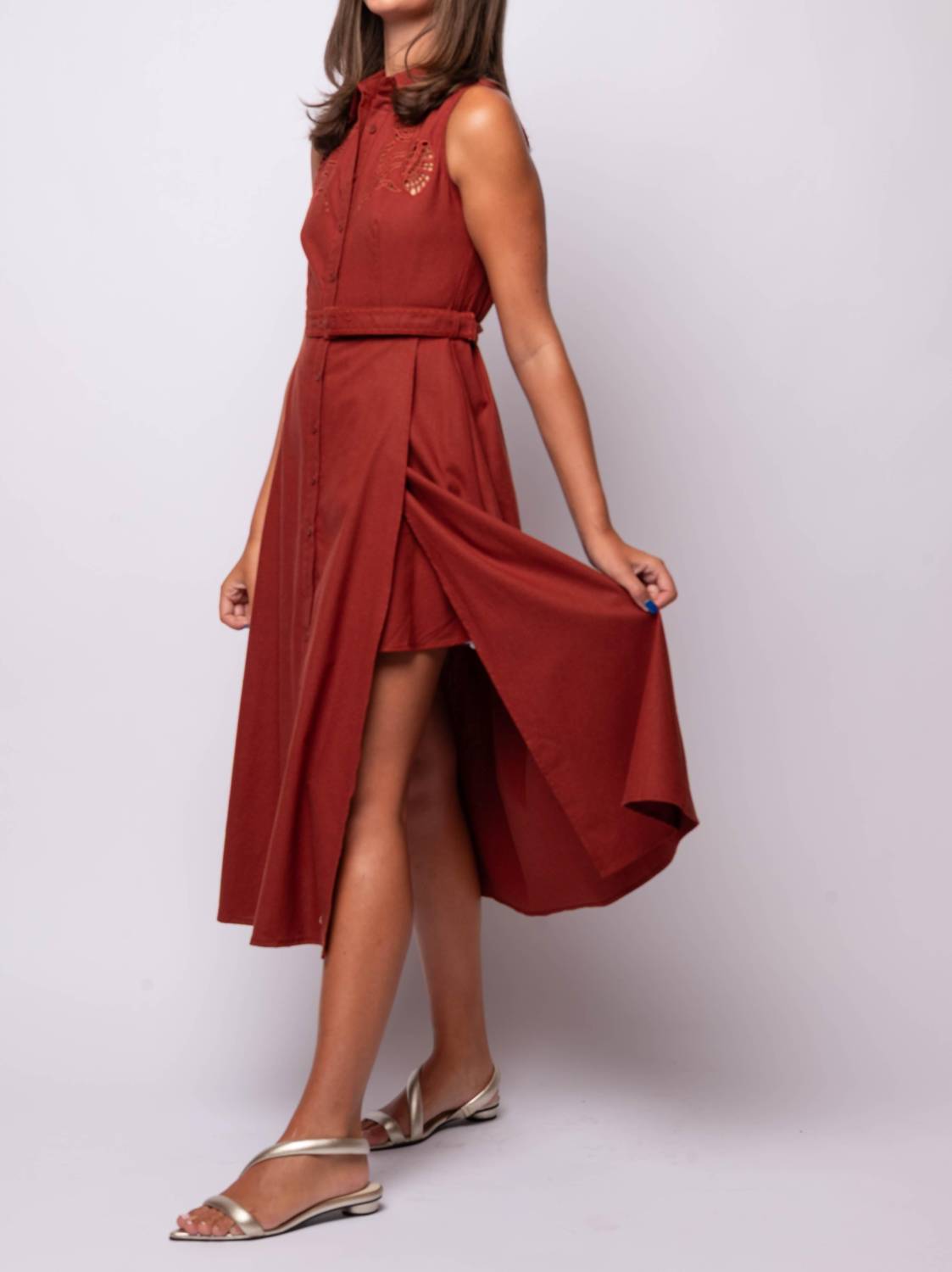 Just add slides or mules and you are good to go. Discover the Megumi Dress by En Saison, an elegant blend of structure and softness in a chic brick hue. This sleeveless midi dress crafted from a 55% Cotton and 45% Linen blend showcases a delicate floral embroidery at the chest and offers a flattering A-line silhouette with a button closure and a matching waist belt. Manufactured with precision, it brings minimalist sophistication to your summer vacation wardrobe. With an emphasis on care, hand wash cold and line dry to maintain its textured charm. Model Addy Grace wears a small, perfectly showcasing this true-to-size piece (5'9" height, 32" bust, 27" waist, 34" hips).