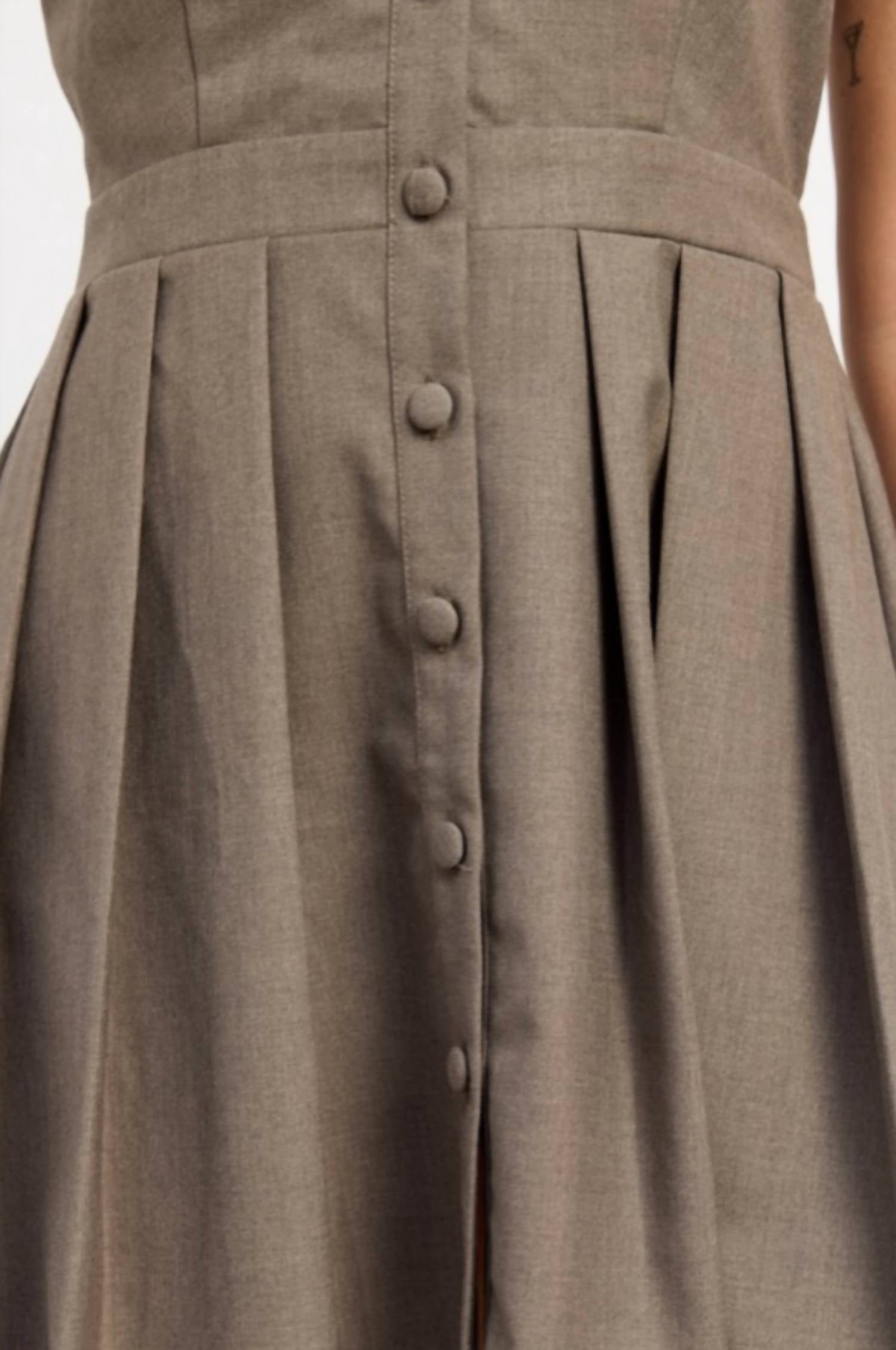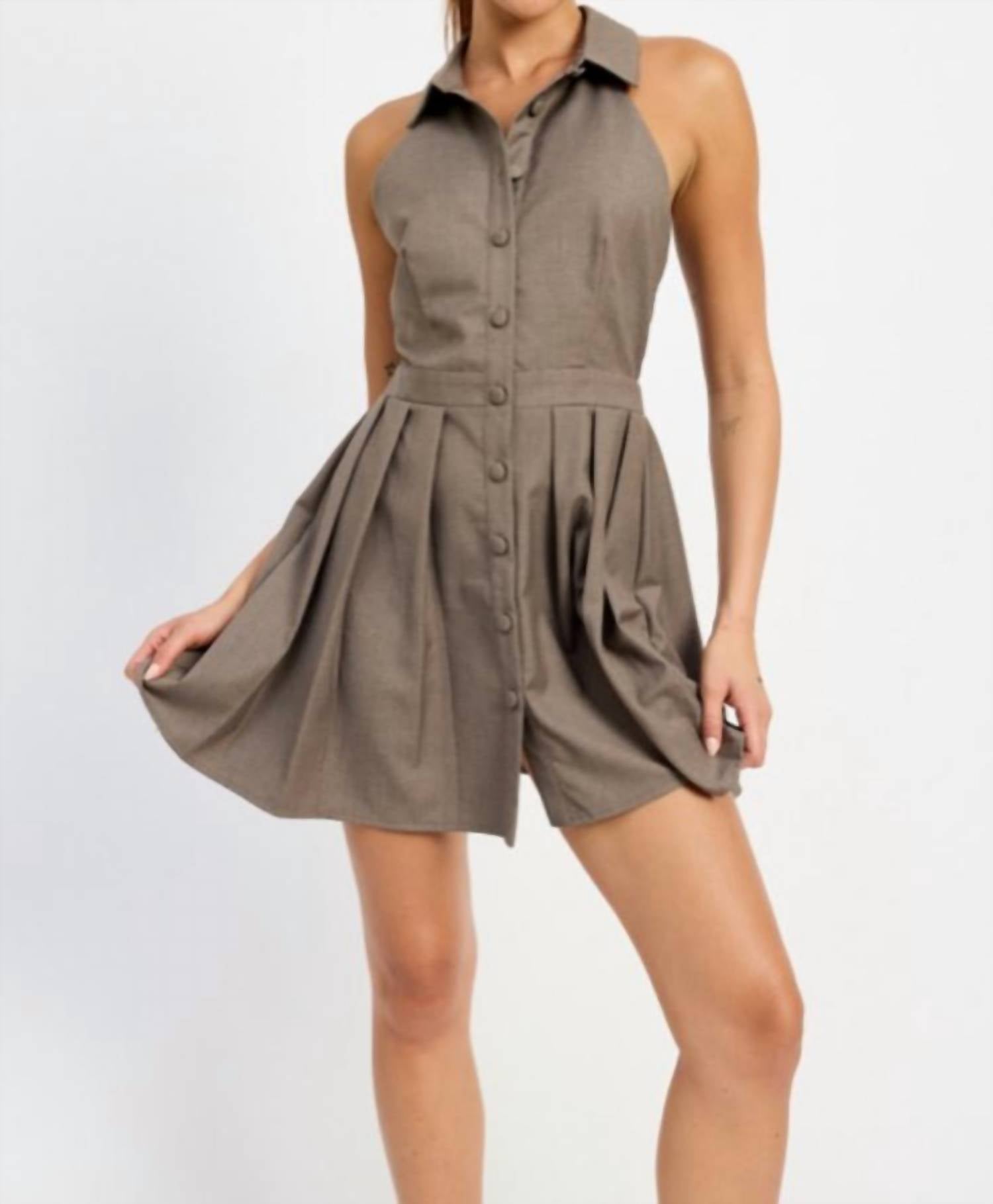 The perfect mini dress for those warmer months. Elevate your summer wardrobe with the Mirabella Mini Dress by En Saison in a chic Toast color. This sleeveless A-line dress features a pleated skirt and a stylish halter collared neckline. Composition: 80% Polyester, 20% Rayon. Closure: Button closure. Care: Machine wash, line dry. Perfect for vacations or a summer celebration.