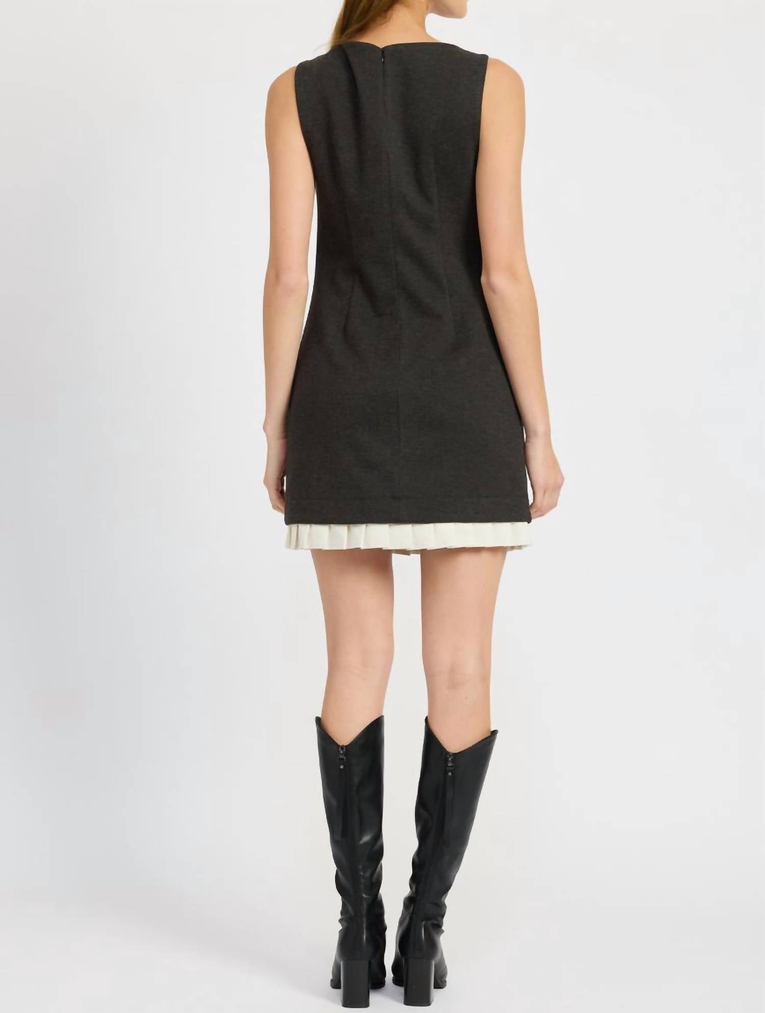 A short and breezy dress for those warmer days. Meet the Octavia Mini Dress by En Saison, the epitome of Quiet Luxury for your next dinner party. This sleeveless sheath dress in dark grey features a sophisticated boatneck and convenient zip closure. Designed specifically for women, the dress offers a solid pattern with the additional functionality of pockets. Effortlessly crafted for the fall season, this mini dress is a perfect addition to your wardrobe essentials.