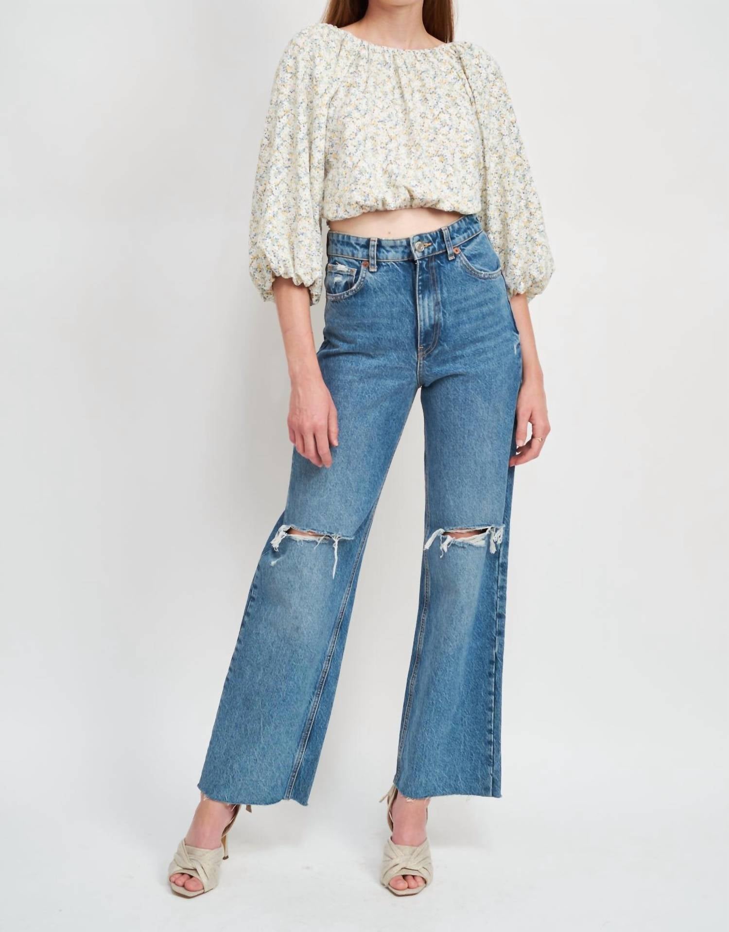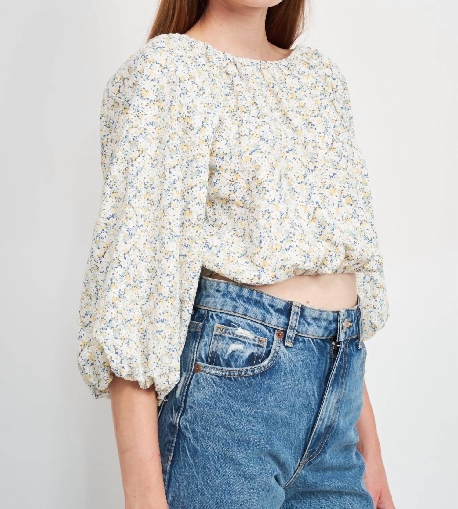 A versatile blouse that works from desk to dinner! The Orielle Floral Top by En Saison is a chic addition to your wardrobe, perfect for a spring vacation. It features three-quarter puff sleeves and a cropped length, with a stylish tie closure in the back for a flattering fit. Crafted from 100% Polyester with a 100% Cotton lining, this non-stretch blouse showcases a vibrant floral pattern. Care for this imported item by hand washing and line drying. Model is wearing a size XS (Height 5’4”, Bust 32C, Waist 24”, Hips 31”).