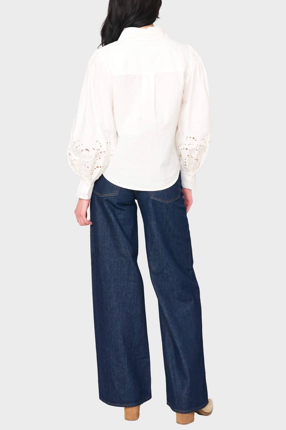 A classic button down shirt that will never go out of style. Introducing the En Saison Quinton Shirt, a stylish button-down in elegant ivory crafted for any occasion. This blouse offers long blouson sleeves with buttoned cuffs and intricate eyelet embroidery on the sleeves and collar. Made from 100% cotton, it features a button front placket and a shirttail hem, elevating any outfit with a touch of femininity. Care instructions include hand wash and lay flat to dry. Model Jing is 5'3" and is wearing a size XS.