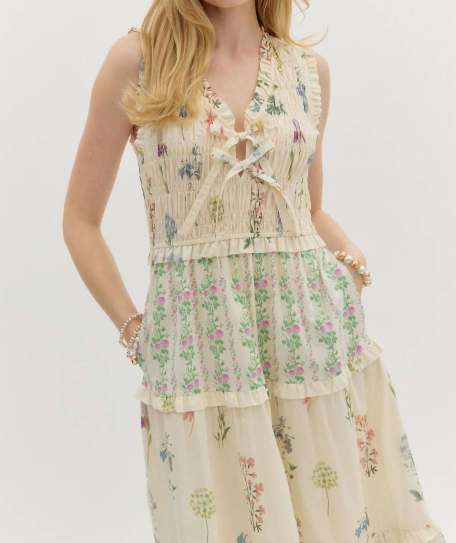 Just add slides or mules and you are good to go. Step into summer with the Tiered Floral Midi Dress by Entro, a perfect blend of boho chic style and comfort. This sleeveless A-line midi dress features a smocked top, multi-floral print, and ruffle accents, complete with handy side pockets for added convenience. Composition: 100% Cotton. Closure: V-neck with a charming bow tie closure. Care: Machine wash.