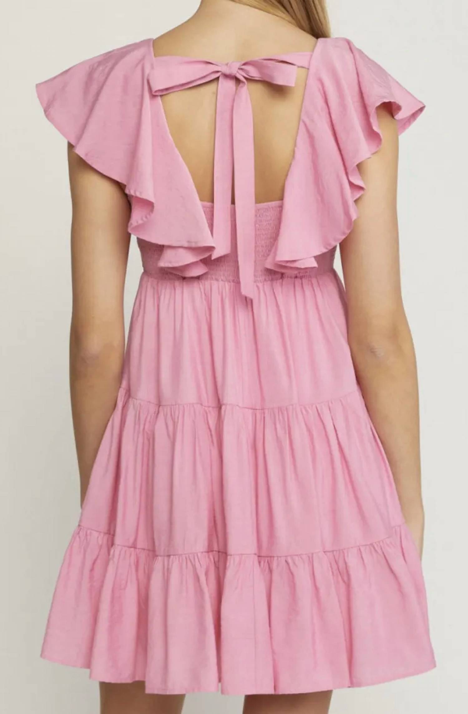 A short and breezy dress for those warmer days. Discover the Entro Tie-back Dress in pink, perfect for your summer vacations. Crafted with cap butterfly sleeves and an empire waist silhouette, this mini dress features a v-neck and an open back with a self-tie closure for added style. It comes with practical side pockets and is fully lined for comfort. Care instructions include hand washing and line drying to maintain its minimalist appeal.