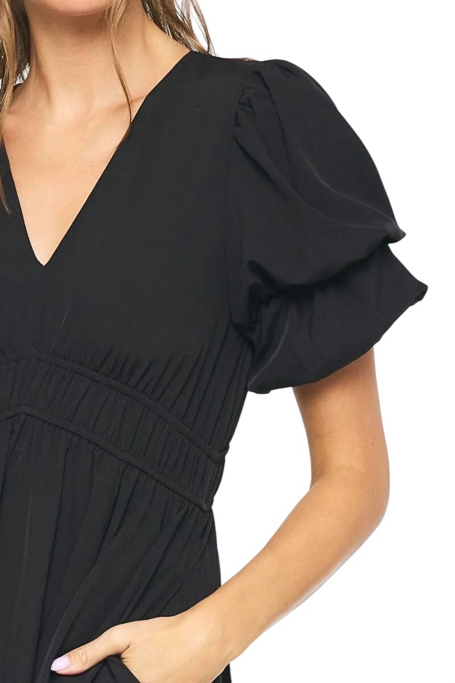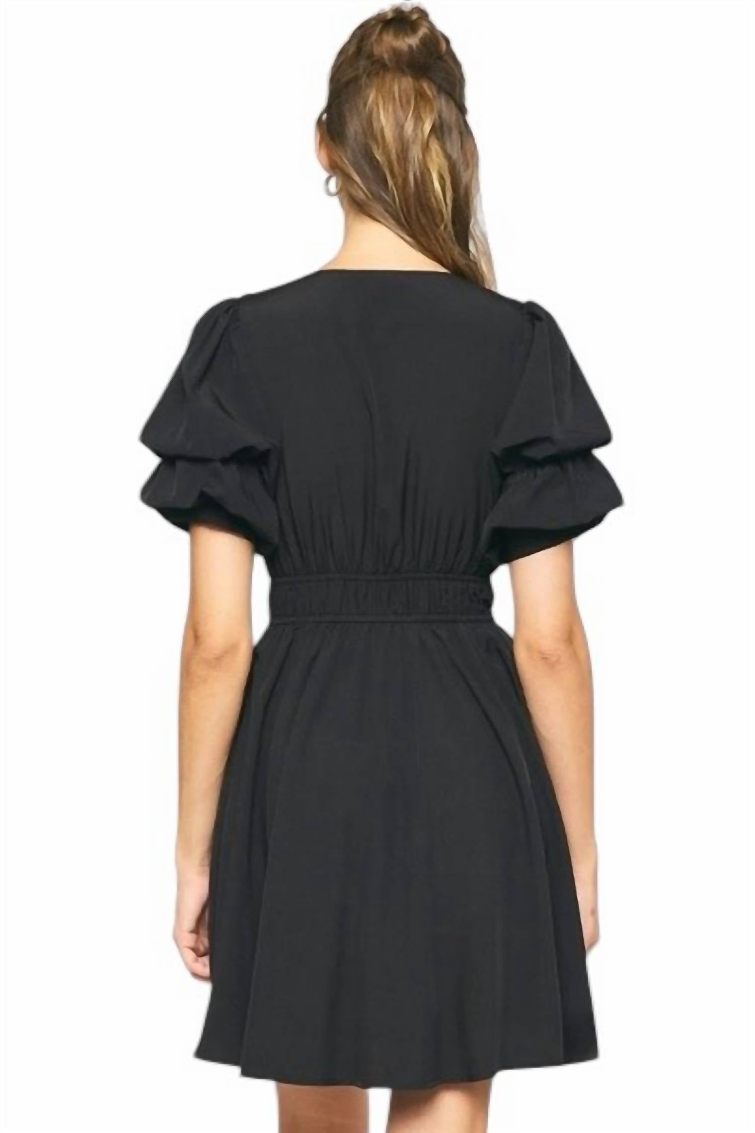 The kind of easy and flattering dress you'll be reaching for all season long. Featuring short sleeves with unique tiered puff details, this dress makes a statement with a flattering solid V-neck and elastic waistband for ease of movement. Made from 95% polyester and 5% spandex with a 100% polyester lining, it is both stylish and practical. Originating from an imported source, this pull-on dress should be hand washed cold and line dried for optimal care.
