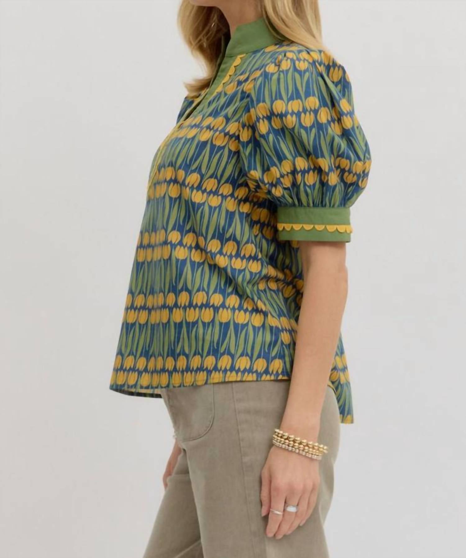 A versatile blouse that works from desk to dinner! Introducing the Scalloped Trim Golden Tulip Top by Entro, a stylish piece perfect for adding a touch of retro charm to your wardrobe. Featuring short puff sleeves and a pull-on closure, this blouse is crafted with a patterned, golden yellow tulip print on a navy base, accented with scalloped green trims. Country of Origin: Not specified. Care: Machine wash. Available in sizes with bust measurements—small: 38", medium: 40", large: 42"—and length measurements—small: 18", medium: 19", large: 20".