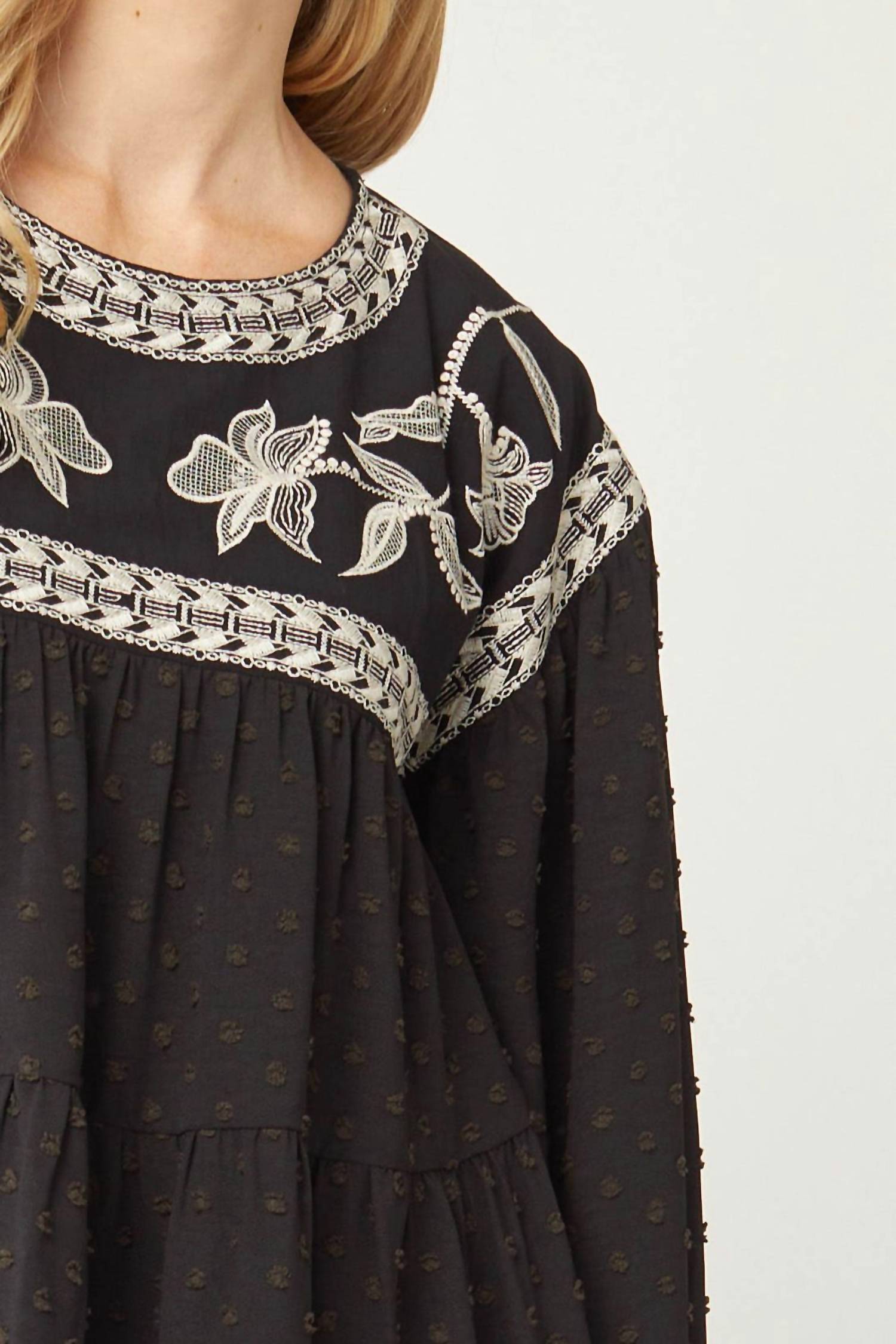 A timeless blouse that will never go out of style. Introduce effortless boho-chic charm to your wardrobe with the Entro Embroidered Swiss Dot Blouse. This black blouse showcases long sleeves with elastic at the wrist and intricate embroidered detailing, paired with a swiss dot pattern and a tiered bodice. Crafted from 100% polyester, it features an a-line silhouette with a ruffled hem and measures 26" in length across various sizes. With a button closure and crewneck design, care for this piece with a hand wash or dry clean for lasting elegance.