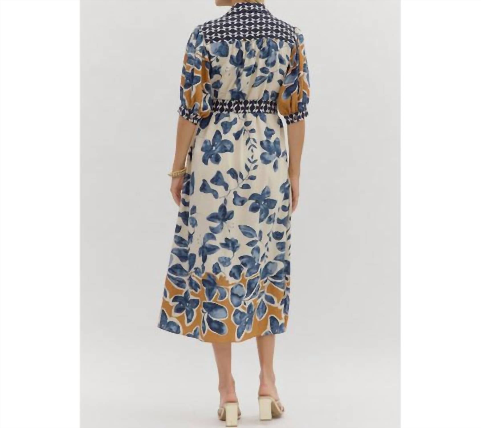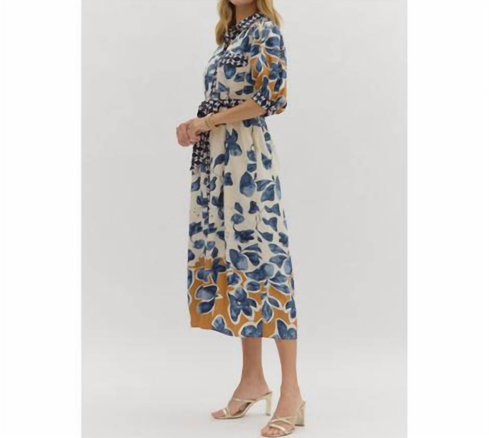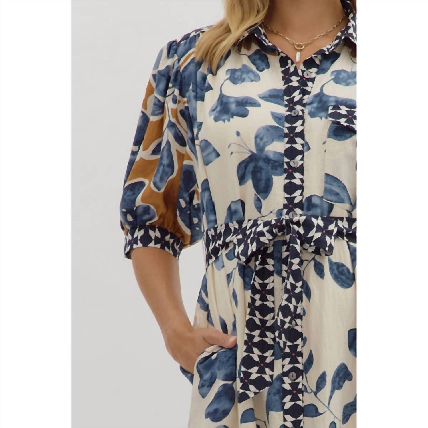 A midi dress so versatile, your options for wearing it are endless. Enhance your summer wardrobe with the Entro Botanical Print Three Quarter Sleeve Midi Shirt Dress in Blue Multi, an effortlessly chic choice for any occasion. Crafted from 85% Rayon and 15% Polyester, this elegant dress features a button-front design, three-quarter sleeves, and a flattering midi length complete with an abstract contrast band collar. The dress offers a removable belt for an adjustable fit and practical side pockets for added convenience. Fully lined with 100% cotton, it is non-sheer and lightweight, ensuring comfort all day. Care: Hand wash cold, line dry. Back Length: 49".