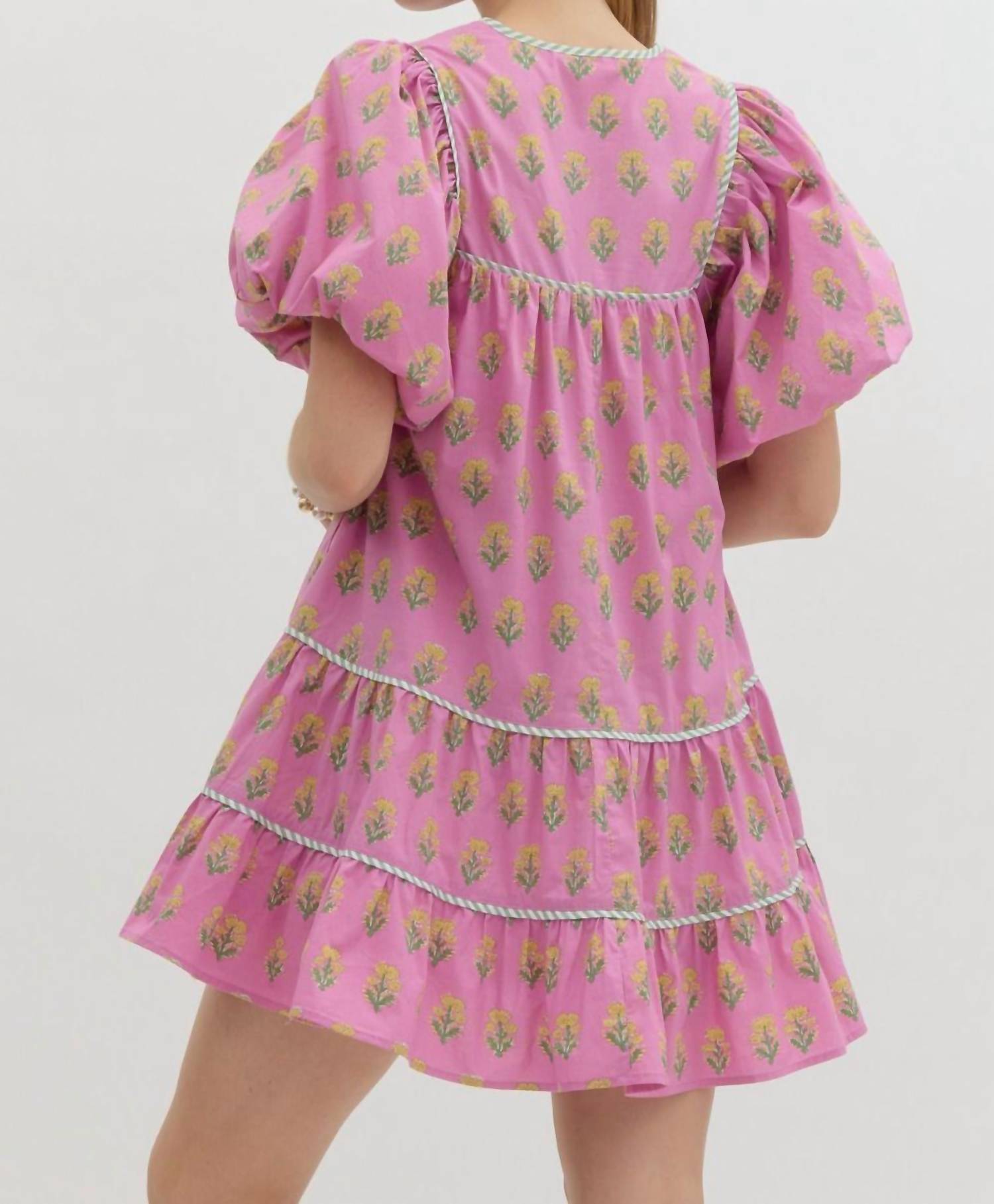 Pair with your favorite sandals for an effortlessly chic look. Embrace boho chic style with the Floral Print Split Neck Dress by Entro, perfect for a vibrant summer look. Featuring a shift silhouette with a split v-neckline and short sleeves, this pink mini dress showcases a delightful floral pattern with contrasting striped trim detail at the seams. Pockets at the side add functionality to this lightweight, woven piece. Closure: Pull on. Bust measurements: small 38", medium 40”, large 42".