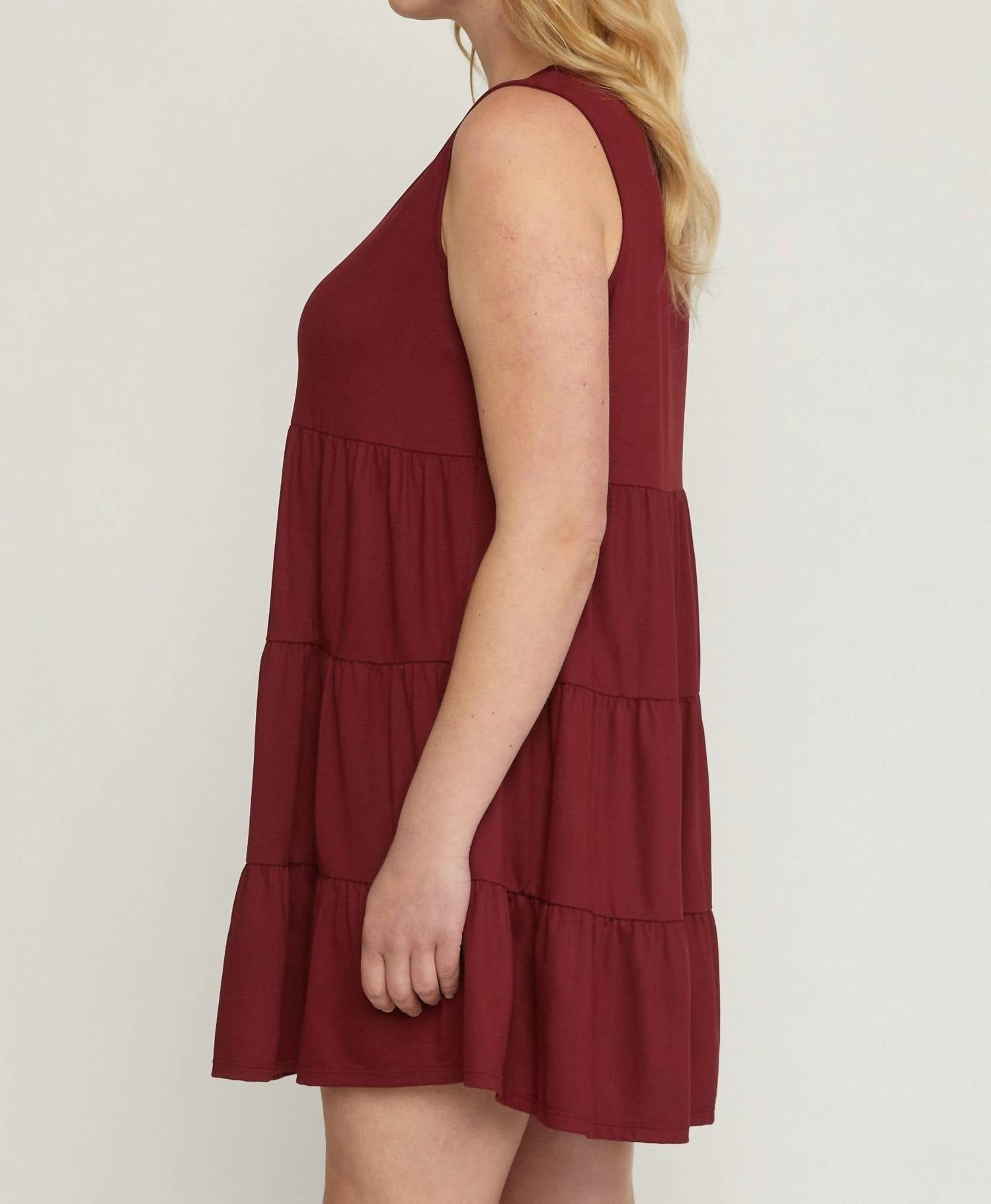 The perfect mini dress for those warmer months. Introducing the Ruffle Tiered Short Dress by Entro, a delightful addition in a rich wine hue. This sleeveless dress, crafted from 96% Polyester and 4% Spandex, offers a lightweight and stretchy fabric for relaxed wear. With a playful A-line silhouette, the dress features a ruffle tiered bodice and a round neckline, making it an excellent choice for versatile styling. Its pull-on closure and dimensions of Bust 44"-48", Length 38" across sizes ensure a comfortable fit. Care: Hand wash or dry. Model is 5'11" and wears a size XL.