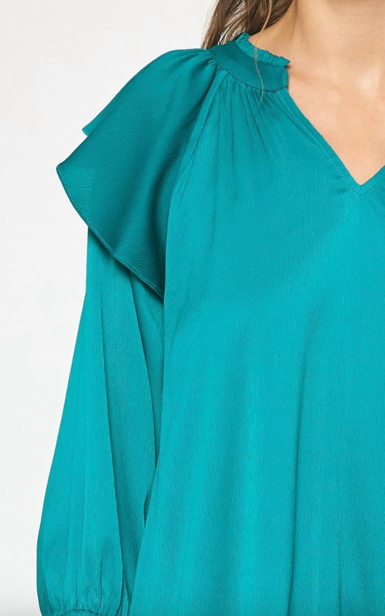 A versatile blouse that works from desk to dinner! Embrace elegance with the Serenity Quarter Sleeve Ruffled Top by Entro in a striking Teal shade. This solid satin blouse features three-quarter sleeves and a charming ruffled overlay at the shoulders, accentuating its V-neck design. Enjoy the woven, lightweight feel of this lined, non-sheer top that is perfect for various occasions. Closure is a convenient pull-on style, and it requires a gentle hand wash to maintain its pristine condition.