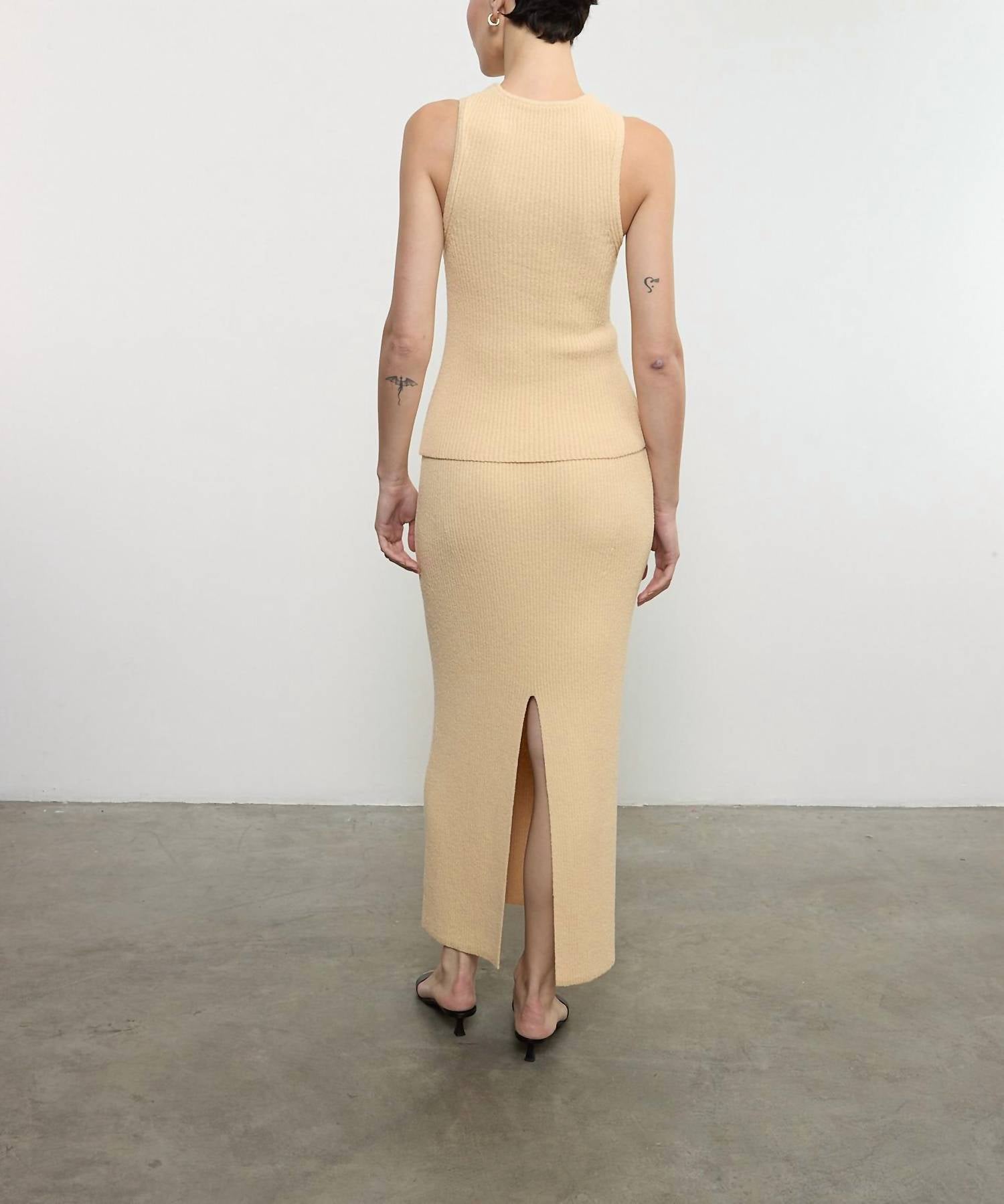 Who doesn't love a good maxi skirt? The ribbed Boucle Knit Skirt features an elasticized waistband and back slit detail for ease of movement.