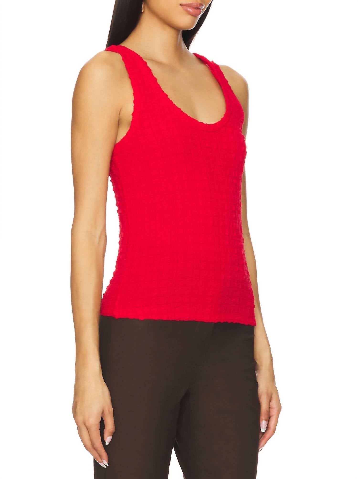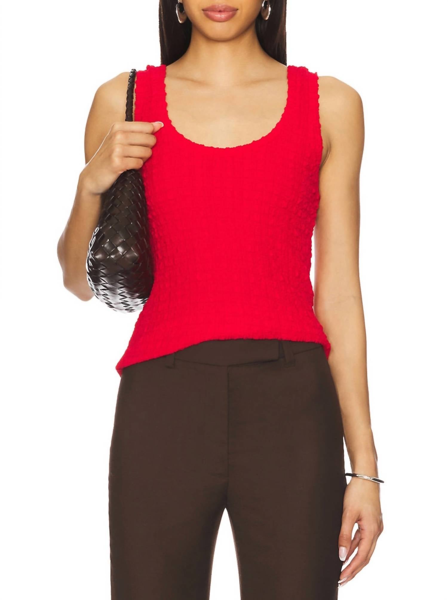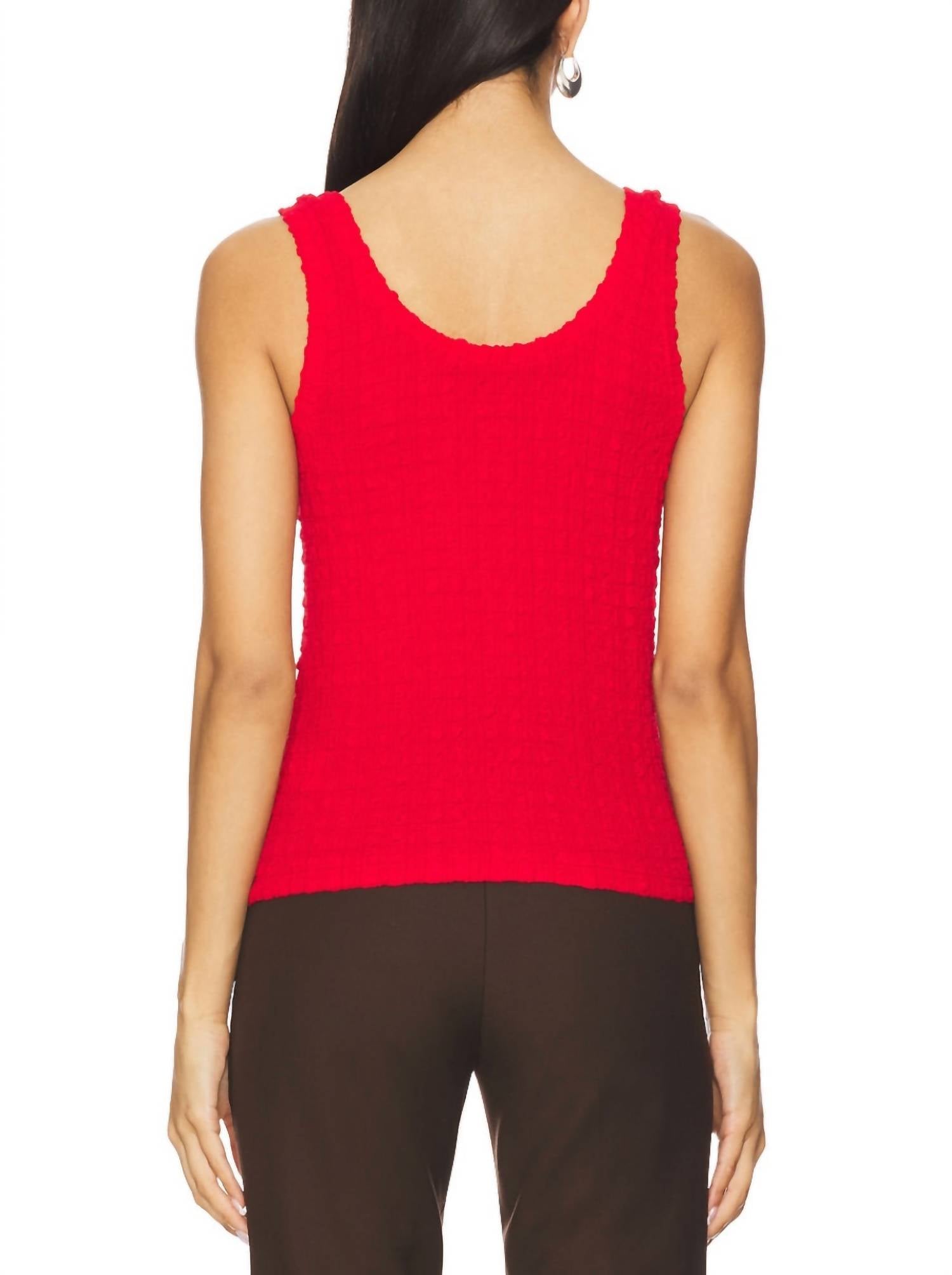 This classic tank top is perfect for layering and cute enough to wear on its own. Presenting the Puckered Tank by Enza Costa, a sleeveless essential in vibrant red designed for an easy fit. Crafted from a blend of 81% Viscose, 16% Polyester, and 3% Spandex, this tank features a unique textured pattern and a scoop neckline. Made in the USA with a pull-on closure for convenience. Care for this stylish piece with a simple machine wash, and enjoy a fit that runs true to size.