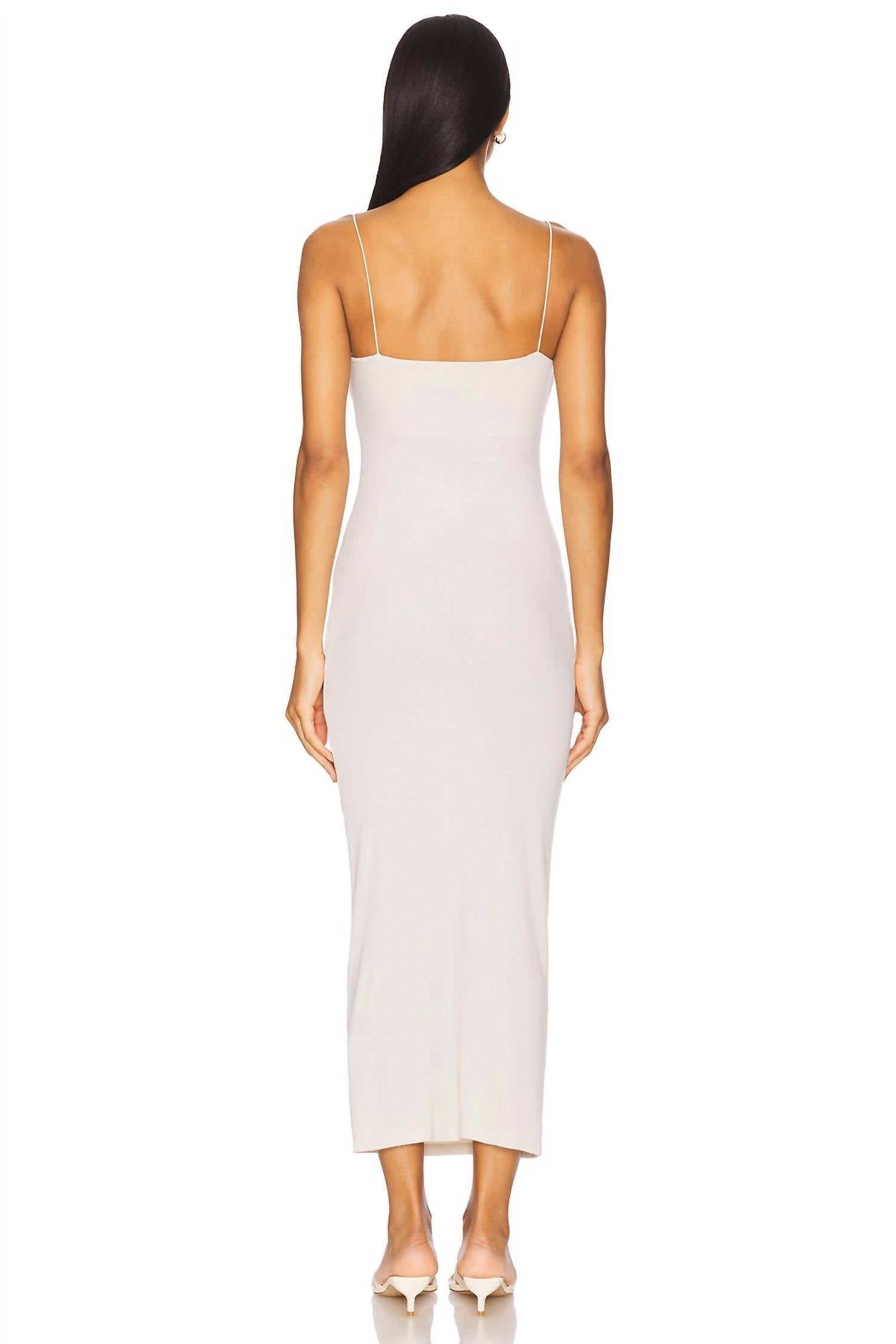 A midi dress so versatile, your options for wearing it are endless. Discover the Silk Knit Essential Strappy Dress by Enza Costa, an effortlessly chic midi dress in a sophisticated Canvas color. It features spaghetti straps, a modern square neckline, and a sleek silhouette, all crafted from a luxurious 10% Silk, 87% Viscose, 3% Lycra blend. Proudly made in the USA, the dress offers a comfortable pull-on closure. Machine wash as needed.