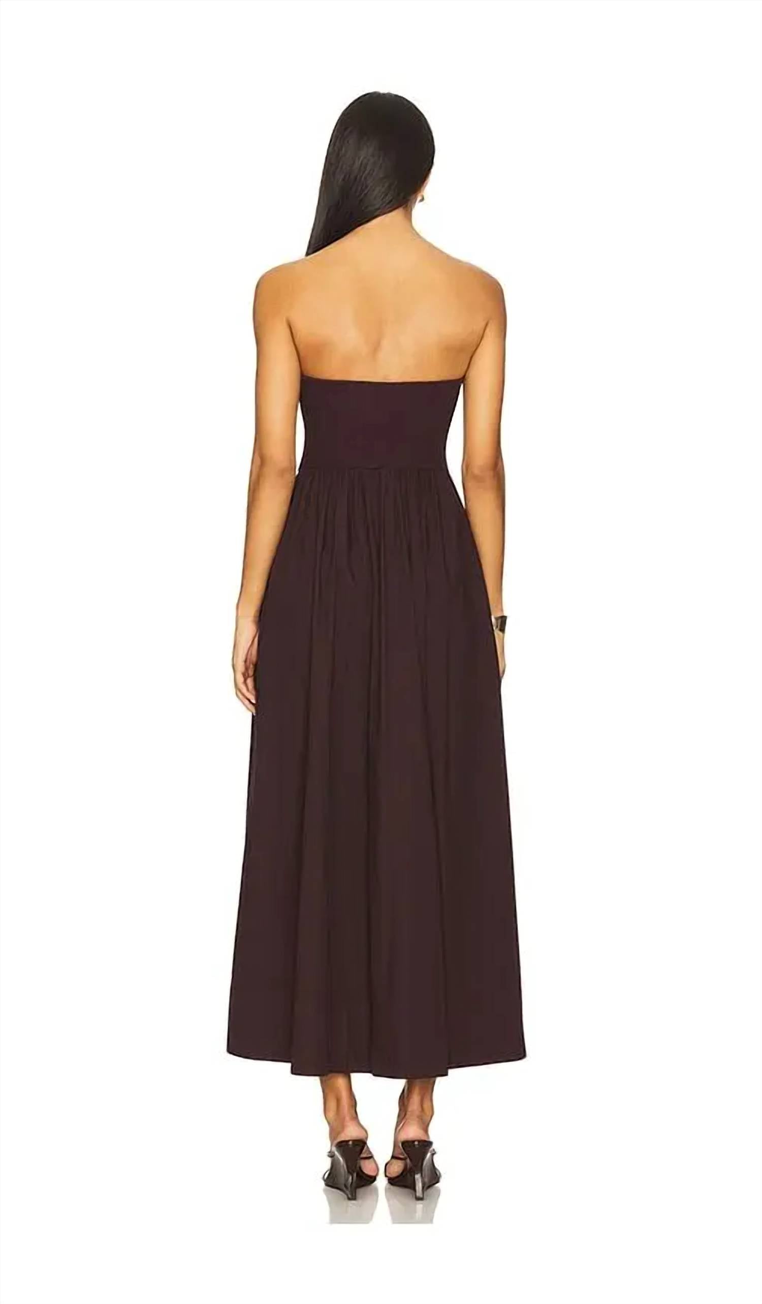 Who doesn't love a good maxi dress? This one you'll be reaching for season after season. Crafted in a rich dark cherry hue, this strapless dress by Enza Costa combines a ribbed knit bodice with a crisp poplin skirt for a modern, minimalist silhouette. Designed with effortless pull-on styling, it features practical side slit pockets, a subtle hem slit, and a flattering unlined structure. Measuring approximately 46 inches from neckline to hem, this dress blends comfort and elevated everyday style with fabrications of 97% cotton and 3% spandex at the top, and 100% cotton at the skirt.